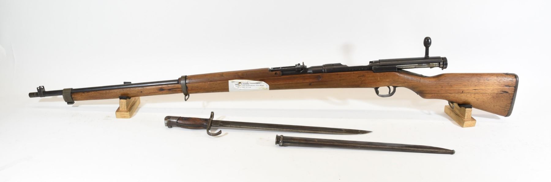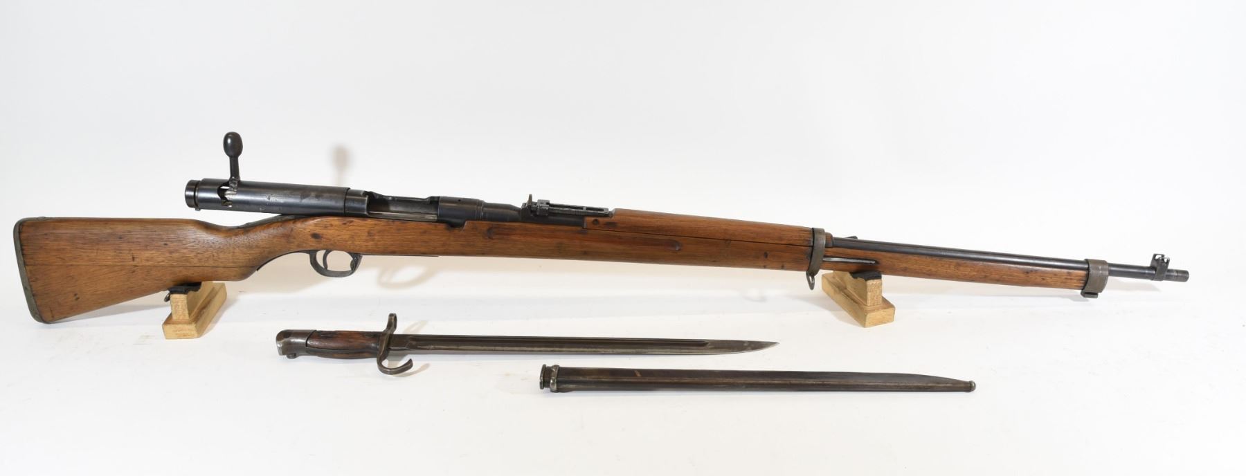 Non-restricted, bolt action, 6.5mm cal, 32" barrel, SN 71602. Wood is fair, Butt stock is 2 pieces laminated together. Bluing is gray with rust spots, bore is good. Has bayonet. Missing cleaning rod.
