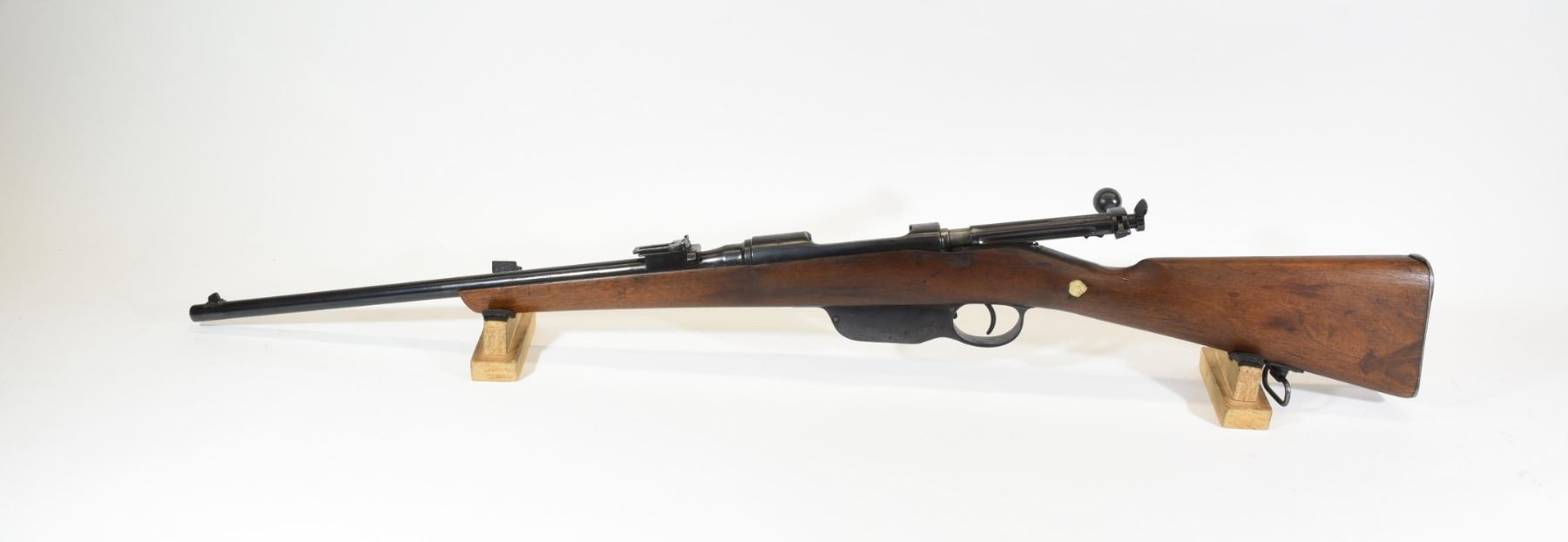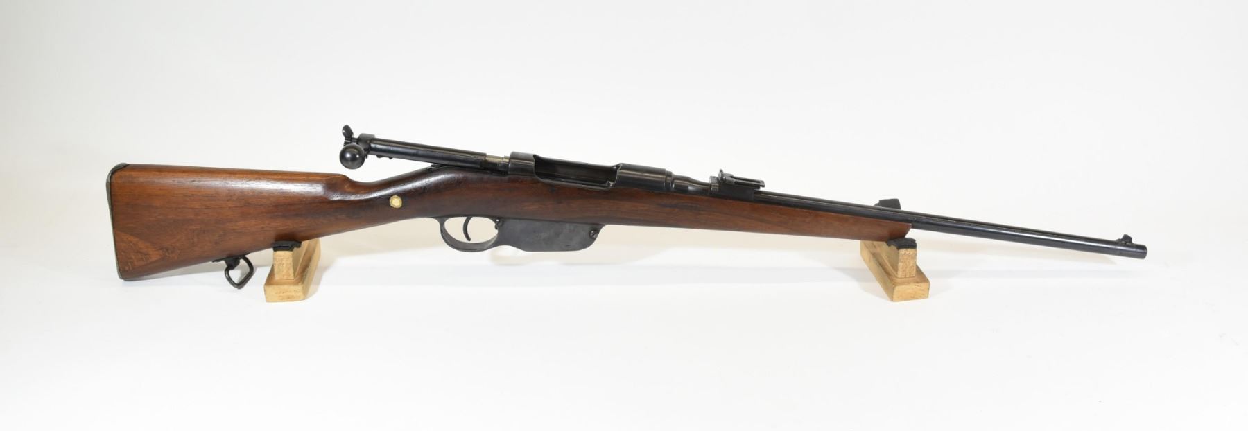 Non-restricted, bolt action, 8mm Mauser, 20" barrel, SN 7806E. Wrist is repaired, bluing has pitting and scratches, bore dark rifling visible.
