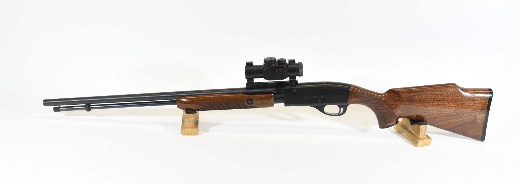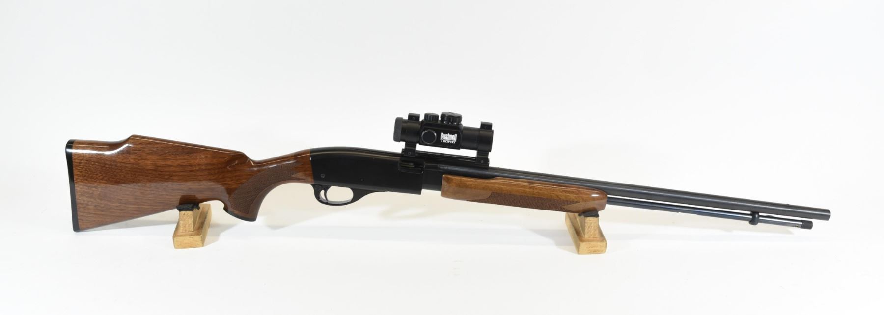 Non-restricted, pump action, 22LR, 22 1/4" barrel, SN B1449676. Wood has a few scratches, bluing and bore excellent.. Comes with Bushnell Trophy red dot scope.
