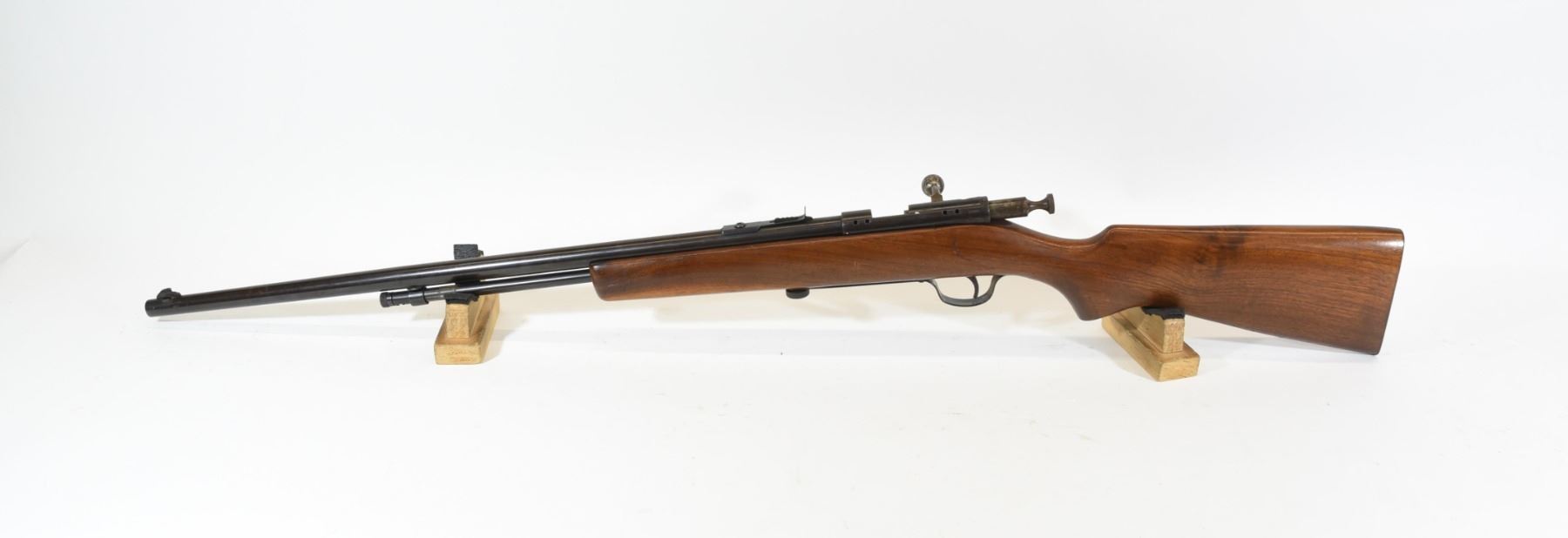 Non-restricted, tube feed. 22 cal, 24" barrel, SN none. Numerous scratches, 2 holes drilled for sling, bluing has turned brown, bore is very good.