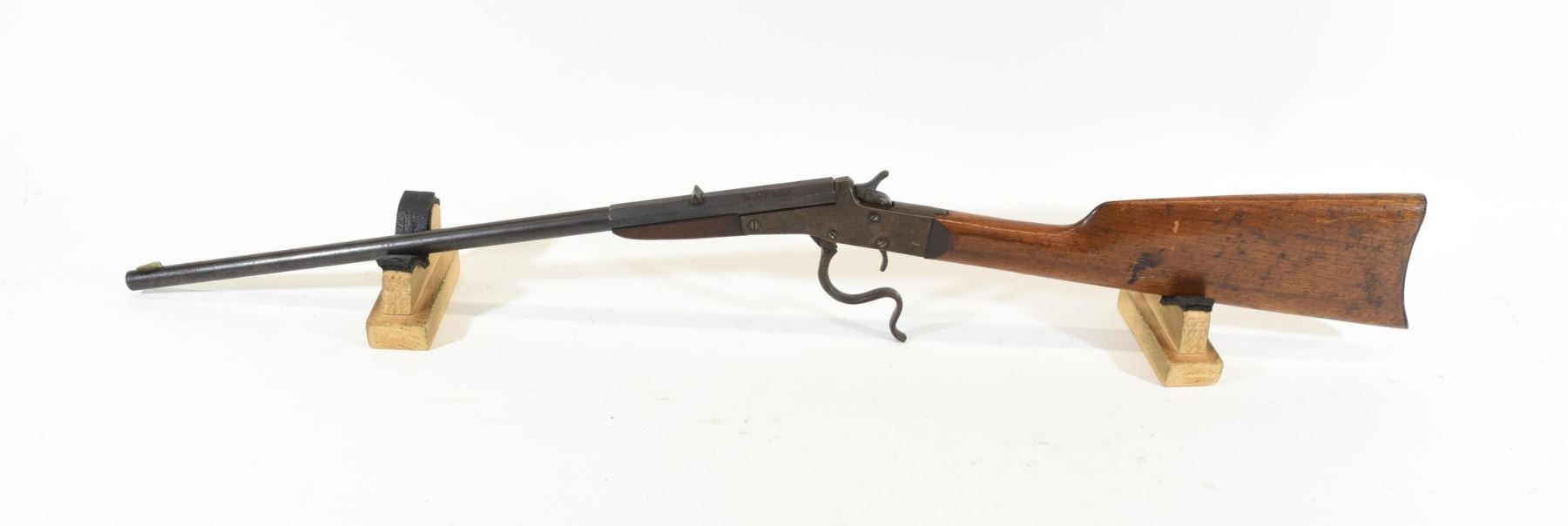Non-restricted, single shot, .22 lr, 18" barrel, SN none. Wood has a number of light marks, bluing brown, bore is pitted rifling is poor, breech will not lock up.
