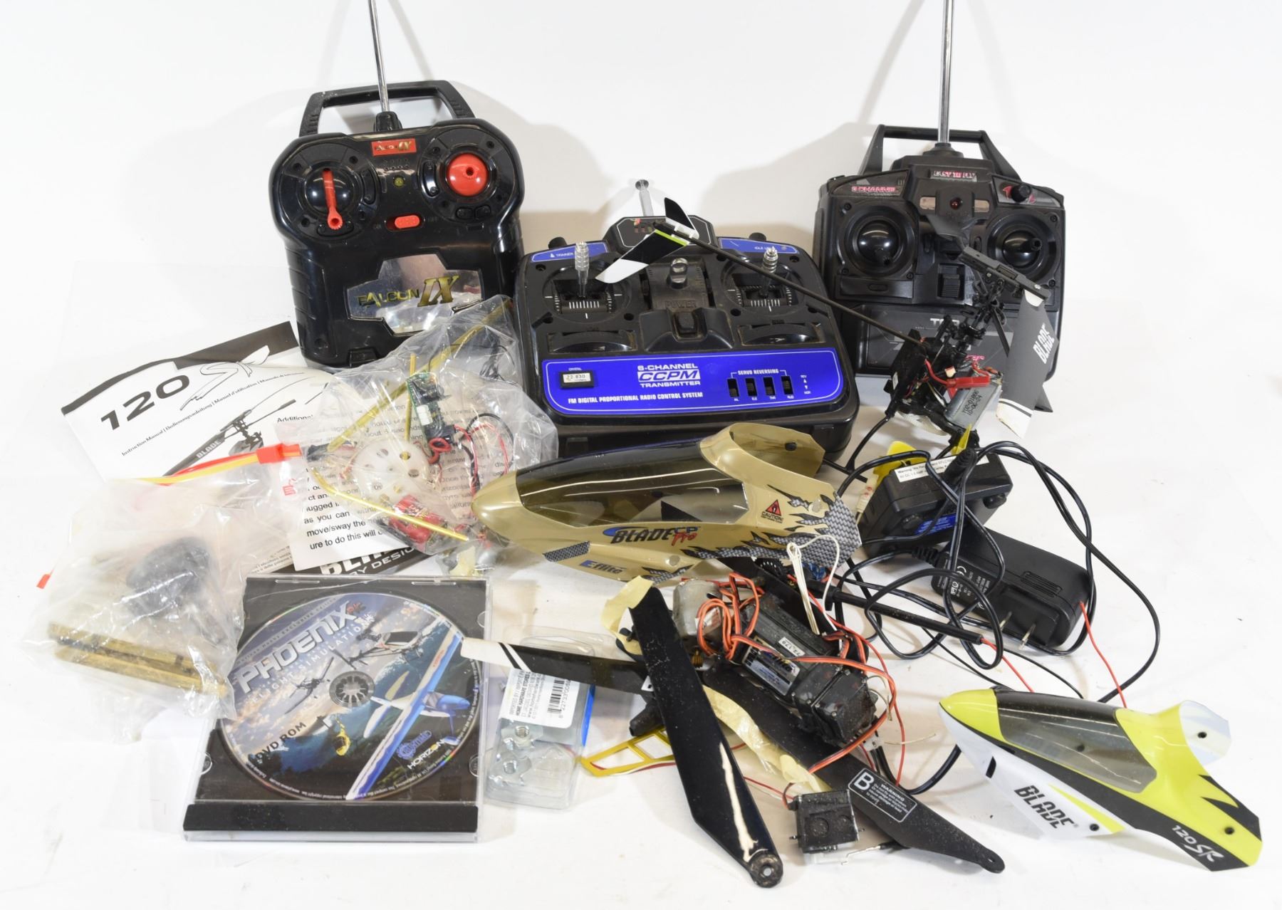 Three controllers, parts from helicopter, motors, variable rate charger.