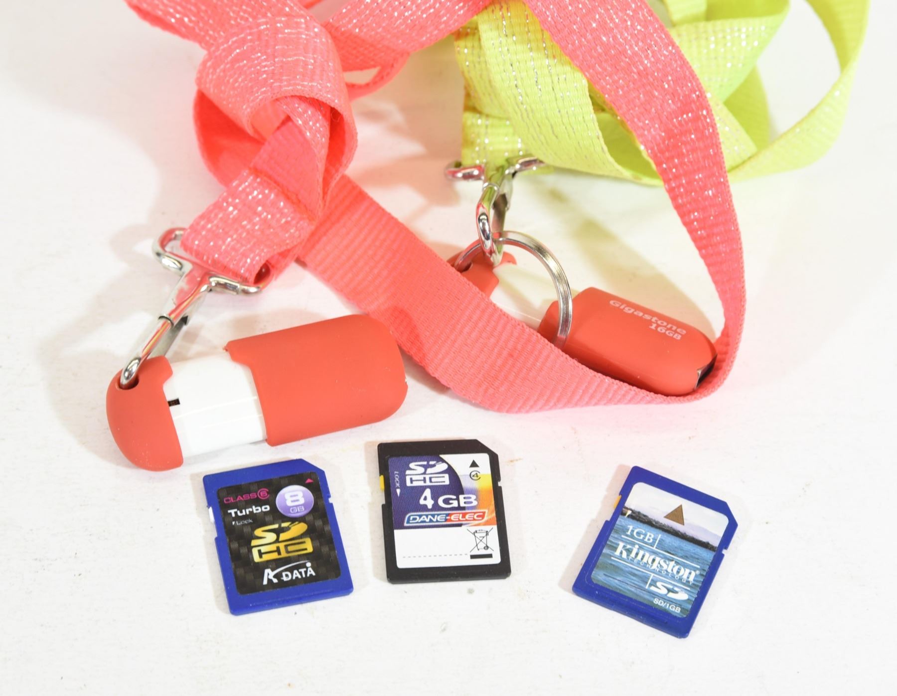SD cards - 1GB, 4GB, 8GB: Memory sticks are 16GB.