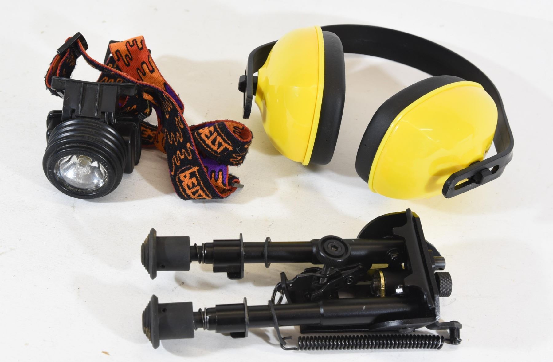 Set of ear muffs hearing protection, 6-9" bi-pod, Petzel head lamp (working).