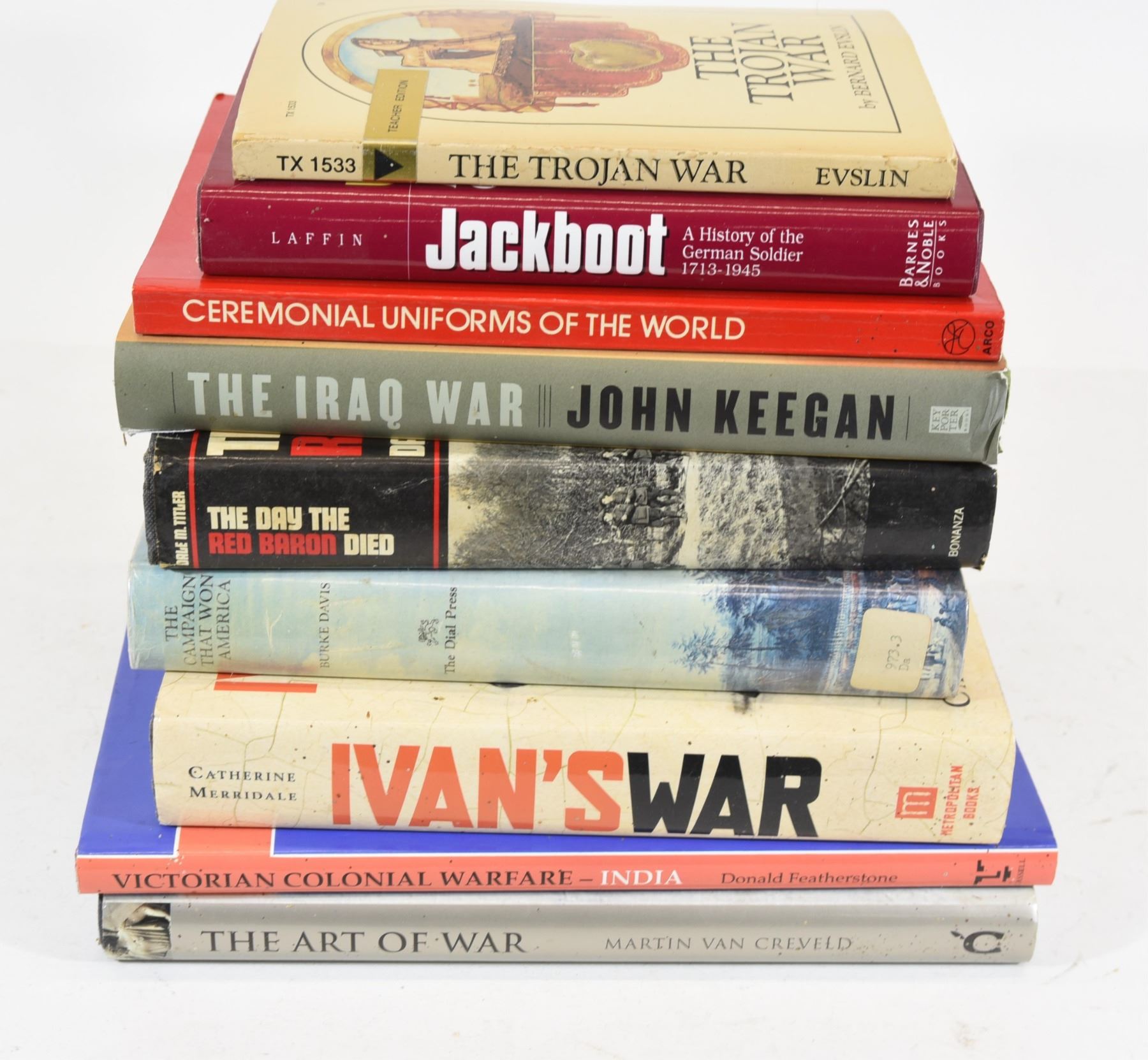 1) Jackboot a History of the German Soldier 1713 - 1945 2) The Iraq War 3) Ceremonial Uniforms of the World 4) The Campaign That Won America 5) The Day the Red Baron Died 6) Ivan's War 7) The Art of War 8) Victorian Colonial Warfare India 9) The Trojan War