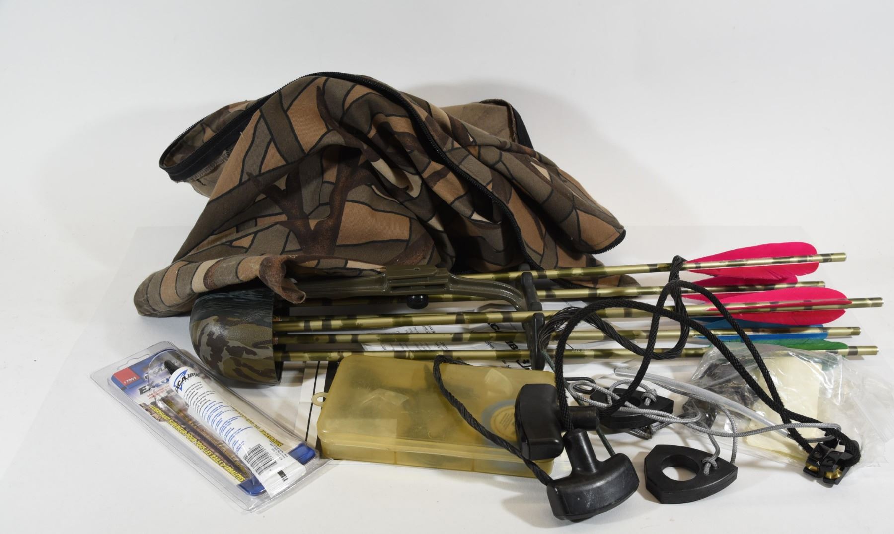 Exocet bow with Excalibur scope, soft case, quiver with 6 bolts & broadheads, cocking aid, stringer, tube of exlube, extra string, container of target tips, wax and allen wrenches and a 2 pin sight.