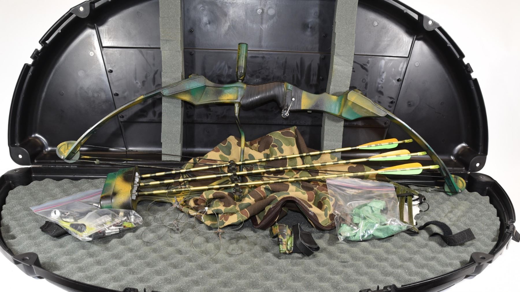 Older PSE, thought to be 60 lb, right handed, home camo paint job. Comes with quiver with 3 arrows and broadheads, finger tab, 2 arm guards, camo soft case, bag of 8 broadheads & 2 game points, bag of field tips & knocks, 3 Snaro bird points, Field locker 54000 hard bow case.