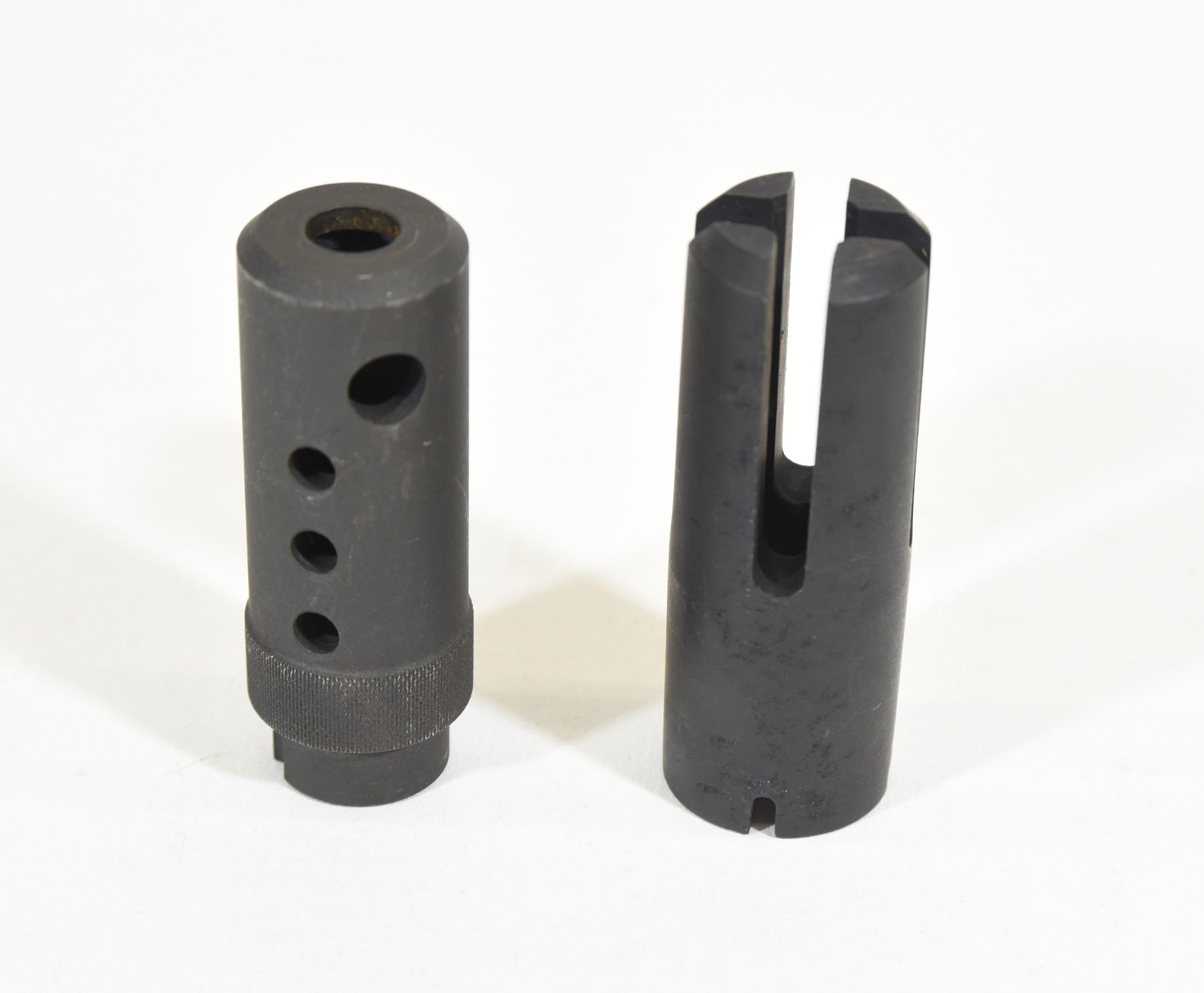 1 slip on/pinned, 1screw on, unknown thread pitch. Both appear to have .370 diameter exit holes.