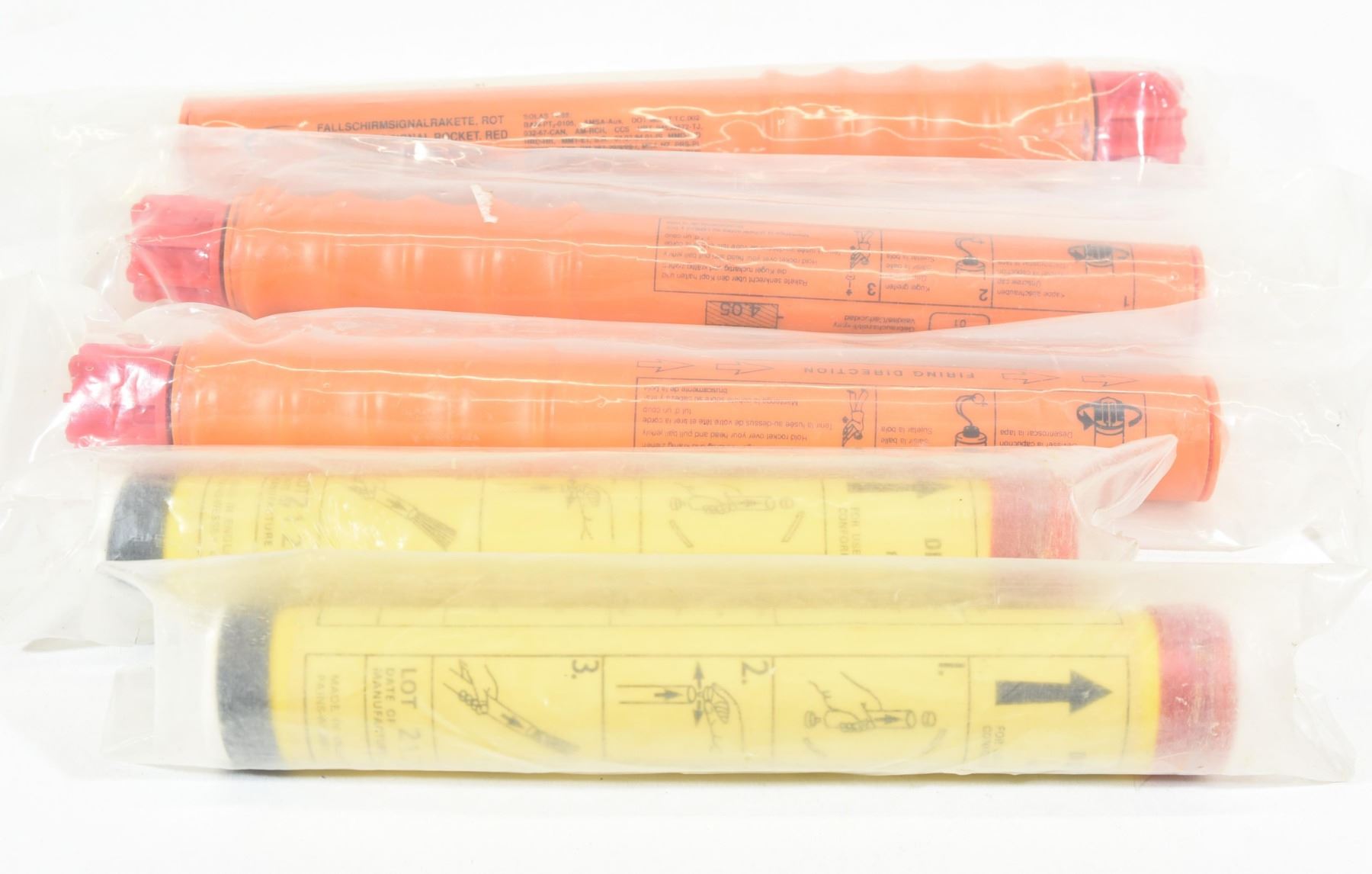 1) 2 Schermuly Pinpoint Distress red hand flares, for use in inflatable liferafts/boats 2) 3 red parachute signal rockets