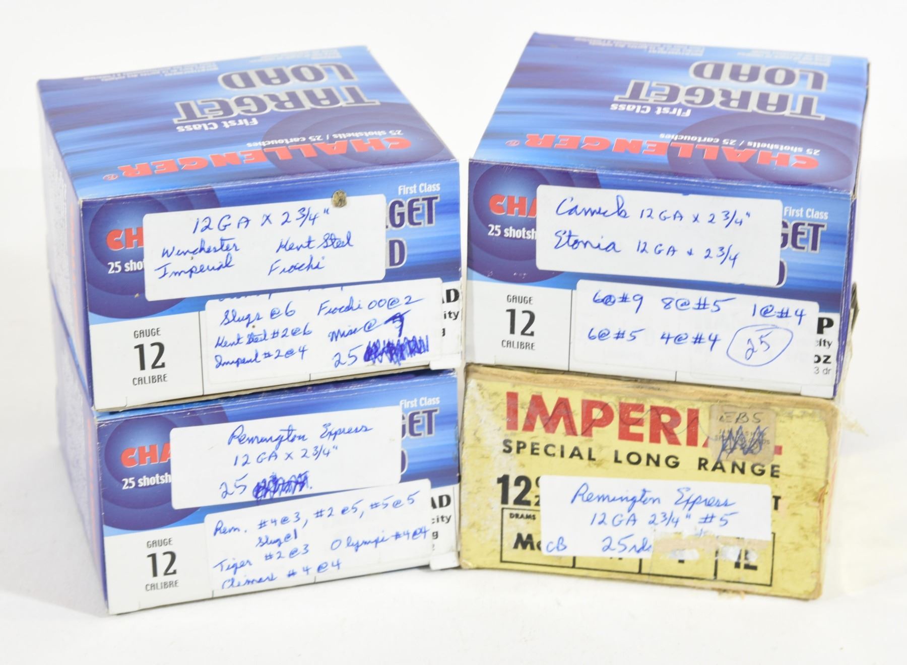 1) 75 rnds. 2 3/4" mixed makes and shot size 2) 25 rnds. Remington express, 2 3/4" # 5 shot in an Imperial box