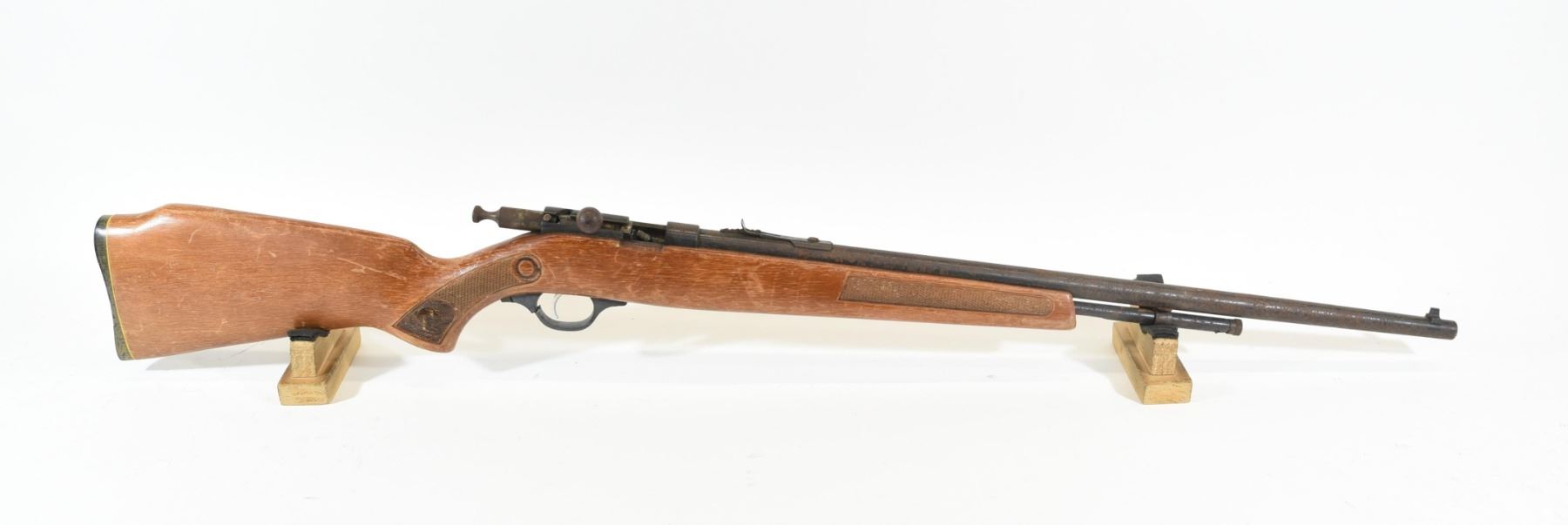 Non restricted, bolt action, 22 cal. s-l-lr, 24" barrel, SN none, wood has a number of light scratches/marks, bluing is brown & rusty, bore is very good, trigger guard is broken