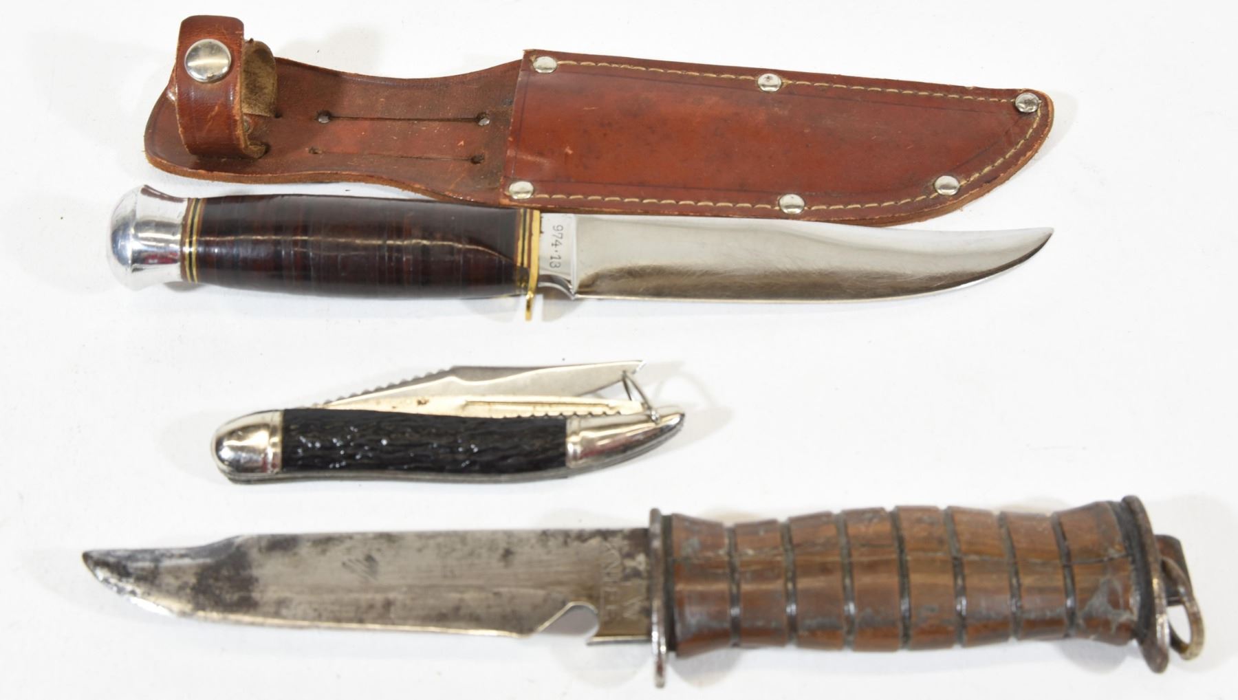US WW2 EGW Combat/Fighting Knife, Handel is cracked. Approximately 5" BLUE STEEL 974-13 Hunting knife with sheath. Approximately5 1/2" Pocket fish knife approximately 3 1/4" blade by Jawika