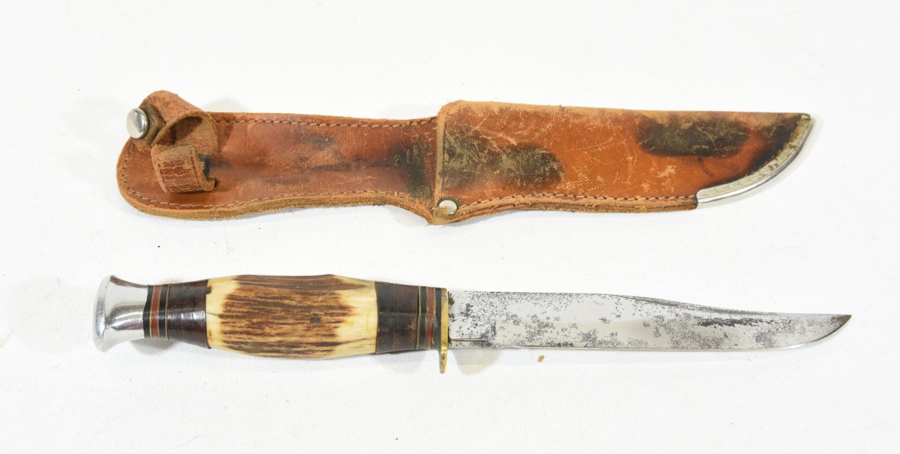 Hunting knife Stag handel with sheath. Approximately 5" blade. Retainig snap broken.