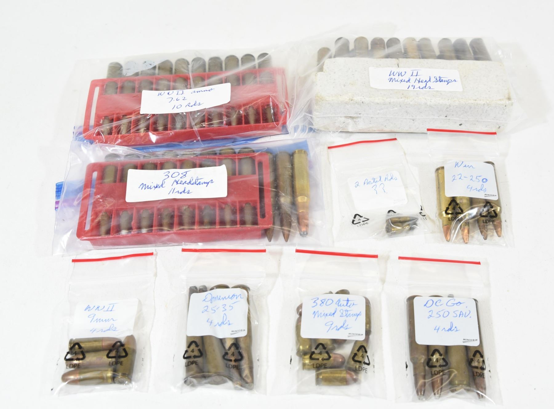 1- 4 rounds 25-35 2- 4 rounds 22-250 3- 9 rounds 380auto 4- 2 rounds 297 Morris 5- 4 rounds 250 savage 6- 4 rounds 9mm 7- 11 rounds 308 8- 10 rounds 7.62 (30-06) 9- 19 rounds 30-06