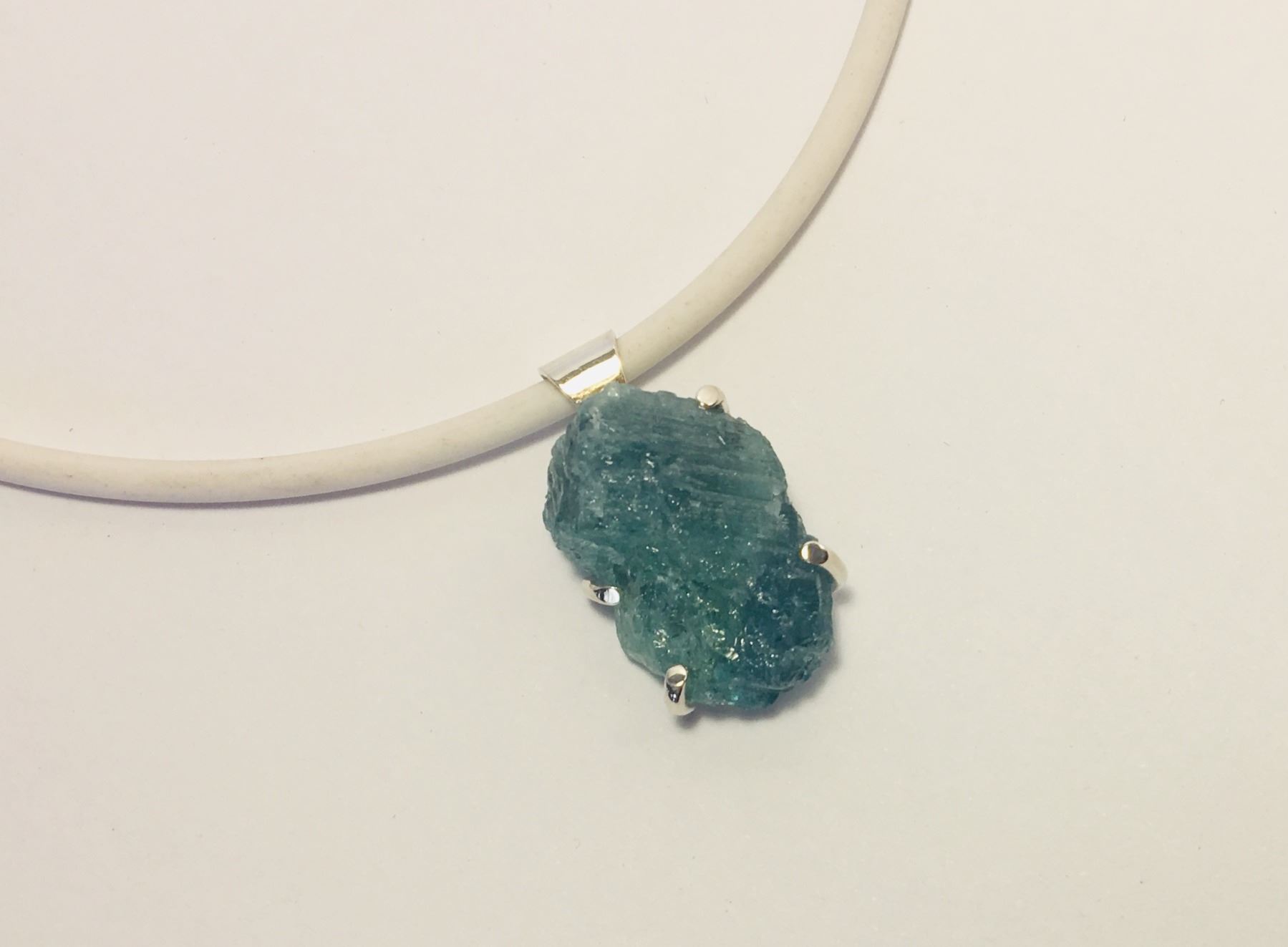 Blue tourmaline mineral pendant, set in silver (hand crafted) with a white rubber necklace.