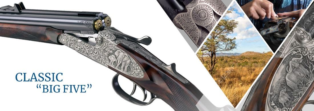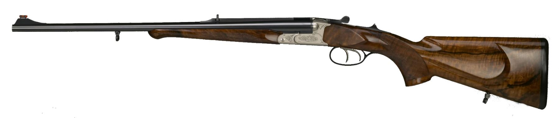 This double rifle in .470 NE comes with a 60cm (24") Barrel length, 38cm (15") Stock length - right-handed - with PH-ProCoating. The "Big Five" stock (grade 002) includes "Old English" rubber recoil pad in black and is engraved with a Safari Scroll.