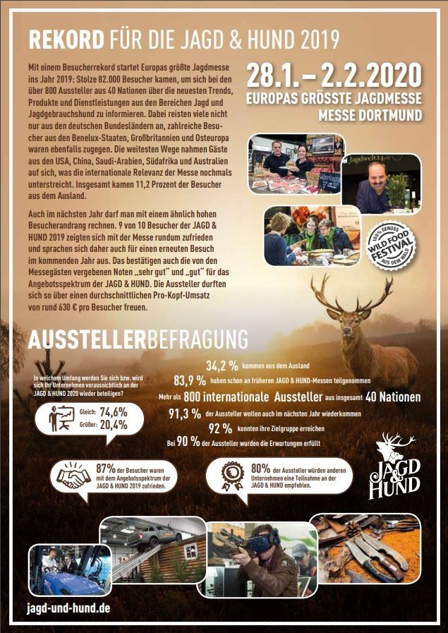 JAGD & HUND is becoming increasingly international. Companies from more than 40 countries present their offer at the Westfalenhallen Dortmund Exhibition Centre. Amongst them are exhibitors from Australia, New Zealand, Argentina, the United States of America and South Africa.