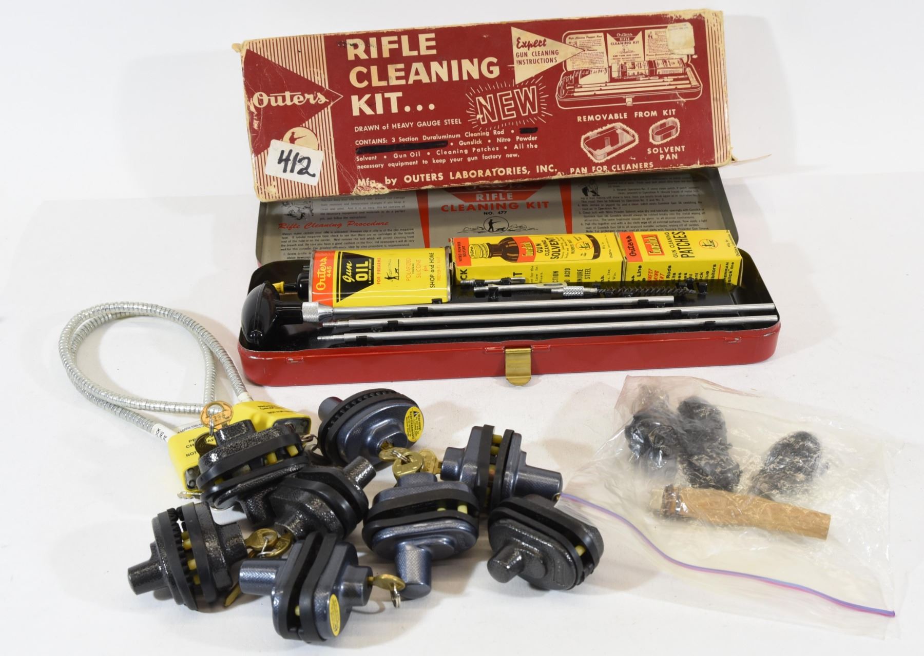 1) Vinatge complete gun cleaning kit. 2) Vintage Weaver 4x scope 3) lot of trigger locks