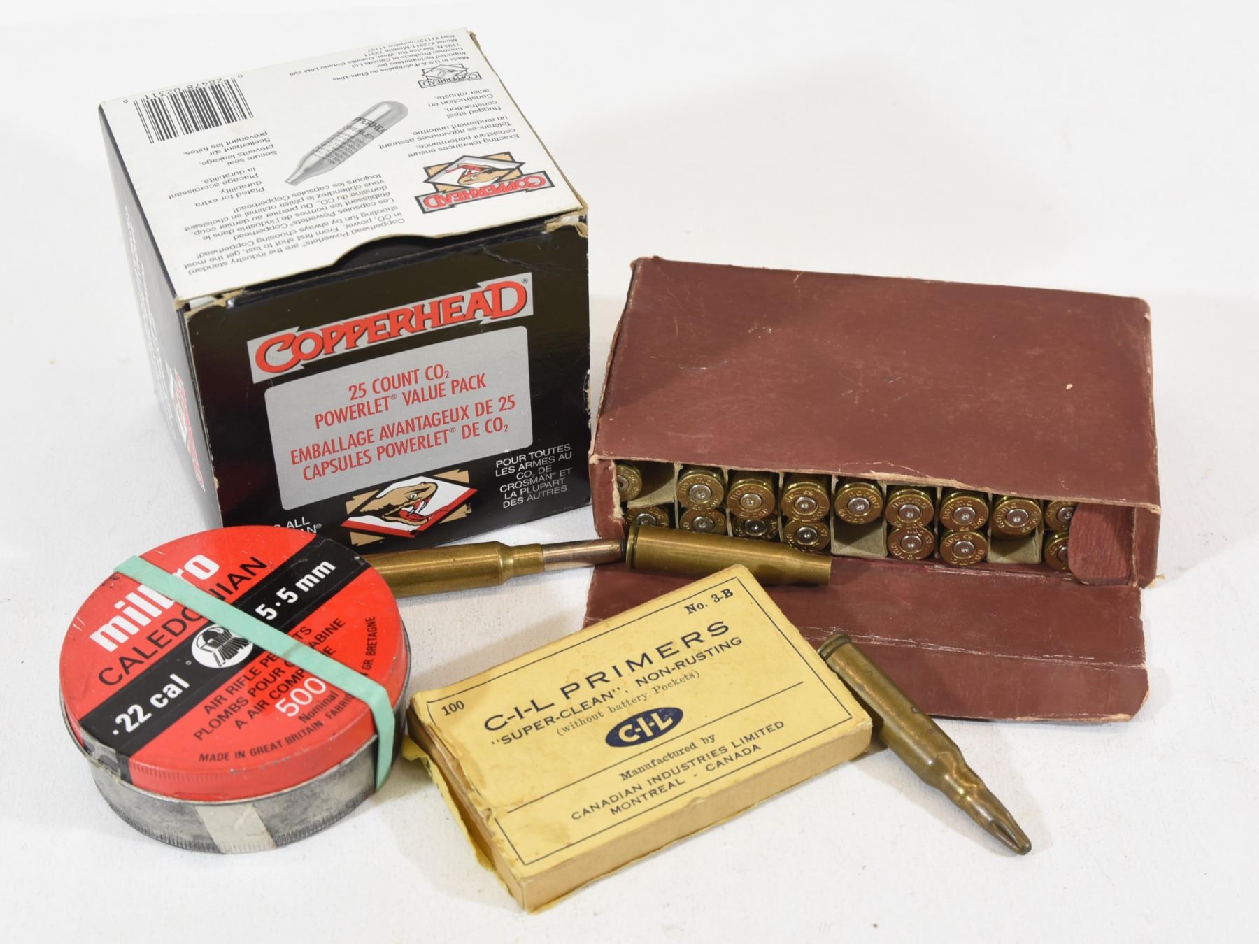 WILL NOT SHIP 1) 6.5x55 2 miscelaneous rounds 2) box of 6.5 Japanese cases 11 rounds 3) tin of .22 cal pellets. 4) vintage collecable CIL Primers. 5) Copperhead C02 cylinders.