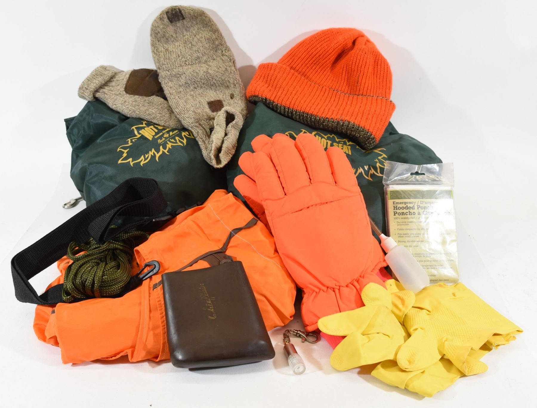 1) 2 Hot seats 2) Flare orange vest 3) Flare orange mits and hat 3) Thinsulate mits 4) yelllow rubber gloves 5)rope/strap/rubber absorber