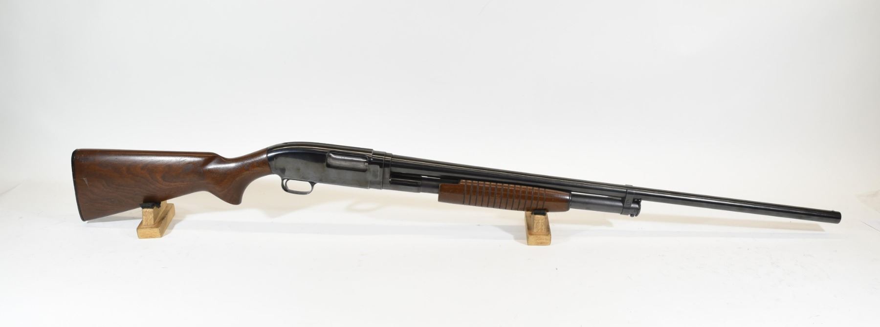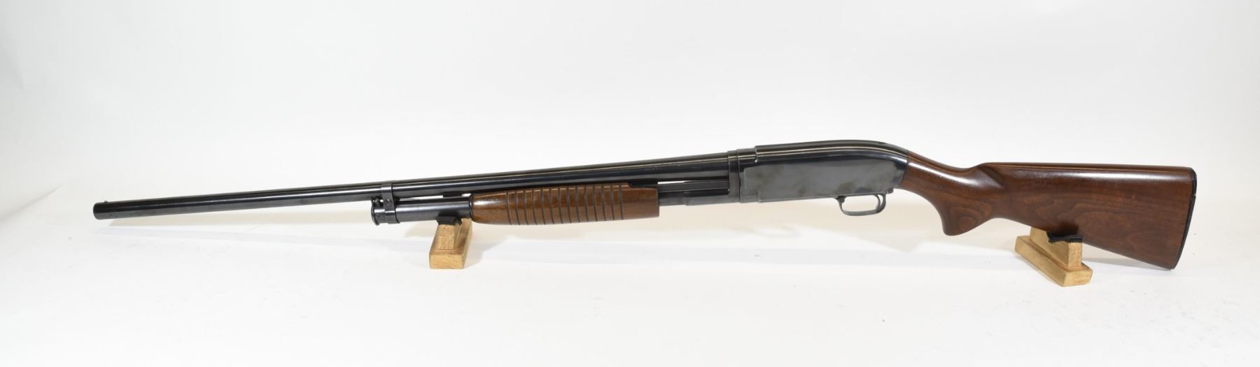 Non-restricted, pump action, 12Ga x 2 3/4", 30" barrel with fixed full choke, SN 1723284. Wood has a few dents and scratches, bluing has some light scratches, grey on magazine, bore excellent.
