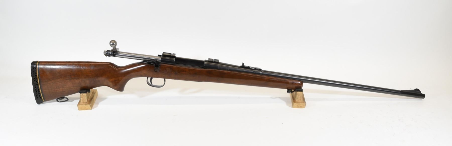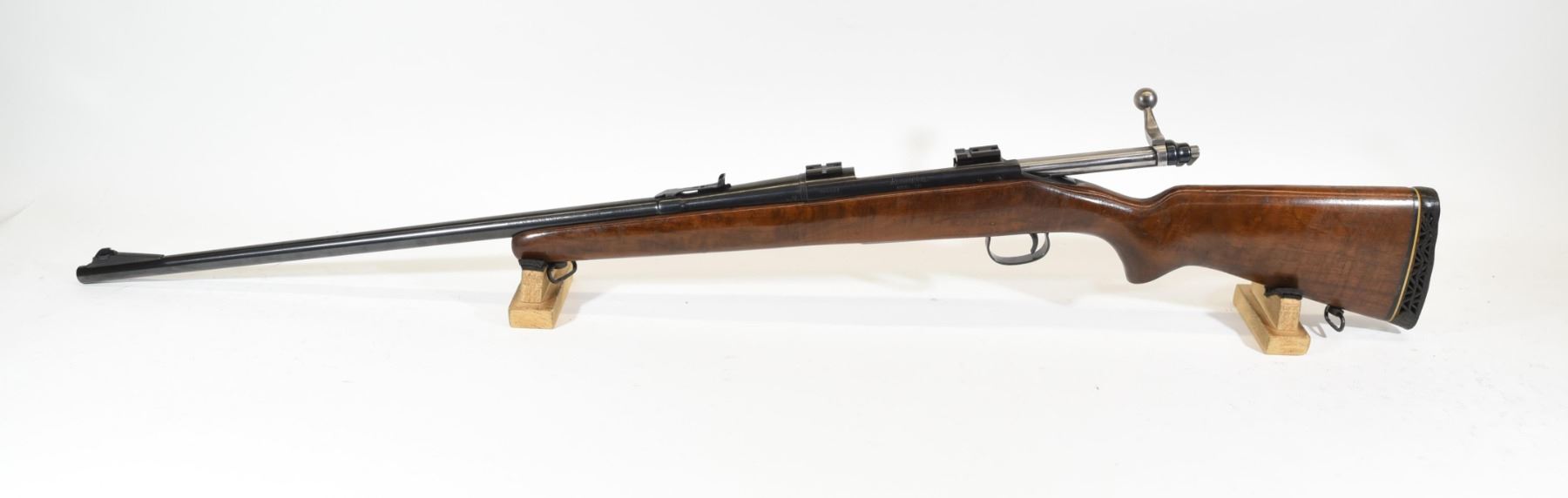 Non-restricted, bolt action, 300 H&H Mag, 26" barrel, SN 385697. Wood finish is in need of repair, bluing good, bore very good. Recoil pad compressed.