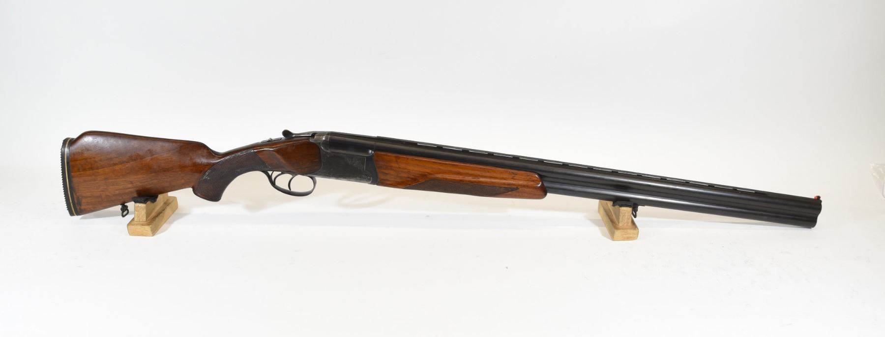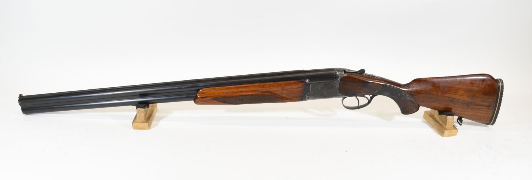 Non-restricted, O/U multi barrel, 12 ga. 2 3/4", 28" vent rib barrel with full & mod. chokes, SN B04854 Wood is fair with a few scratches/marks, bluing is turning gray at receiver, bores are very good.