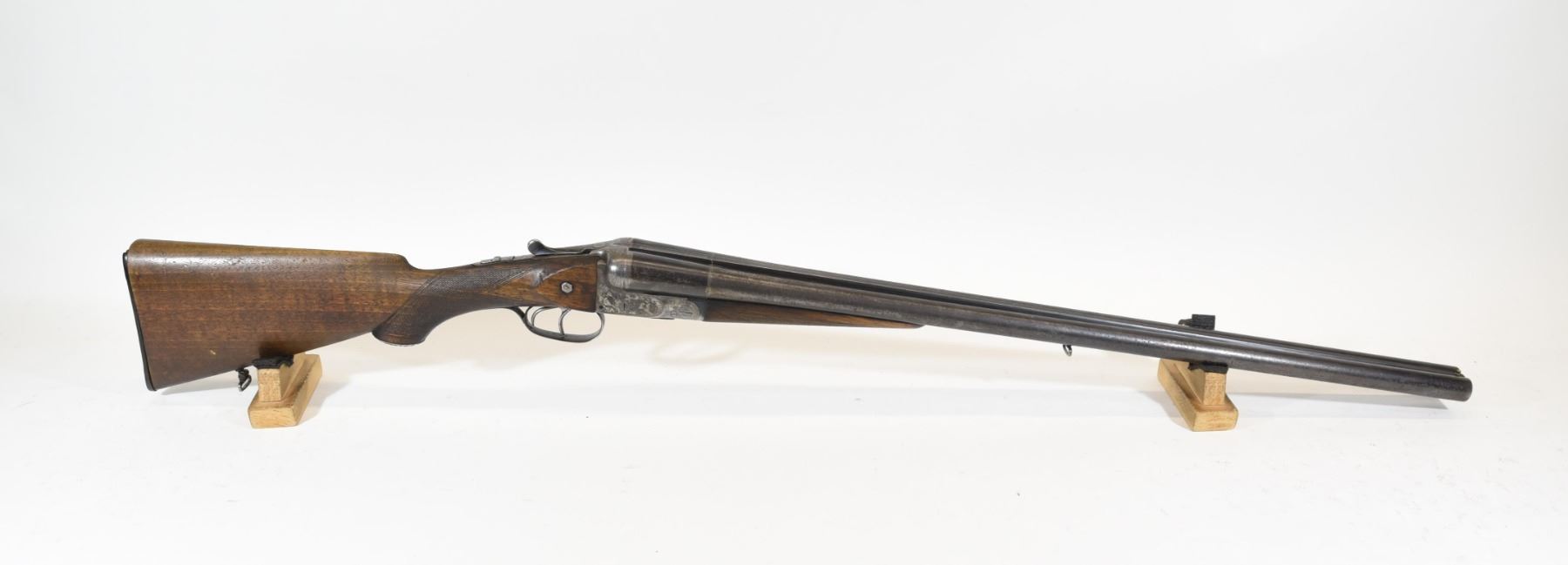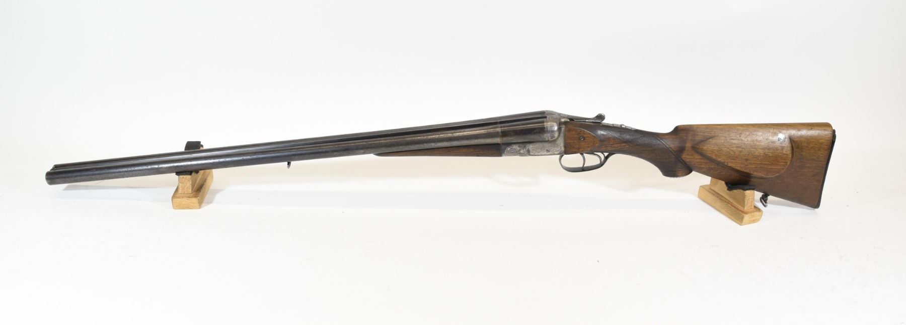Non-restricted, side by side, 12ga , 27" barrel with full and modified choke, SN 23039. Wood is worn and bruised, bluing is rusty and pitted, bore is good. Butt stock has play and pad is broken.