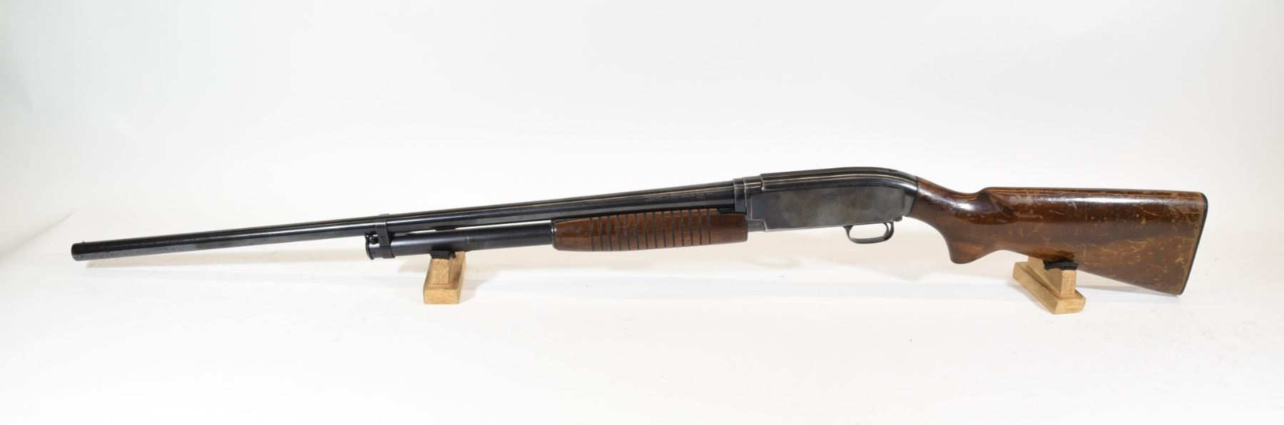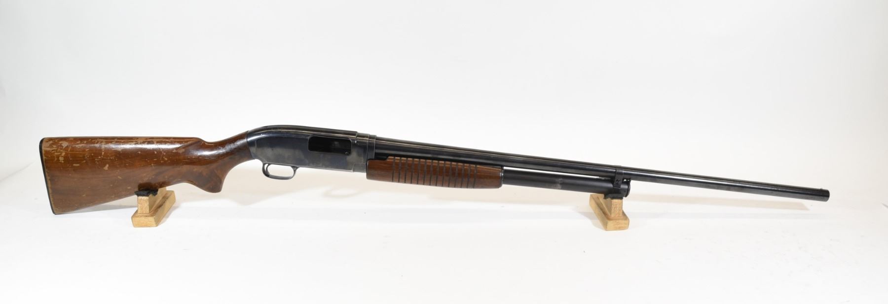 Non-restricted, pump action, 12Ga x 2 3/4", 30" barrel with fixed full choke, SN 1605749. Wood losing finish, numerous flakes, bluing is grey and worn, bore excellent.