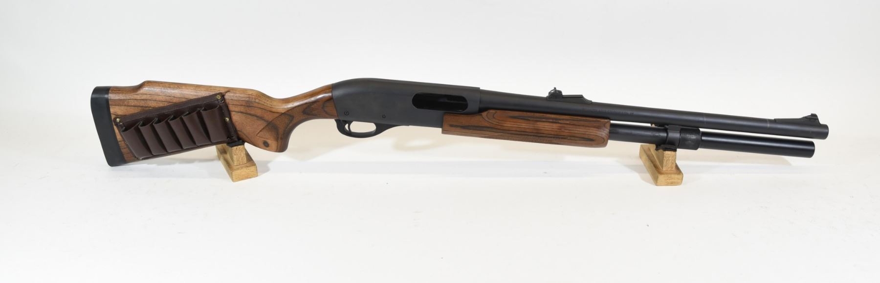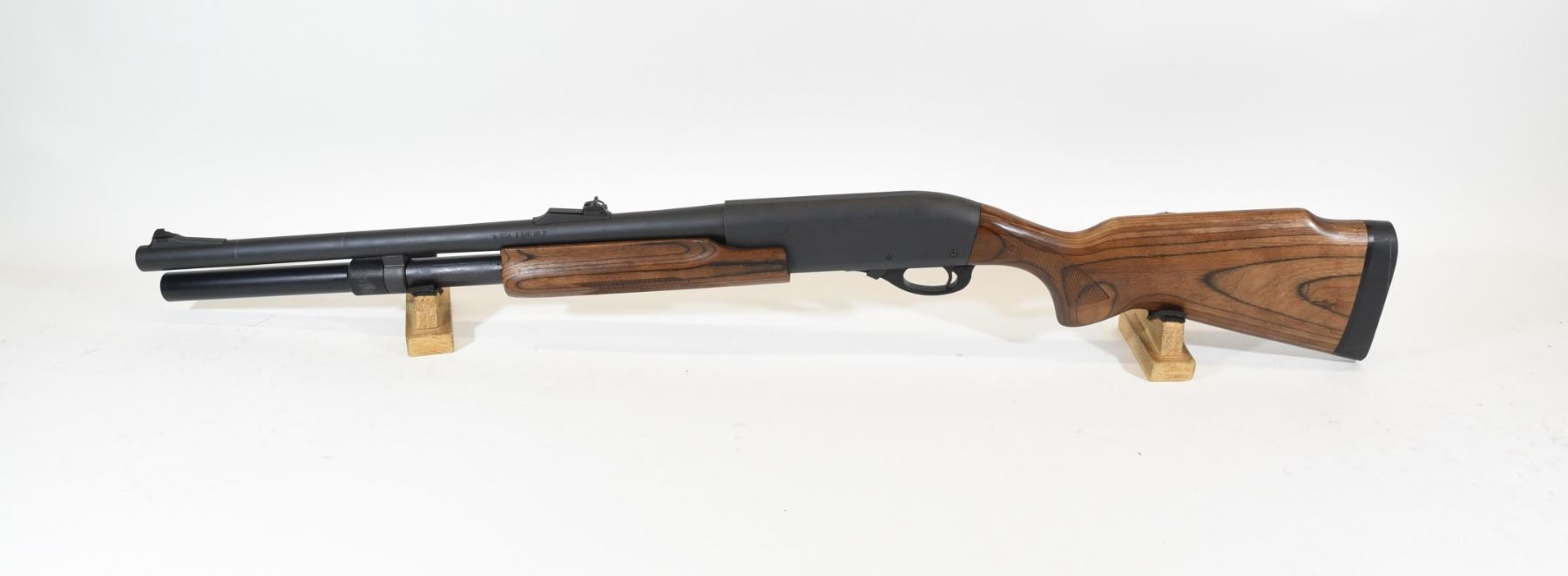 Non-restricted, pump action, 12Ga x 3", 20" smooth bore slug barrel with fixed IC choke, SN RS33781D. Laminated wood has shell holder screwed into right side, matte metal finish very good, bore excellent.