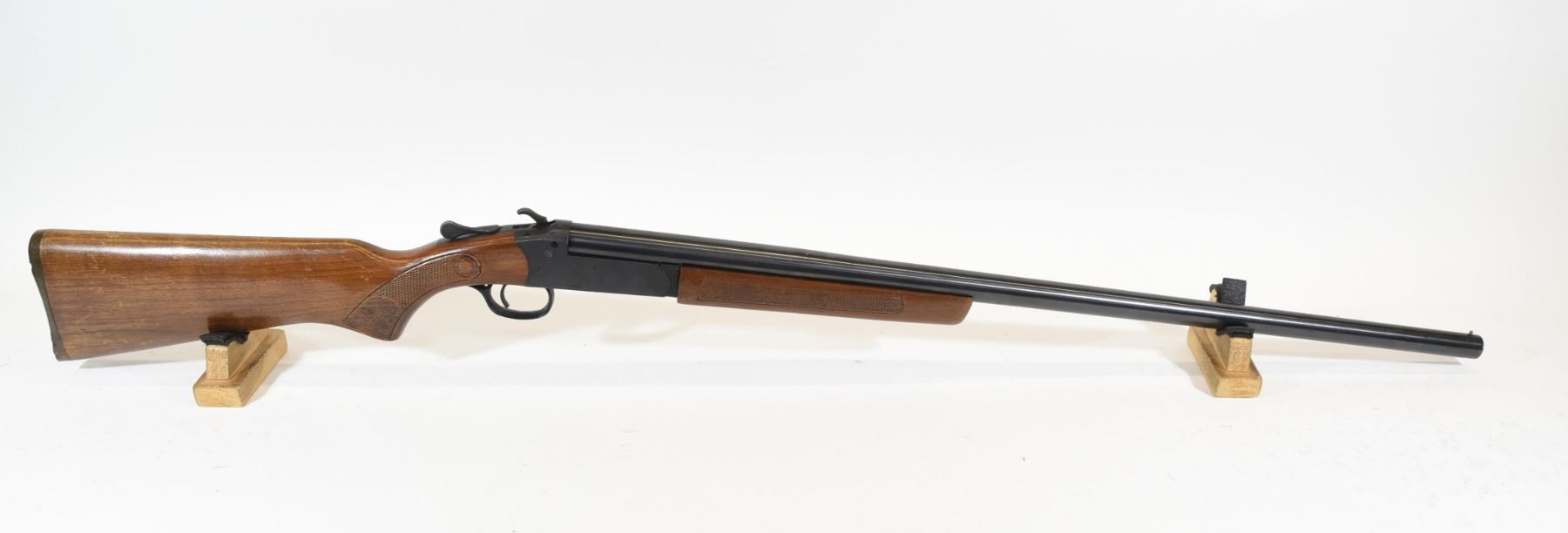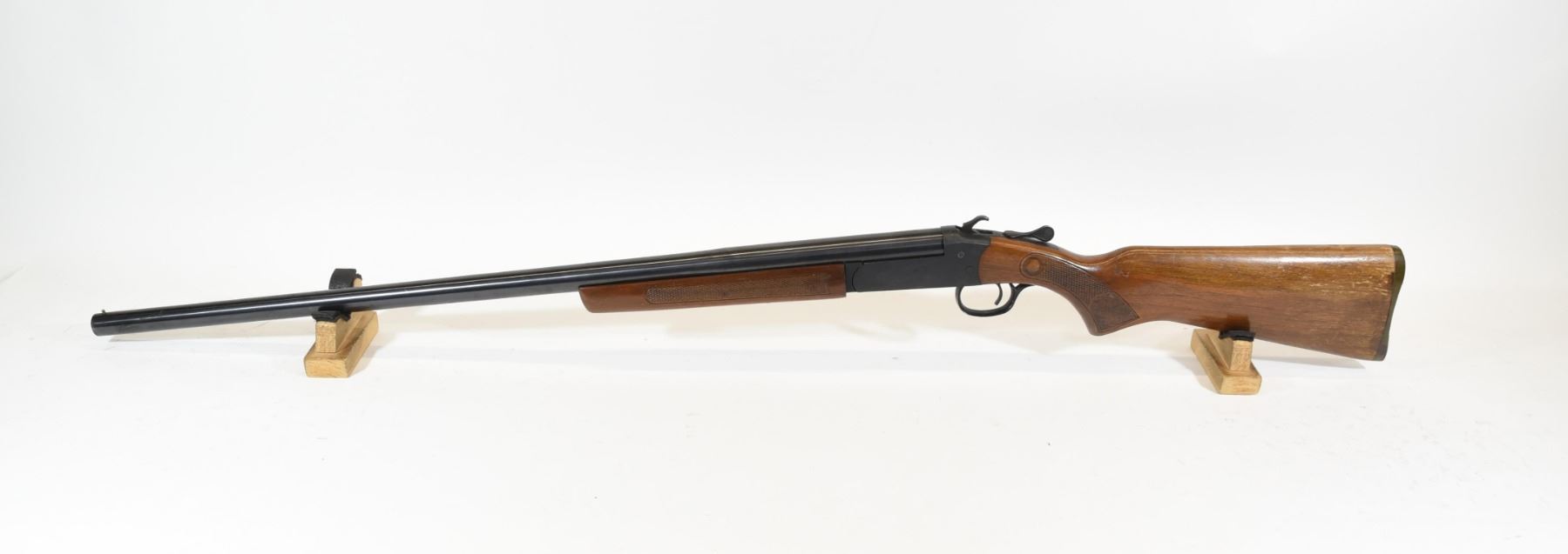 Non-restricted, single shot, 12Ga x 2 3/4", 30" barrel with fixed full choke, SN 4862C. Wood is losing finish, bluing has light pitting all over and a deep mark on barrel, bore excellent.