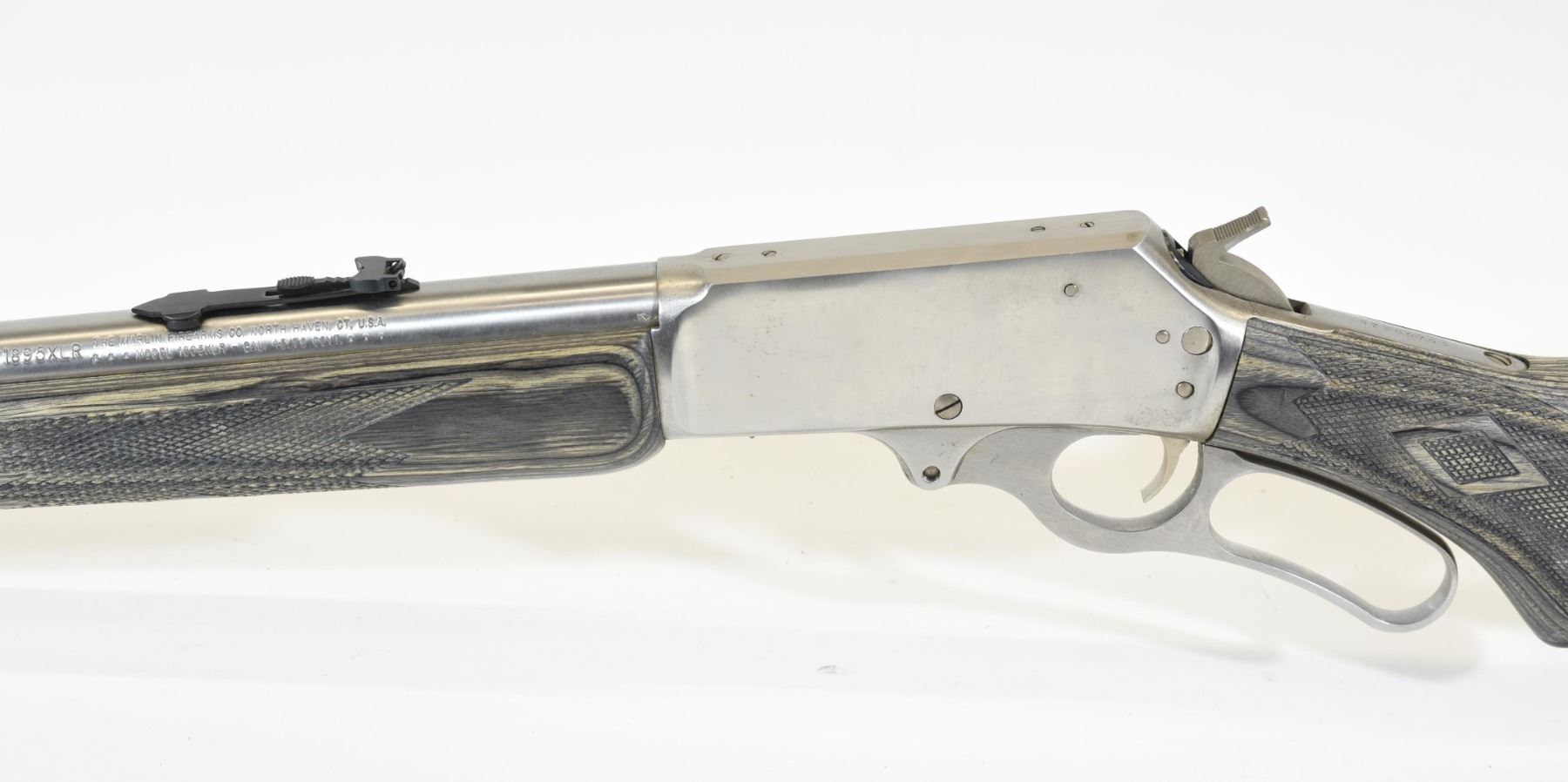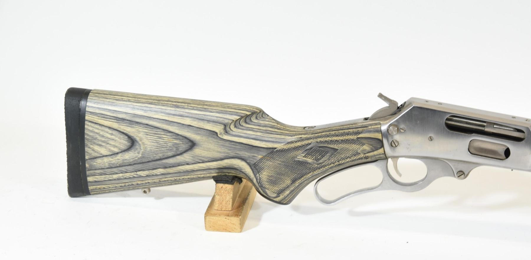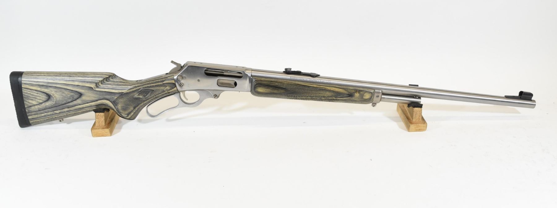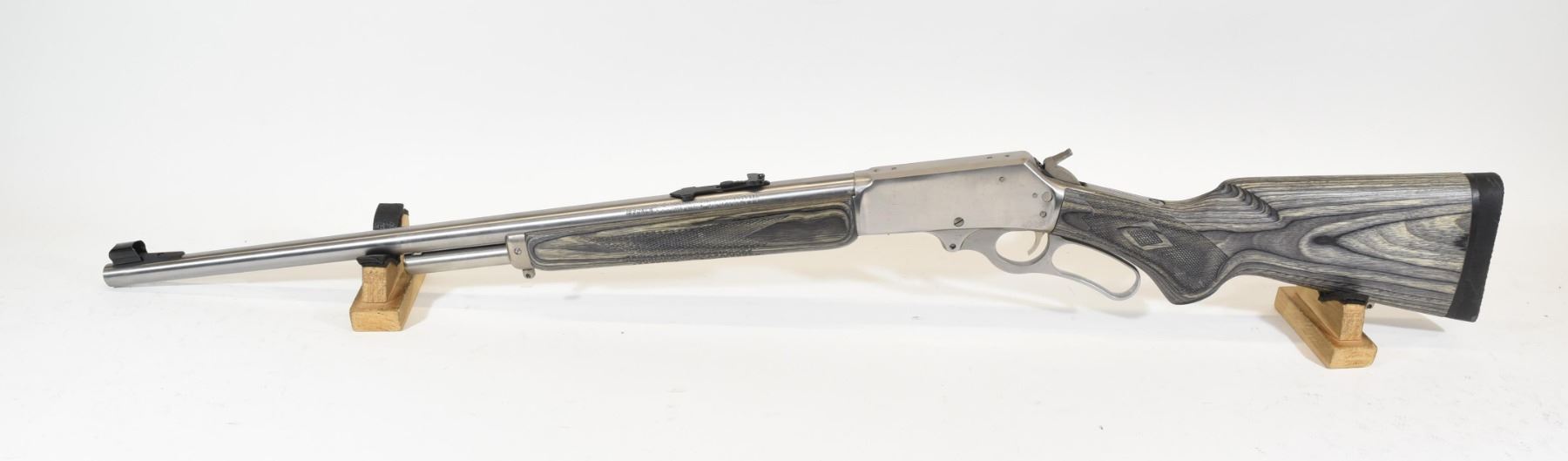 Non-restricted, lever action, 45-70 Govt, 24" barrel, SN 92206753. Laminated wood stock very good, stainless frame has some pit marks and a scratch, bore excellent. Comes with some documents and trigger extension.