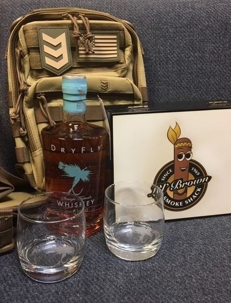 Cigars from Little Brown Smoke Shack, A bottle of whiskey and glasses from Dry Fly Distilling, 3V Gear EDC pack and a Springfield Hellcat pistol.