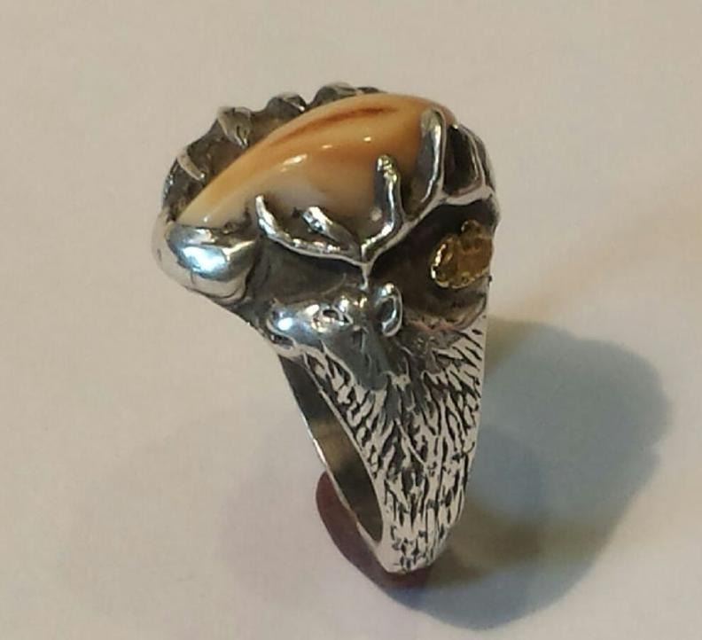 Sterling silver elk ivory ring. Each item made at Jewel Crafters in Yakima, WA is unique and custom made. The actual ring being sold may look slightly different from the picture since each piece is made by hand around a specific elk ivory. The basic design is similar, with embossed elk on each side of the ring of which the elk antlers are holding the elk ivory stone. There is also a genuine Alaskan gold nugget inlaid on each side of the ring. This the "The All American Elk Ring"!