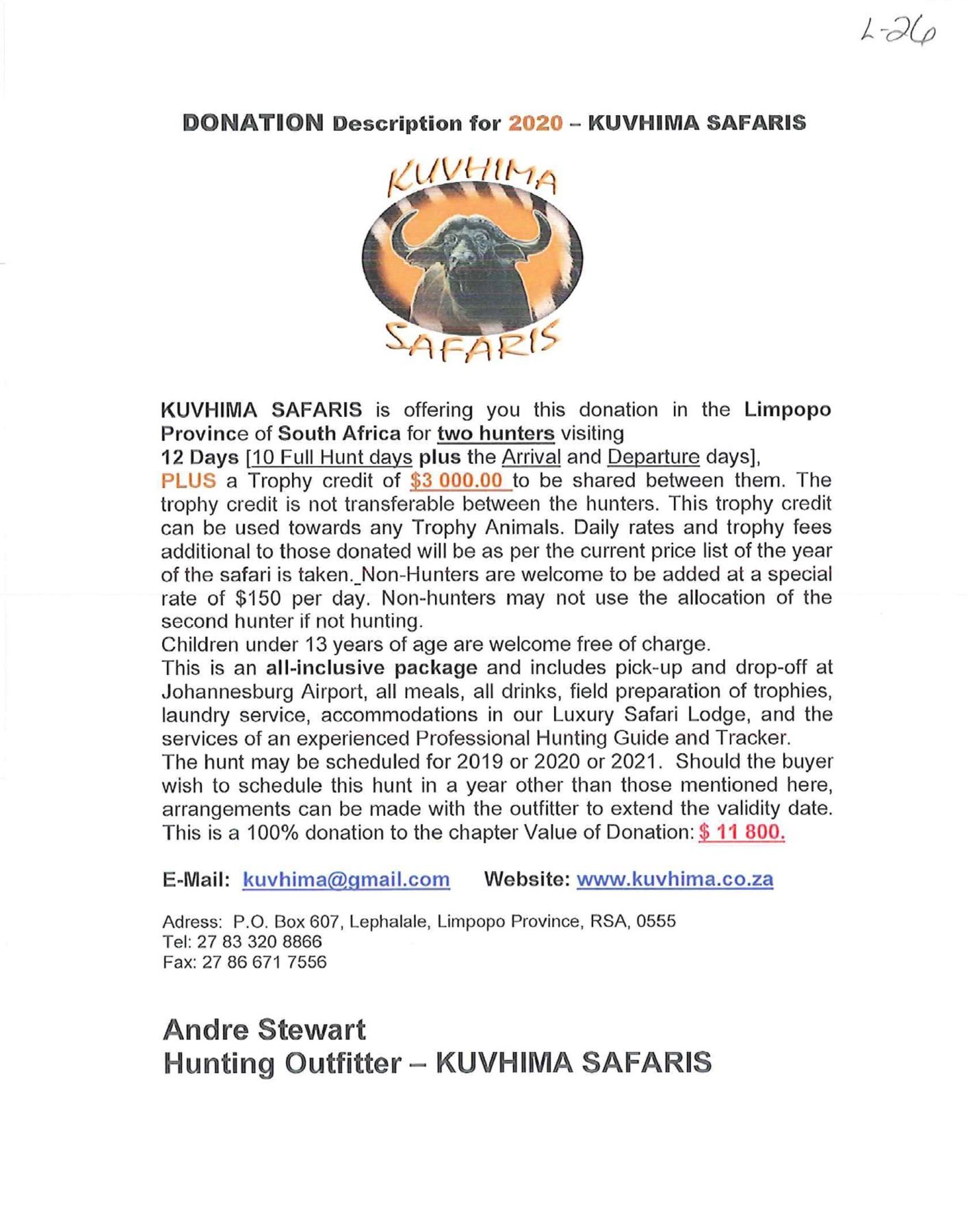 Kuvhima Safaris is offering a donation in the Limpopo Province of South Africa for two hunters for ten hunt days plus the arrival and departure days, plus trophy credit of $3,000 to be shared between them. This trophy credit can be used for any trophy animal. Daily rates and trophy fees additional to those donated will be as per the current price list. Non-hunters are welcome to be added at $150 per day. Children under 13 years of age are welcome free of charge. This is an all-inclusive package and includes pick-up and drop-off at Johannesburg Airport, all meals, drinks in moderation, field preparation of trophies, laundry service, accommodations in our Luxury Safari Lodge and the services of an experienced Professional Hunter and tracker. The hunt may be scheduled for 2020 or 2021. Click image for additional information. www.kuvhima.co.za