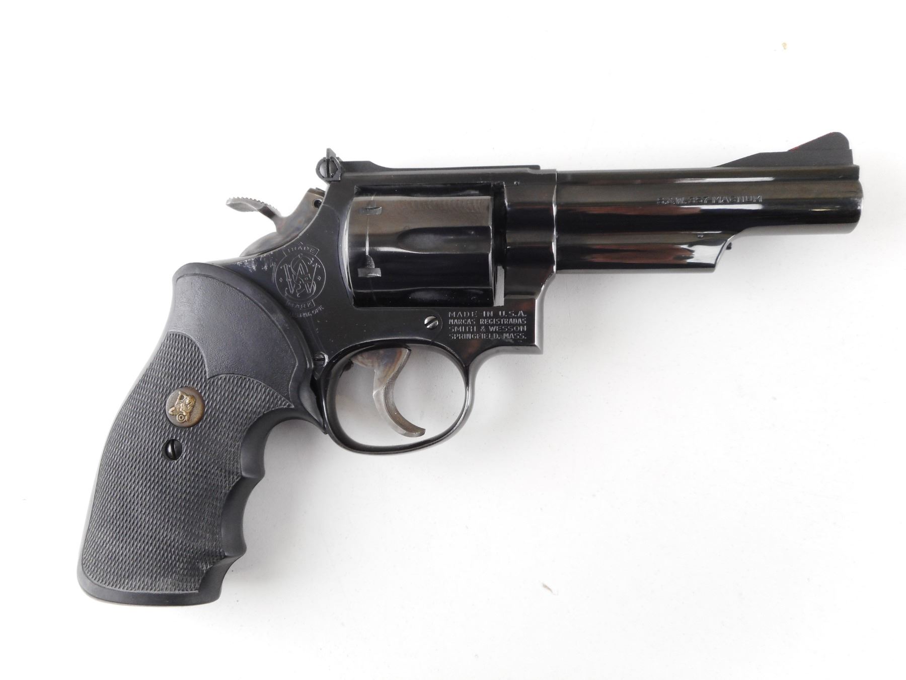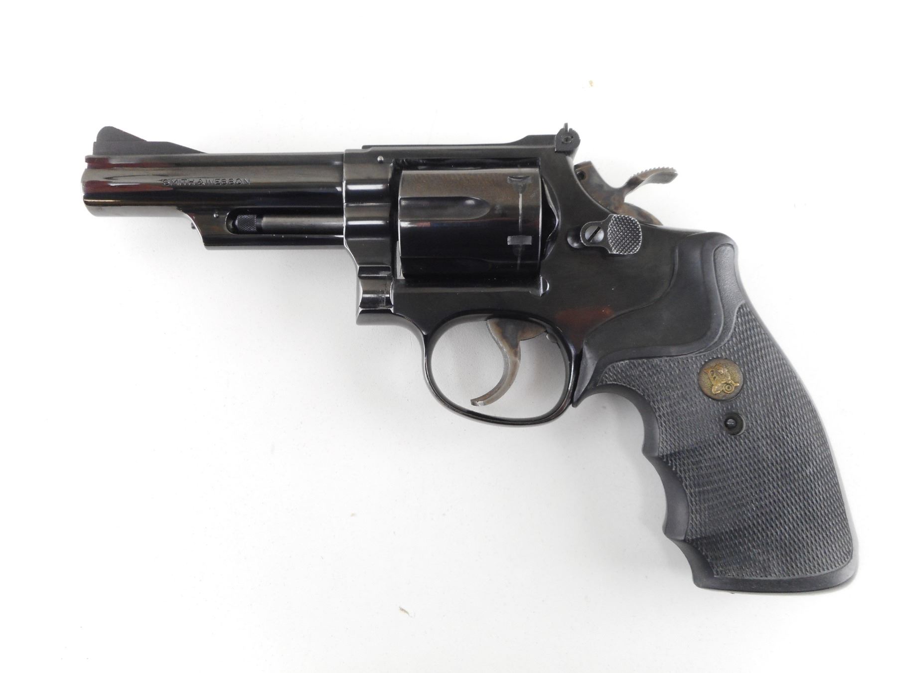 SMITH & WESSON , MODEL: 19-4 , CALIBER: 357 MAG , 6 SHOT CAPACITY. BORE IS GOOD. BLADE FRONT SIGHT, ADJUSTABLE REAR SIGHT. PACHMAYR GRIPS. HOLDS COCK, INDEXES WELL, ACTION IS TIGHT. SHOWS VERY LITTLE HANDLING MARKS. ACTION: REVOLVER , BARREL LENGTH: 102MM , SERIAL # 38K1438 , CONDITION: 8/10 , CLASS: CANADIAN PROHIBITED CLASS , THIS ITEM WILL NOT BE SOLD IN LOT ORDER. THE PROHIBITED ITEMS WILL BE SOLD AFTER THE DEACTIVATED CLASS 5000 SERIES AND BEFORE THE 3000 SERIES NON RESTRICTED. PLEASE SEE LOT 0C LOT LEGEND FOR FULL DETAILS
