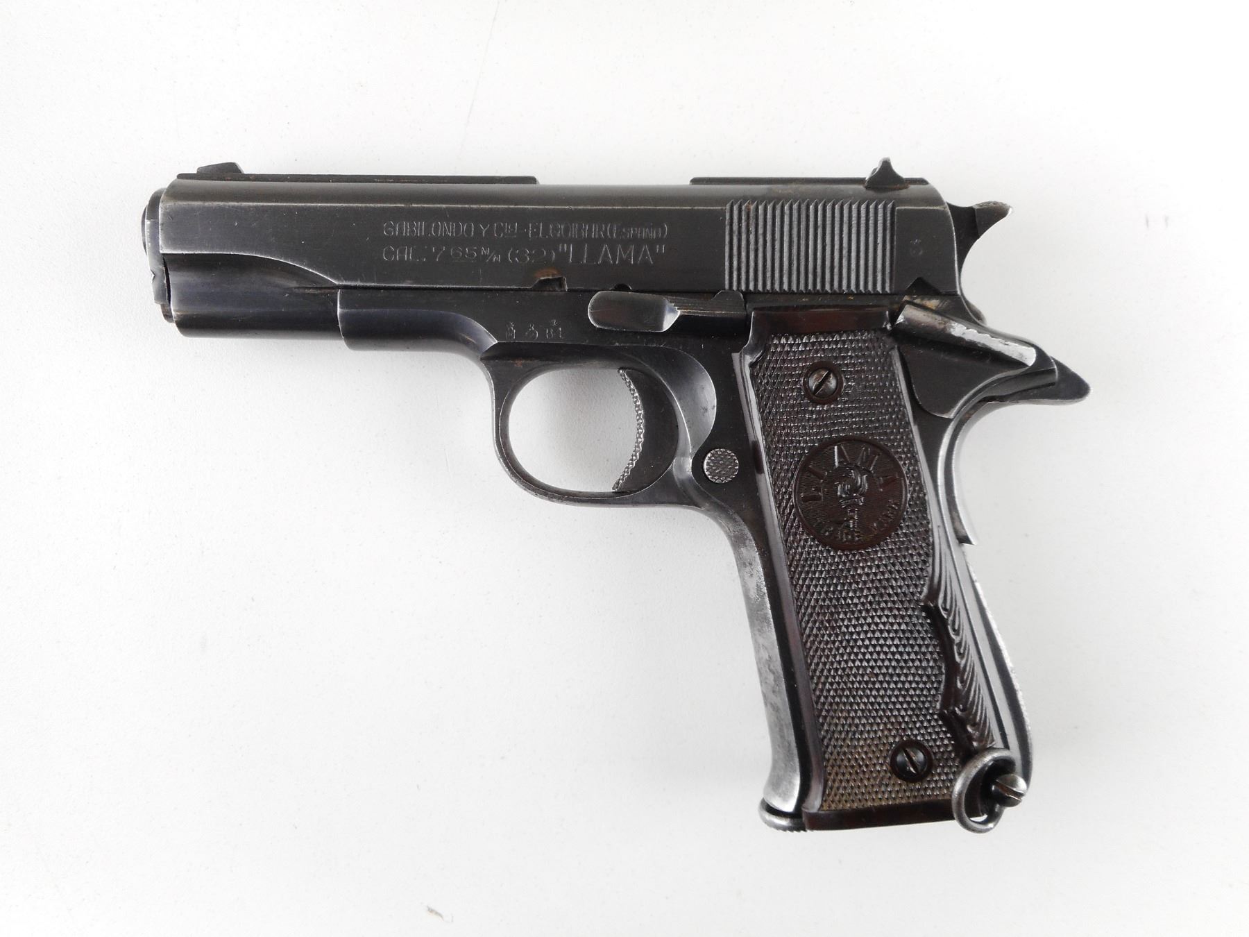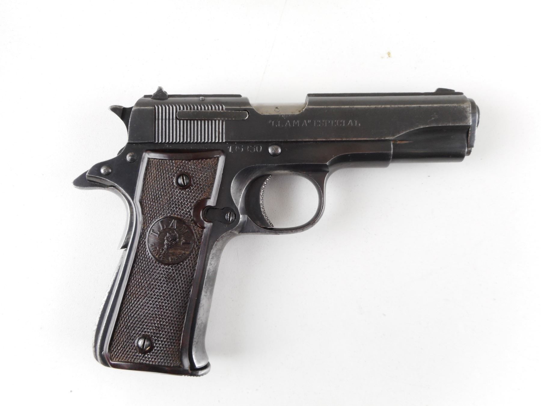 LLAMA , MODEL: ESPECIAL , CALIBER: 7.65MM , COMES WITH MAGAZINE. BORE IS GOOD. BLADE FRONT AND FIXED REAR SIGHTS. BROWN CHECKERED GRIP PANELS WITH LLAMA LOGO. LANYARD LOOP. SHOWS SOME HANDLING MARKS. ACTION: SEMI-AUTOMATIC HANDGUN , BARREL LENGTH: 95MM , SERIAL # 185830 , CONDITION: 7/10 , CLASS: CANADIAN PROHIBITED CLASS , THIS ITEM WILL NOT BE SOLD IN LOT ORDER. THE PROHIBITED ITEMS WILL BE SOLD AFTER THE DEACTIVATED CLASS 5000 SERIES AND BEFORE THE 3000 SERIES NON RESTRICTED. PLEASE SEE LOT 0C LOT LEGEND FOR FULL DETAILS