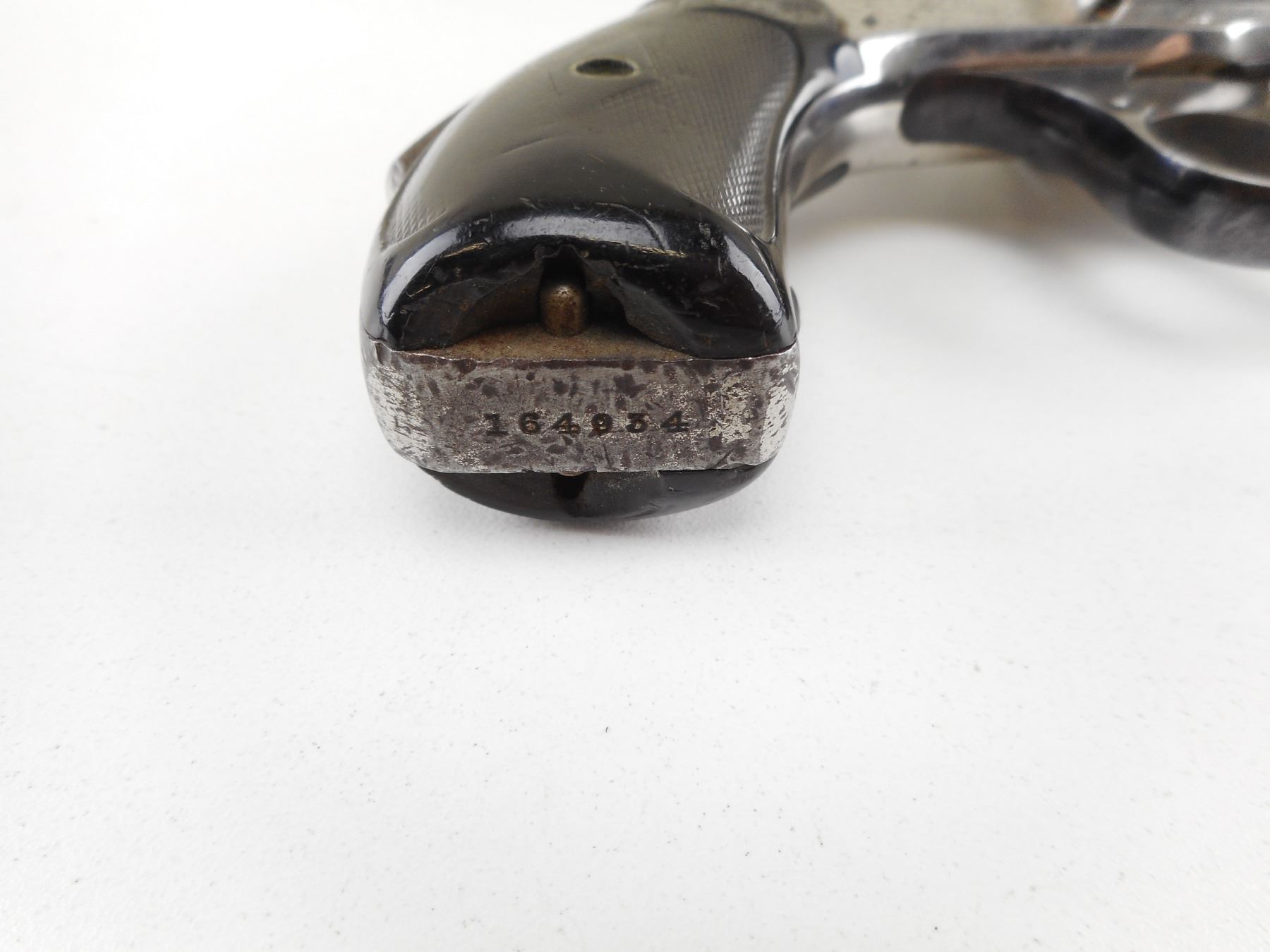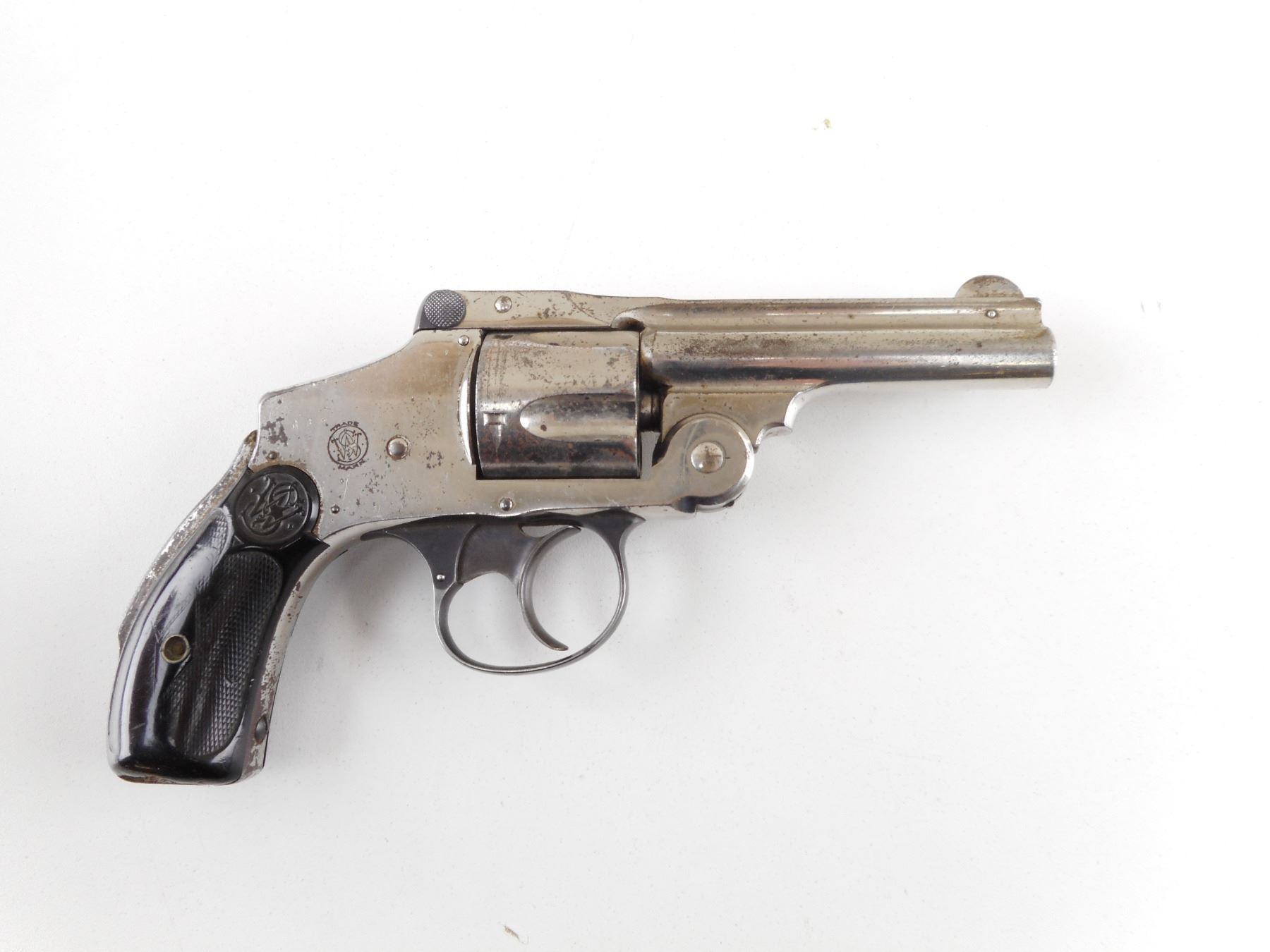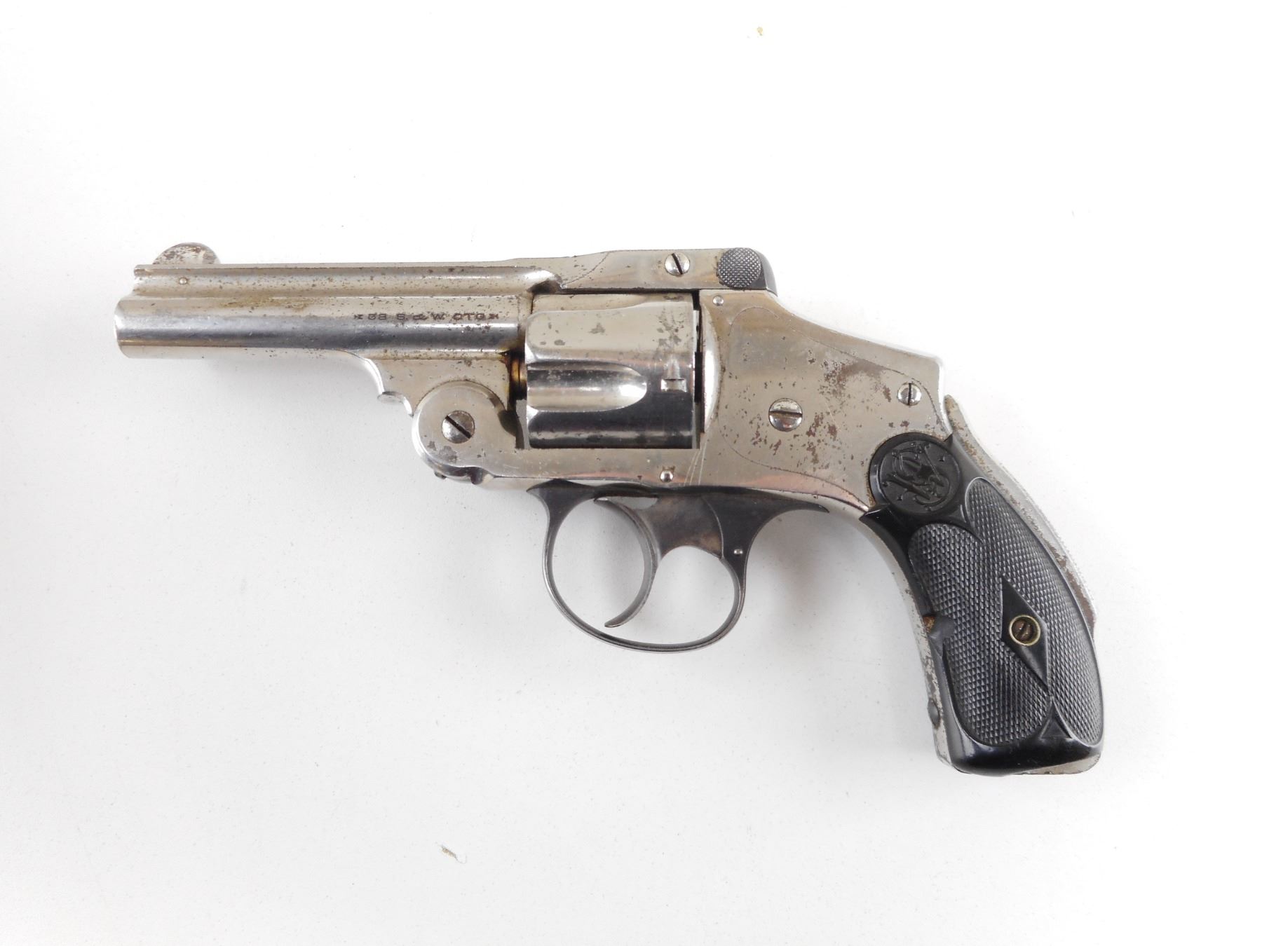 SMITH & WESSON , MODEL: 38 SAFETY HAMMERLESS FOURTH MODEL , CALIBER: 38 S&W , 5 SHOT CAPACITY. BORE IS FAIR. WORKS IN THE DOUBLE ACTION. BLADE FRONT AND RAISED NOTCH REAR SIGHT. AKA LEMON SQUEEZER MODEL. CHECKERED BLACK SYNTHETIC GRIP PANELS WITH NUMEROUS CRACKS AND CHIPS. SHOWS SOME HANDLING MARKS. ACTION: REVOLVER , BARREL LENGTH: 83MM , SERIAL # 164934 , CONDITION: 5/10 , CLASS: CANADIAN PROHIBITED CLASS , THIS ITEM WILL NOT BE SOLD IN LOT ORDER. THE PROHIBITED ITEMS WILL BE SOLD AFTER THE DEACTIVATED CLASS 5000 SERIES AND BEFORE THE 3000 SERIES NON RESTRICTED. PLEASE SEE LOT 0C LOT LEGEND FOR FULL DETAILS