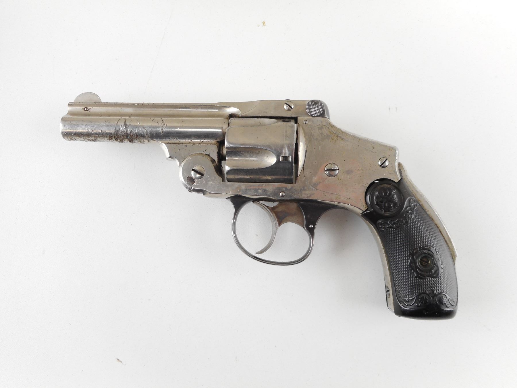 SMITH & WESSON , MODEL: 38 SAFETY HAMMERLESS FOURTH MODEL , CALIBER: 38 S&W , 5 SHOT CAPACITY. BORE IS GOOD. WORKS IN THE DOUBLE ACTION. BLADE FRONT AND RAISED NOTCH REAR SIGHT. AKA LEMON SQUEEZER MODEL. CHECKERED BLACK SYNTHETIC GRIP PANELS. SHOWS SOME HANDLING MARKS. ACTION: REVOLVER , BARREL LENGTH: 83MM , SERIAL # 131274 , CONDITION: 6/10 , CLASS: CANADIAN PROHIBITED CLASS , THIS ITEM WILL NOT BE SOLD IN LOT ORDER. THE PROHIBITED ITEMS WILL BE SOLD AFTER THE DEACTIVATED CLASS 5000 SERIES AND BEFORE THE 3000 SERIES NON RESTRICTED. PLEASE SEE LOT 0C LOT LEGEND FOR FULL DETAILS