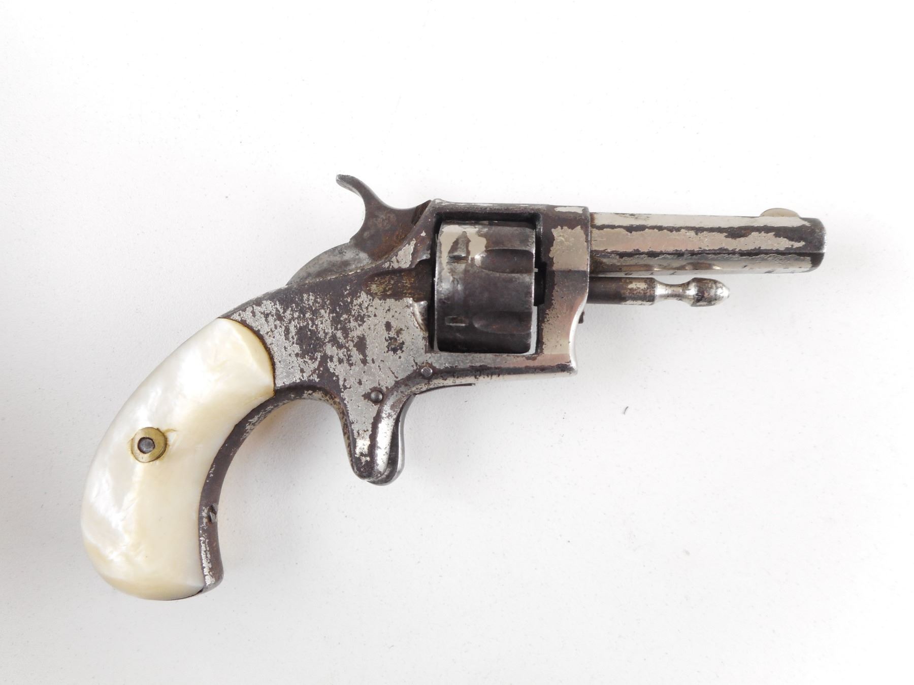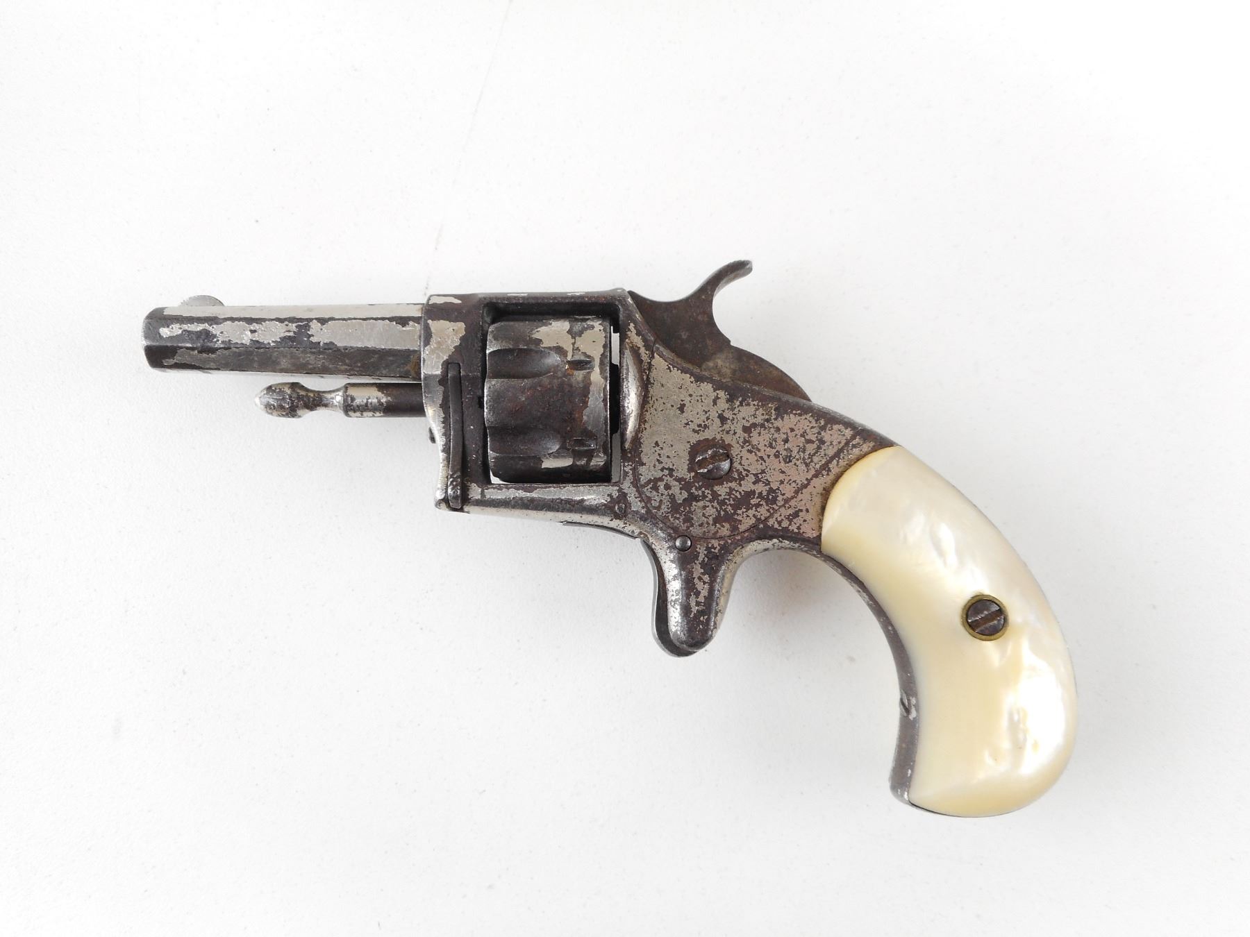 HOPKINS & ALLEN , MODEL: XL NO1 , CALIBER: 22 RIM FIRE , 7 SHOT CAPACITY. DARK BORE. HOLDS COCK, INDEXES WELL, ACTION IS TIGHT. BLADE FRONT SIGHT AND RAISED NOTCH REAR SIGHT. MISSING MUCH OF THE METAL PLATING. MOTHER OF PEARL STYLE GRIP PANELS. SHOWS EXTENSIVE HANDLING MARKS.ACTION: REVOLVER , BARREL LENGTH: 51MM , SERIAL # 718 , CONDITION: 4/10 , CLASS: CANADIAN PROHIBITED CLASS , THIS ITEM WILL NOT BE SOLD IN LOT ORDER. THE PROHIBITED ITEMS WILL BE SOLD AFTER THE DEACTIVATED CLASS 5000 SERIES AND BEFORE THE 3000 SERIES NON RESTRICTED. PLEASE SEE LOT 0C LOT LEGEND FOR FULL DETAILS
