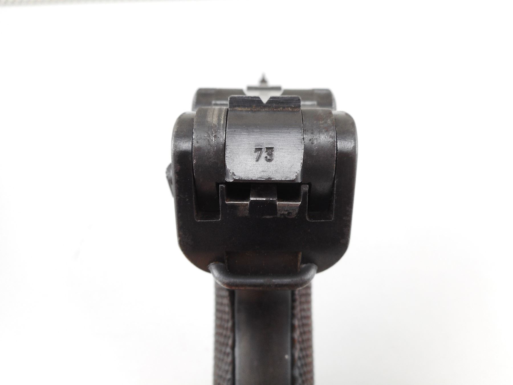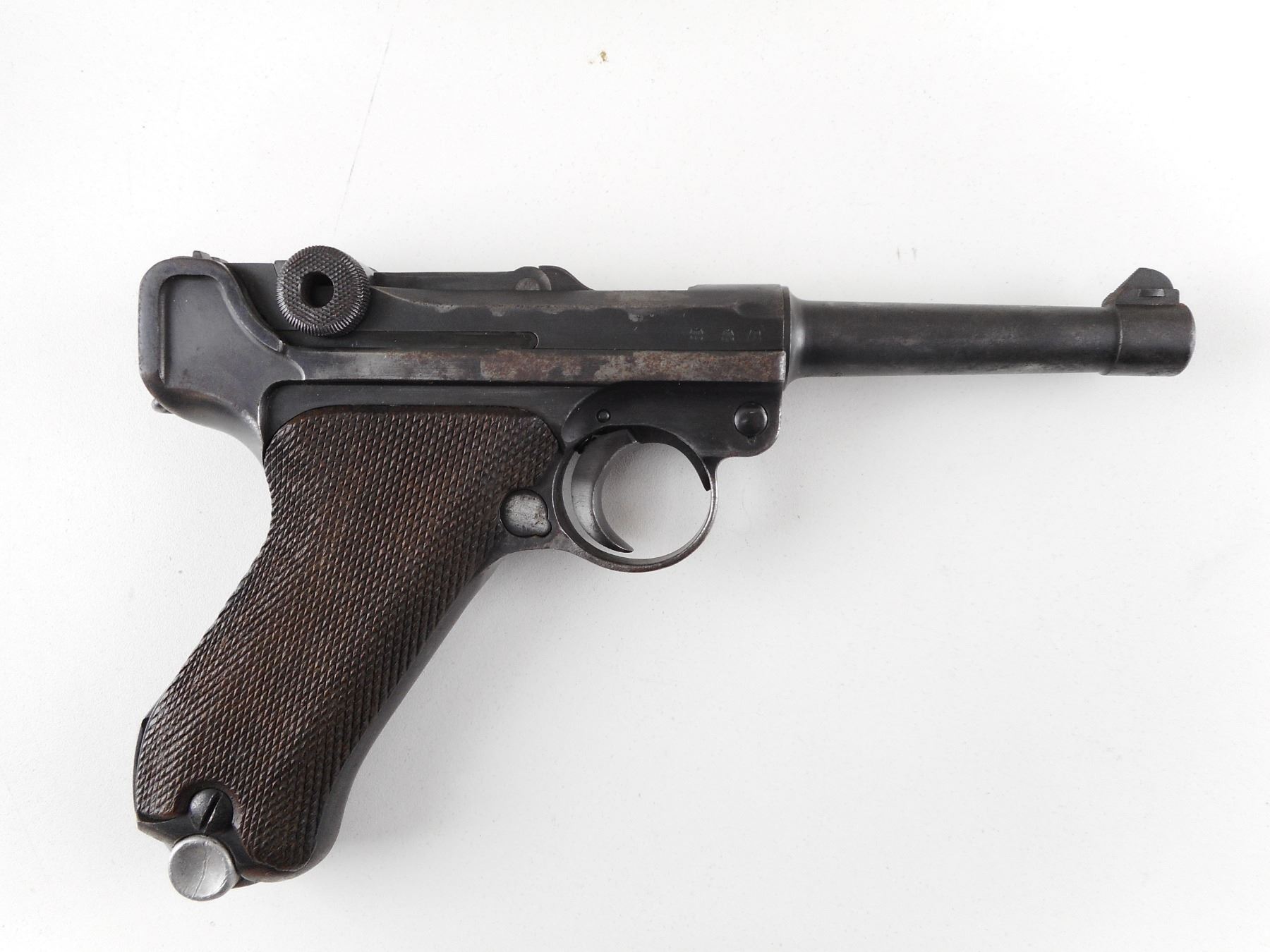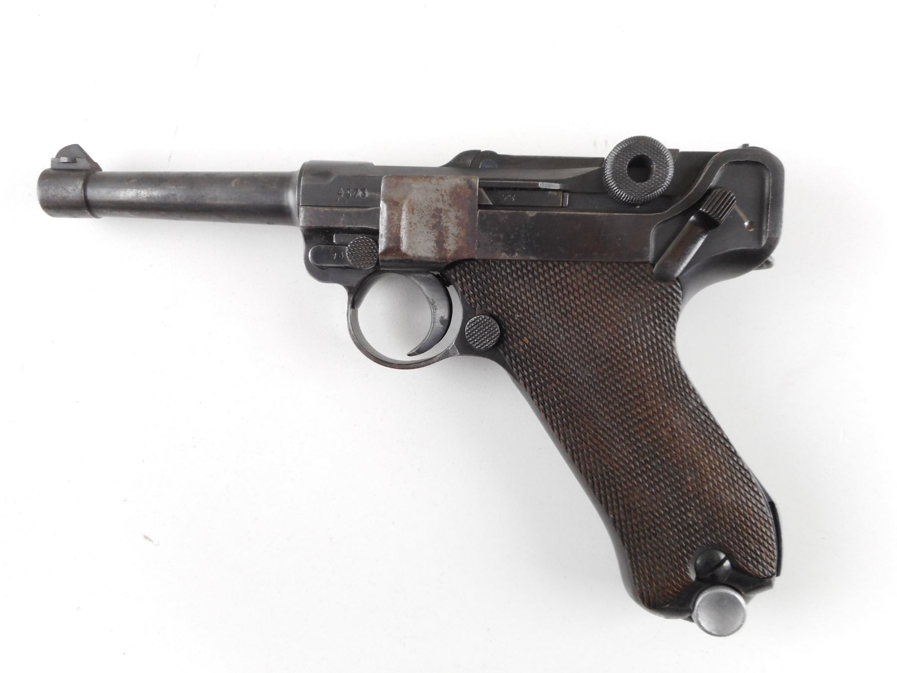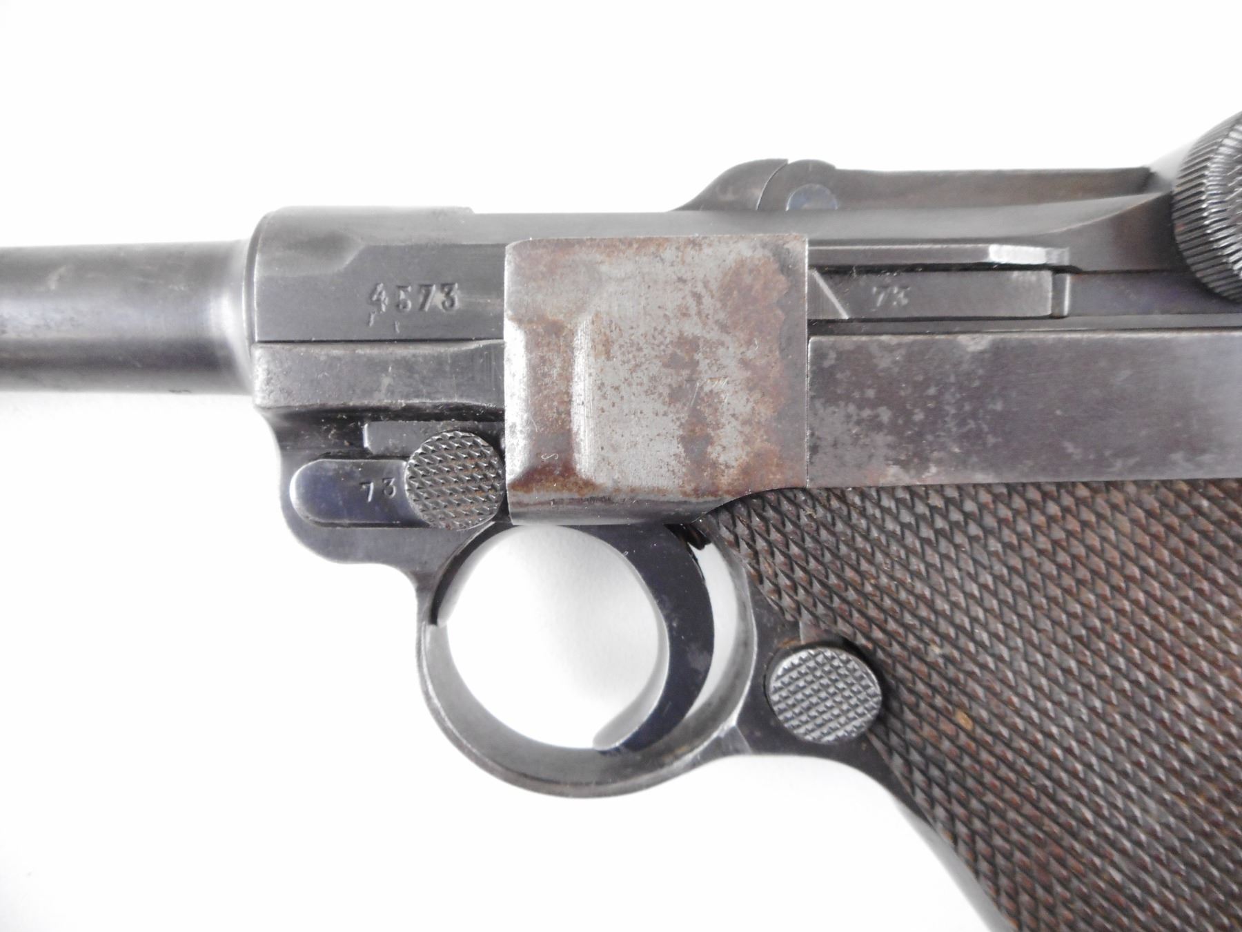 LUGER , MODEL: P08 , CALIBER: 9MM LUGER , COMES WITH MATCHING BY SERIAL # MAGAZINE. G DATE. ALL VISIBLE PARTS ARE MATCHING INCLUDING THE MAGAZINE. NUMEROUS IMPERIAL GERMAN MARKINGS. GOOD BORE. BLADE FRONT AND RAISED NOTCH REAR SIGHTS. CHECKERED BROWN WOOD GRIP PANELS. SHOWS SOME HANDLING MARKS. ACTION: SEMI-AUTOMATIC HANDGUN , BARREL LENGTH: 102MM , SERIAL # 4573 , CONDITION: 6/10 , CLASS: CANADIAN PROHIBITED CLASS , THIS ITEM WILL NOT BE SOLD IN LOT ORDER. THE PROHIBITED ITEMS WILL BE SOLD AFTER THE DEACTIVATED CLASS 5000 SERIES AND BEFORE THE 3000 SERIES NON RESTRICTED. PLEASE SEE LOT 0C LOT LEGEND FOR FULL DETAILS