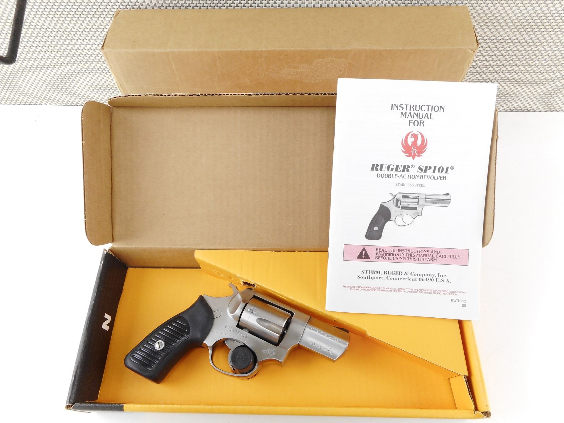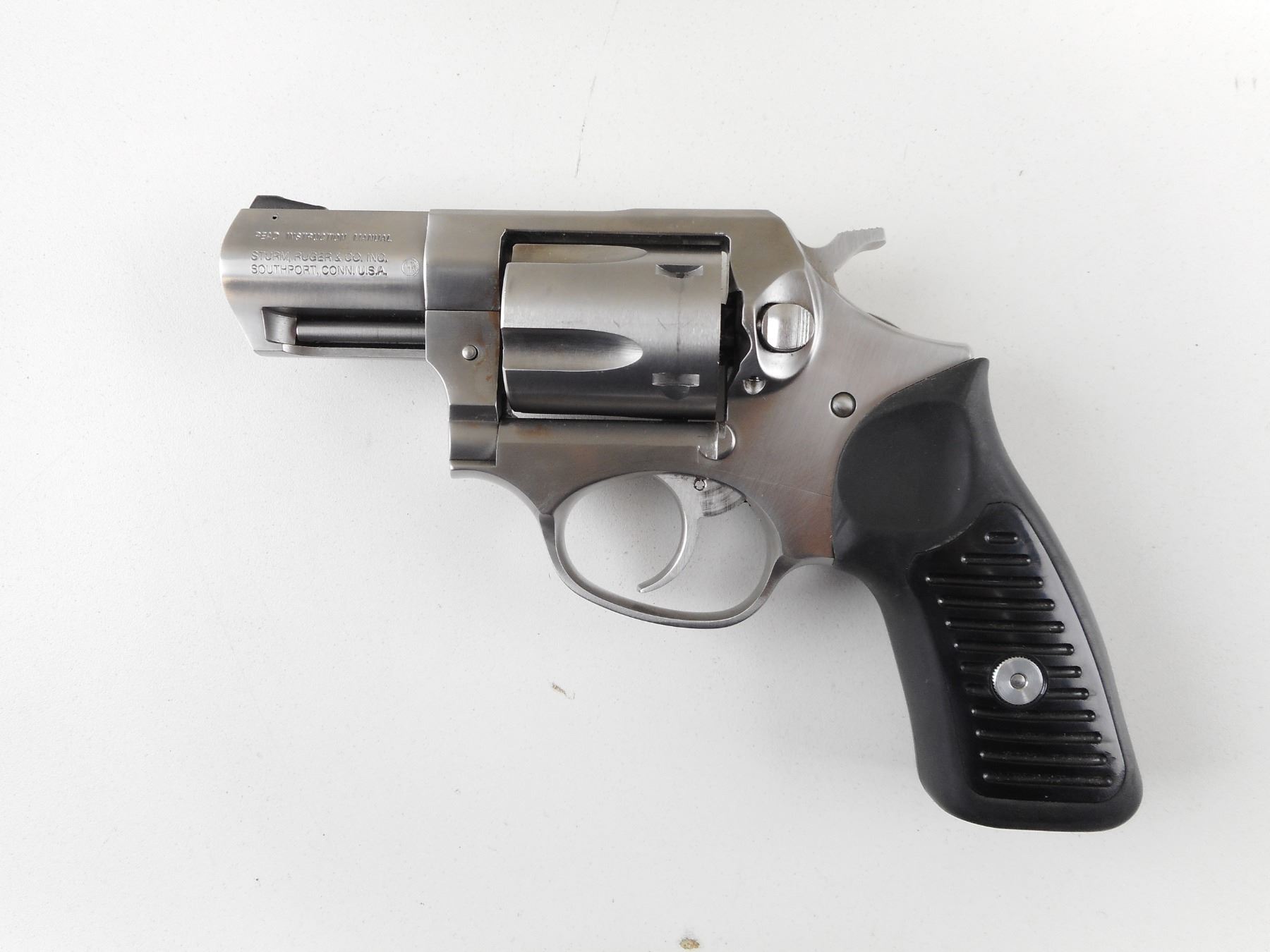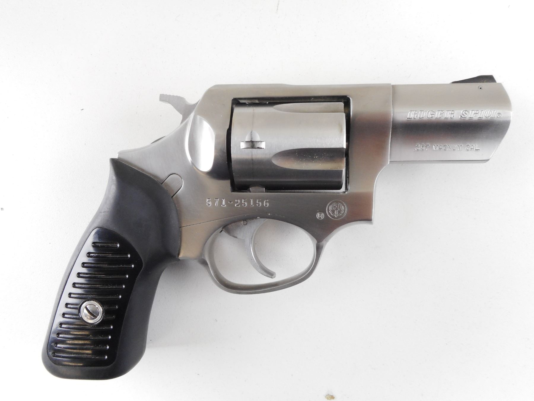 RUGER , MODEL: SP101 , CALIBER: 357 MAG , COMES WITH BOX. BORE IS EXCELLENT. 5 SHOT CAPACITY. HOLDS COCK, INDEXES WELL, ACTION IS TIGHT. RAMP FRONT AND NOTCH REAR SIGHT. TWO PIECE RUBBER GRIPS STAINLESS STEEL FINISH. SHOWS VERY LITTLE HANDLING MARKS. ACTION: REVOLVER , BARREL LENGTH: 57MM , SERIAL # 57125156 , CONDITION: 8/10 , CLASS: CANADIAN PROHIBITED CLASS , THIS ITEM WILL NOT BE SOLD IN LOT ORDER. THE PROHIBITED ITEMS WILL BE SOLD AFTER THE DEACTIVATED CLASS 5000 SERIES AND BEFORE THE 3000 SERIES NON RESTRICTED. PLEASE SEE LOT 0C LOT LEGEND FOR FULL DETAILS