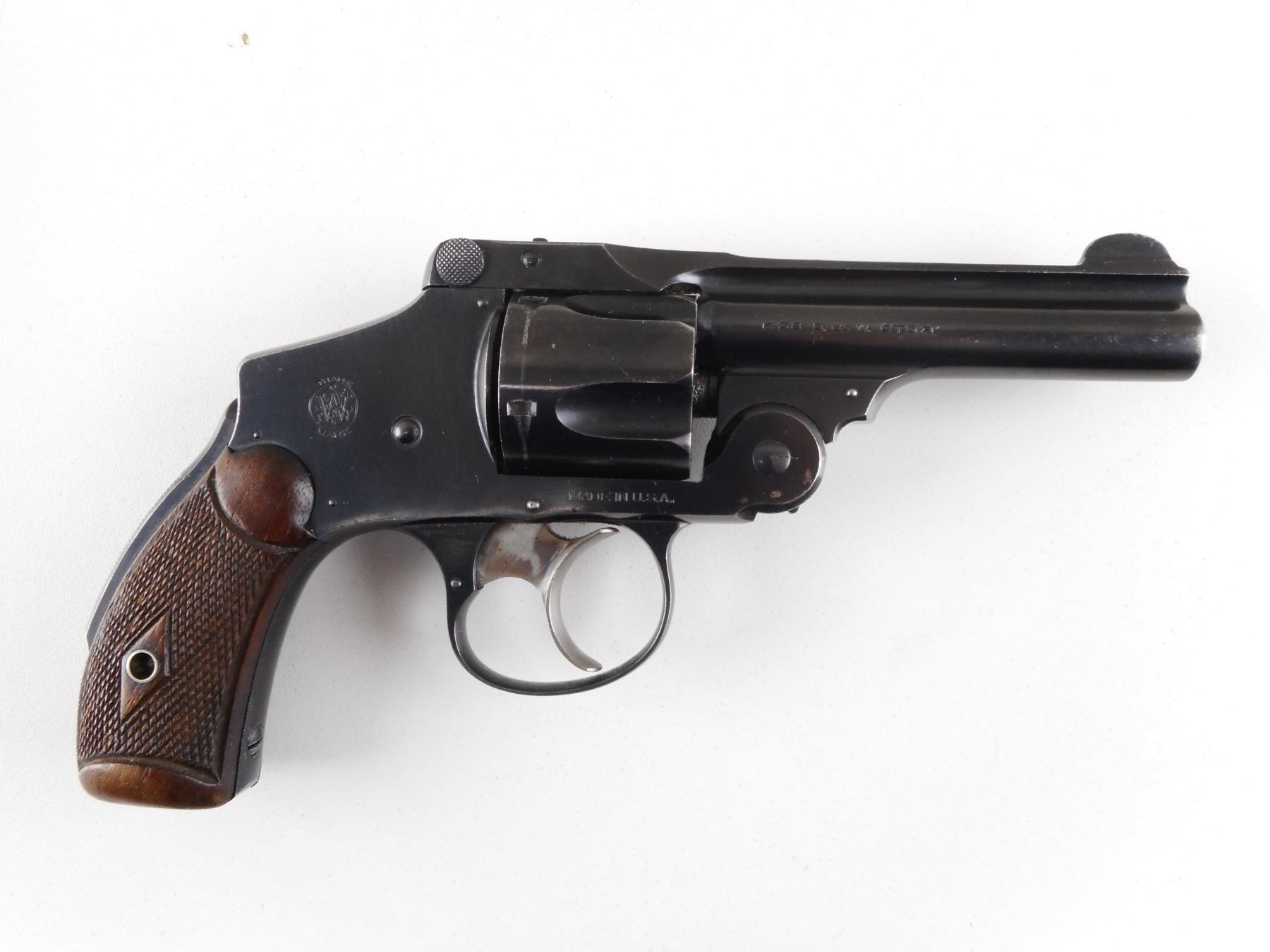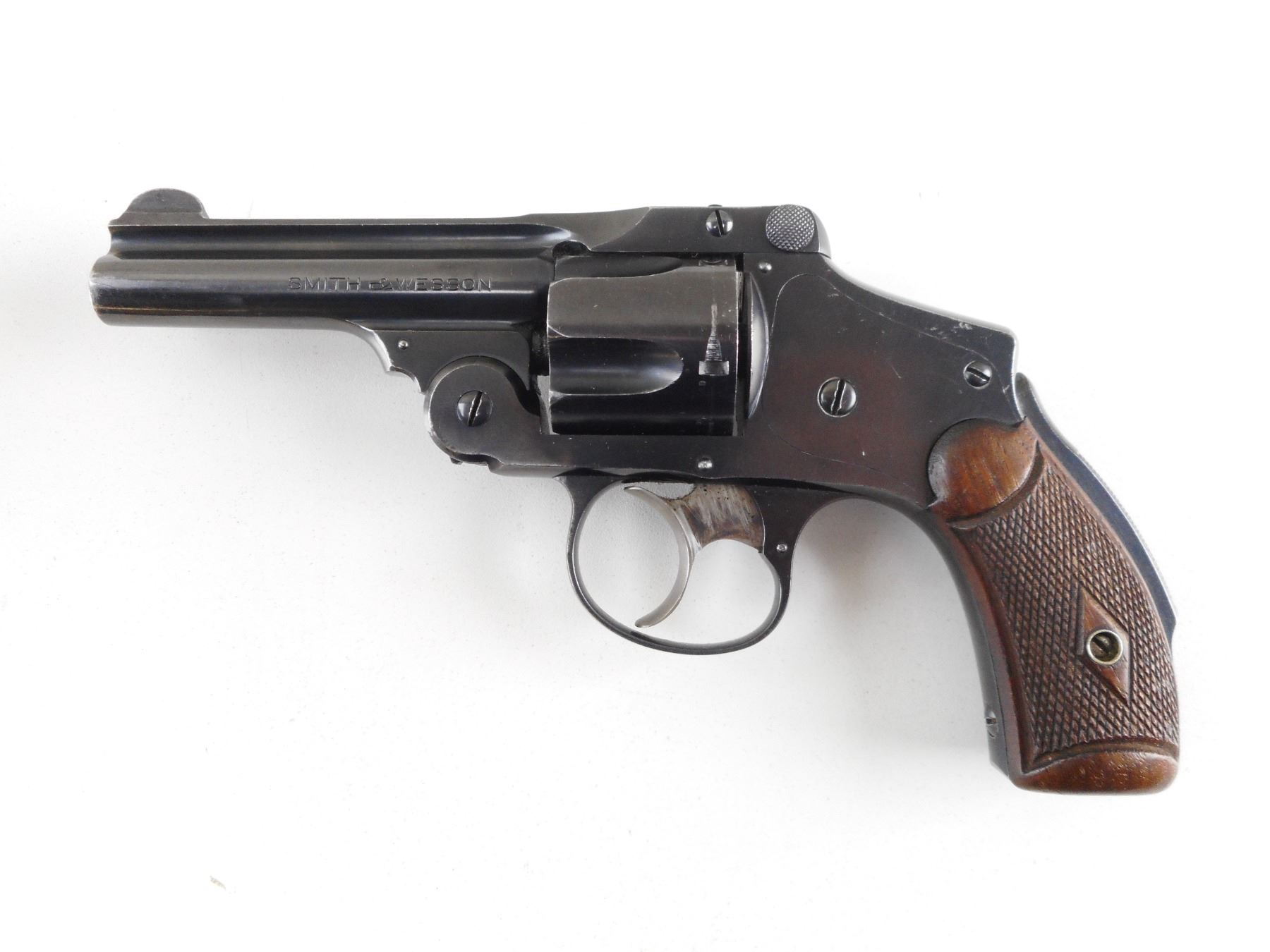 SMITH & WESSON , MODEL: TOP BREAK NO 2 SAFETY HAMMERLESS MODEL 5 AKA LEMON SQUEEZER , CALIBER: 38 S&W , 5 SHOT CAPACITY. BORE IS VERY GOOD. DOUBLE ACTION. INDEXES WELL. BLADE FRONT AND RAISED NOTCH REAR SIGHT. CHECKERED TWO PIECE HARDWOOD GRIPS. SHOWS VERY LITTLE HANDLING MARKS. ACTION: REVOLVER , BARREL LENGTH: 83MM , SERIAL # 254770 , CONDITION: 8/10 , CLASS: CANADIAN PROHIBITED CLASS , THIS ITEM WILL NOT BE SOLD IN LOT ORDER. THE PROHIBITED ITEMS WILL BE SOLD AFTER THE DEACTIVATED CLASS 5000 SERIES AND BEFORE THE 3000 SERIES NON RESTRICTED. PLEASE SEE LOT 0C LOT LEGEND FOR FULL DETAILS
