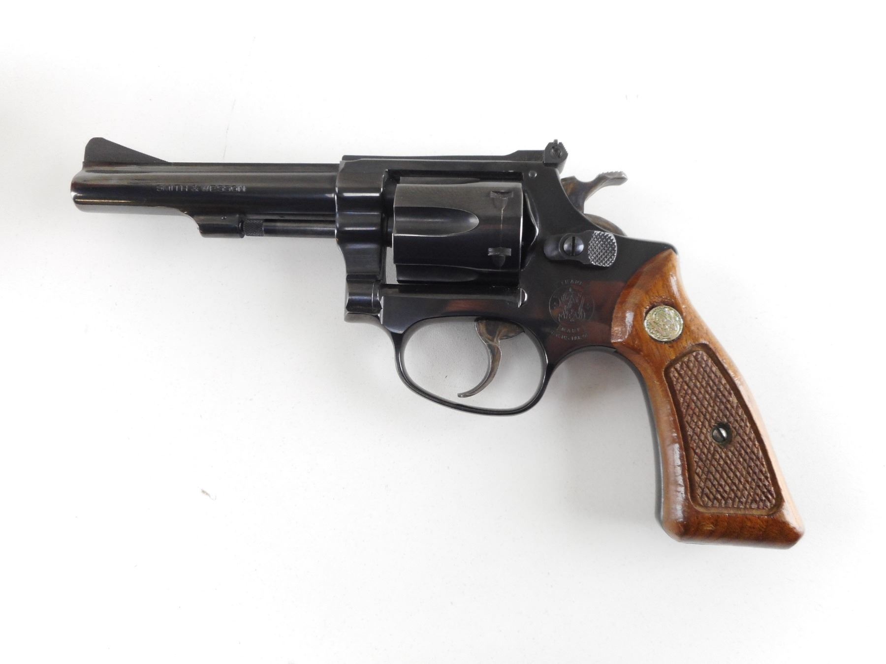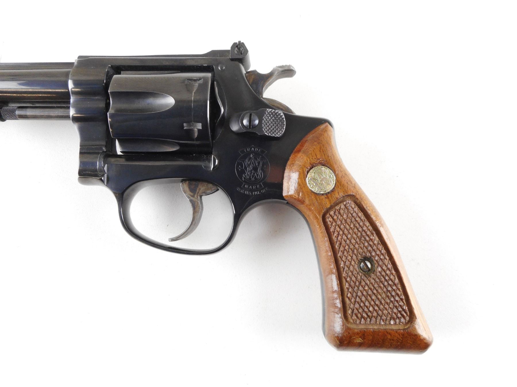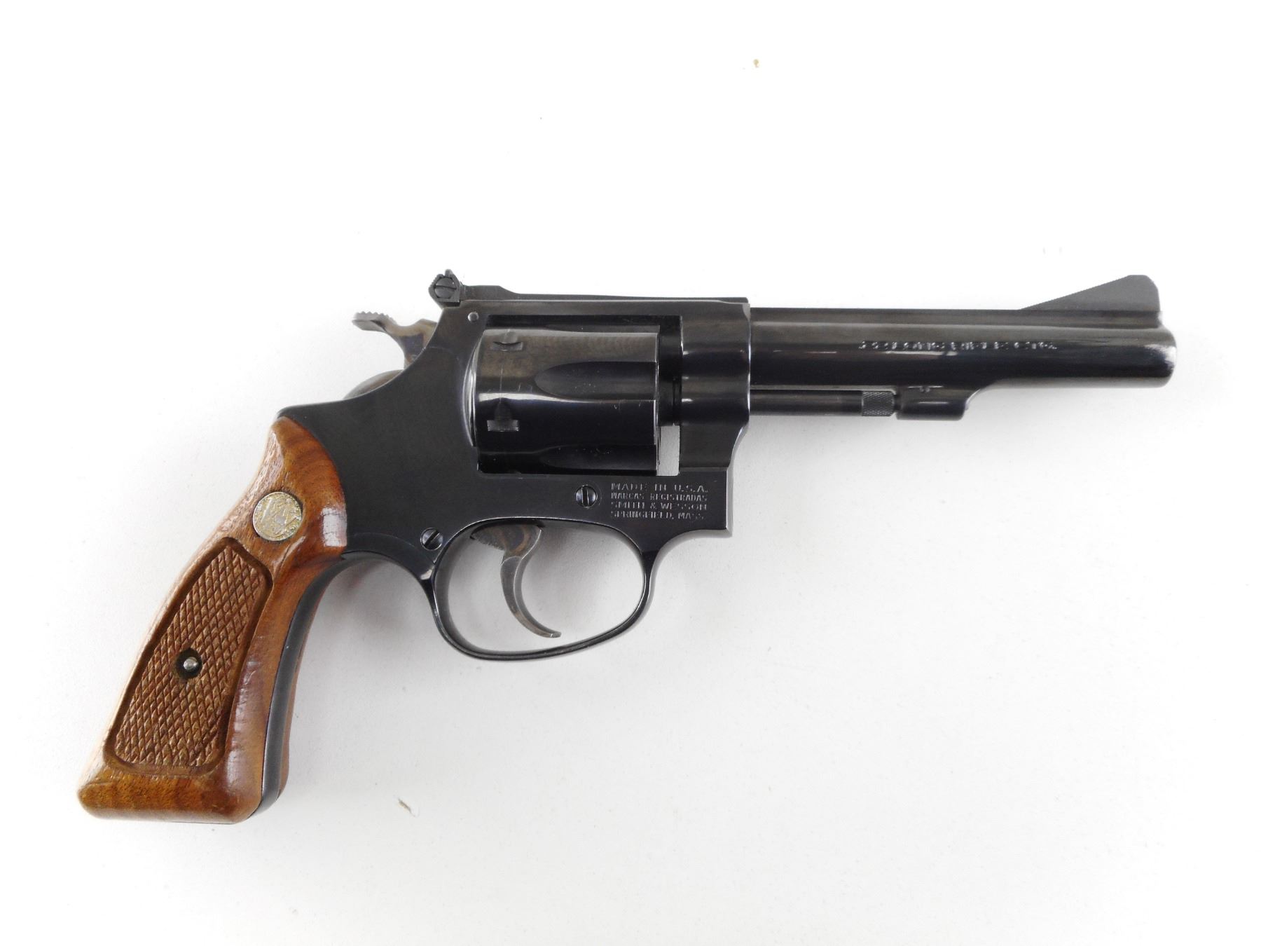 SMITH & WESSON , MODEL: 34-1 , CALIBER: 22 LR , 6 SHOT CAPACITY. BORE IS GOOD. HOLDS COCK, INDEXES WELL, ACTION IS TIGHT. RAMP FRONT AND ADJUSTABLE REAR SIGHT. CHECKERED TWO PIECE WOOD GRIPS WITH S&W LOGO. SHOWS VERY LITTLE HANDLING MARKS. ACTION: REVOLVER , BARREL LENGTH: 102MM , SERIAL # M222429 , CONDITION: 8/10 , CLASS: CANADIAN PROHIBITED CLASS , THIS ITEM WILL NOT BE SOLD IN LOT ORDER. THE PROHIBITED ITEMS WILL BE SOLD AFTER THE DEACTIVATED CLASS 5000 SERIES AND BEFORE THE 3000 SERIES NON RESTRICTED. PLEASE SEE LOT 0C LOT LEGEND FOR FULL DETAILS