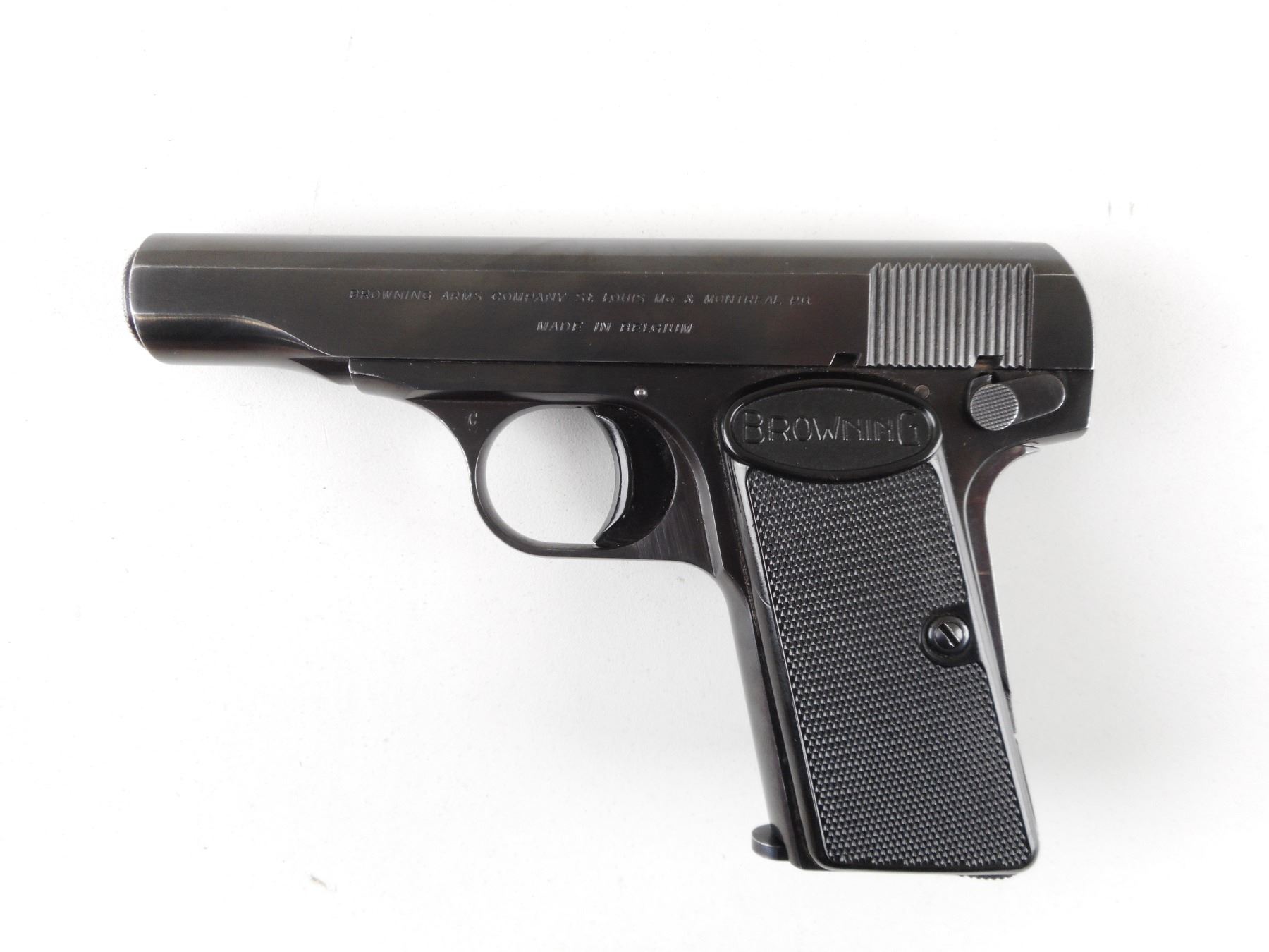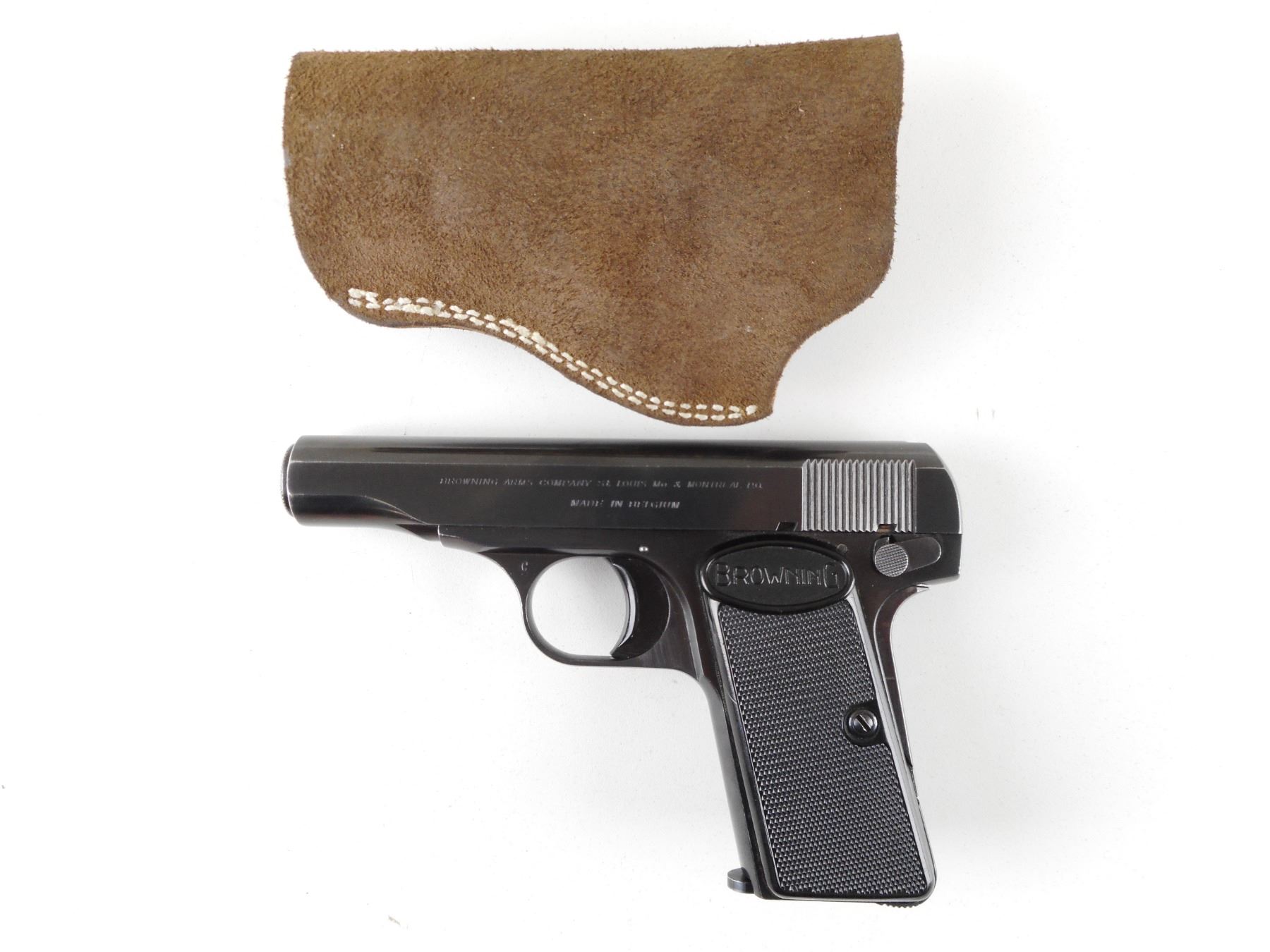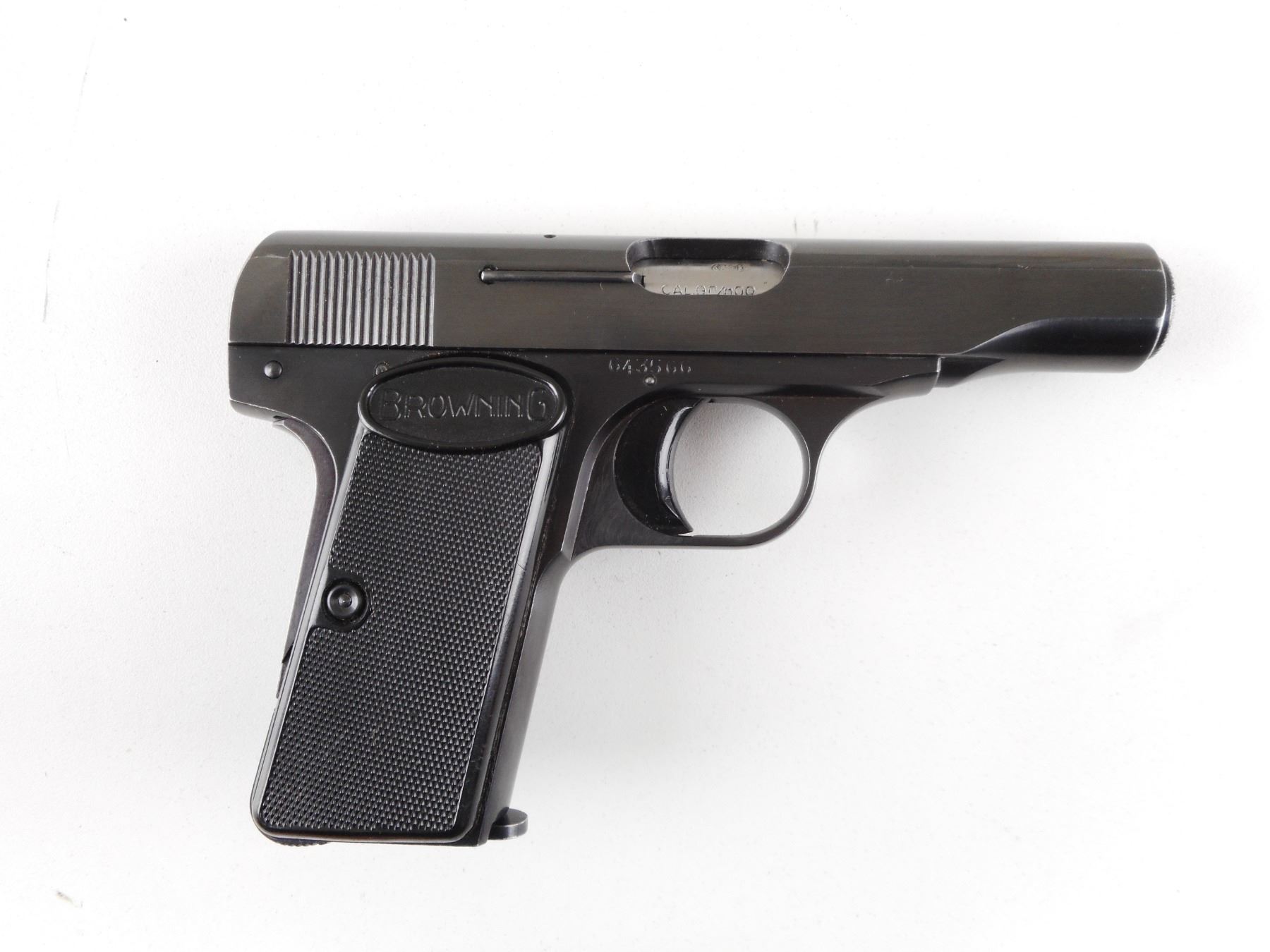 BROWNING , MODEL: 1955 , CALIBER: 9MM BROWNING SHORT , COMES WITH SUEDE HOLSTER AND MAGAZINE. BORE IS VERY GOOD. BLADE FRONT AND NOTCH REAR SIGHT. TWO PIECE CHECKERED GRIPS WITH BROWNING LOGO. GRIP SAFETY. SHOWS VERY LITTLE HANDLING MARKS. A RESTRICTED BARREL CAN BE PURCHASED FOR THIS FIREARM AS LOT 22084 IN SESSION 2.ACTION: SEMI-AUTOMATIC HANDGUN , BARREL LENGTH: 87MM , SERIAL # 643566 , CONDITION: 8/10 , CLASS: CANADIAN PROHIBITED CLASS , THIS ITEM WILL NOT BE SOLD IN LOT ORDER. THE PROHIBITED ITEMS WILL BE SOLD AFTER THE DEACTIVATED CLASS 5000 SERIES AND BEFORE THE 3000 SERIES NON RESTRICTED. PLEASE SEE LOT 0C LOT LEGEND FOR FULL DETAILS