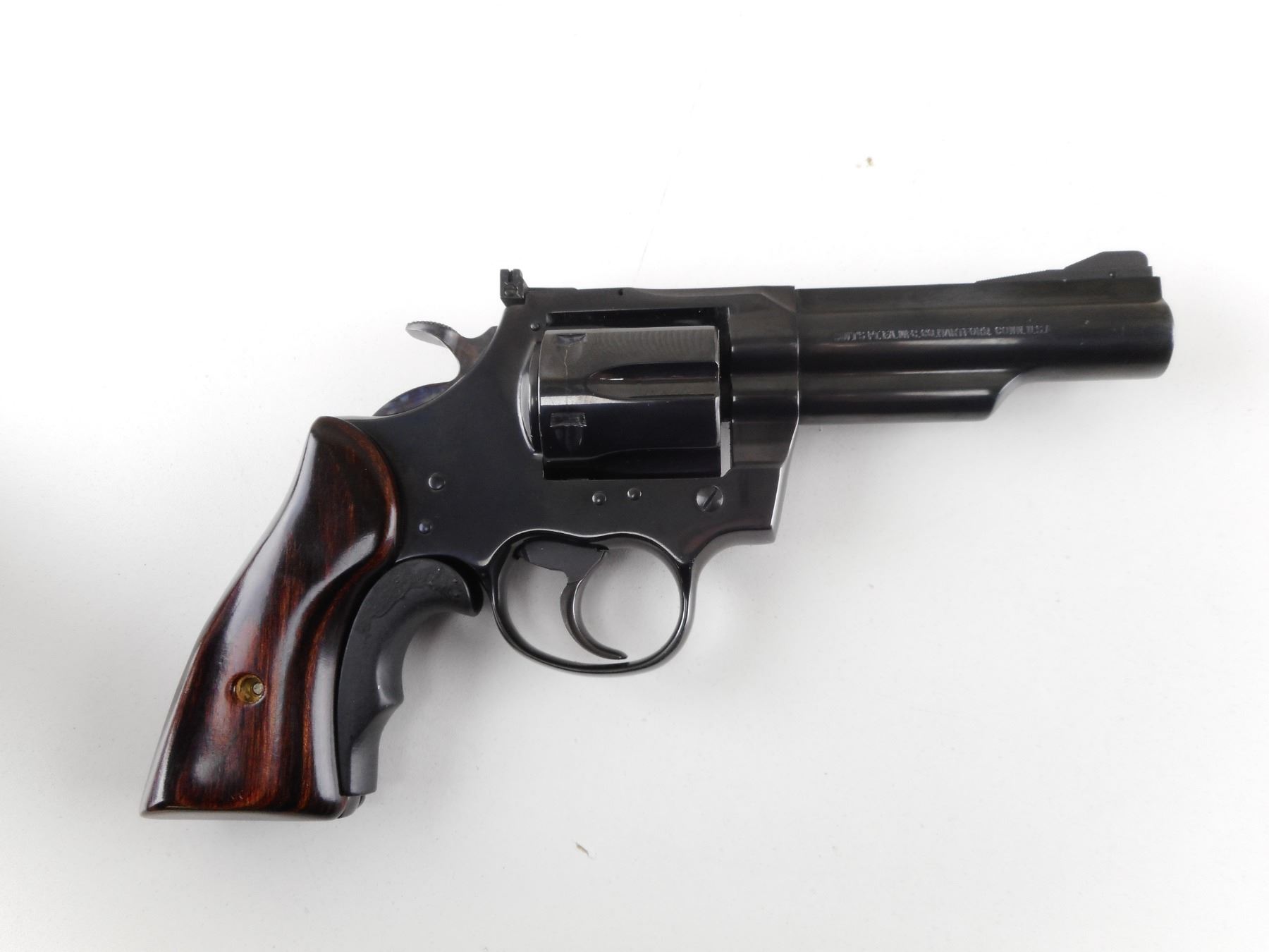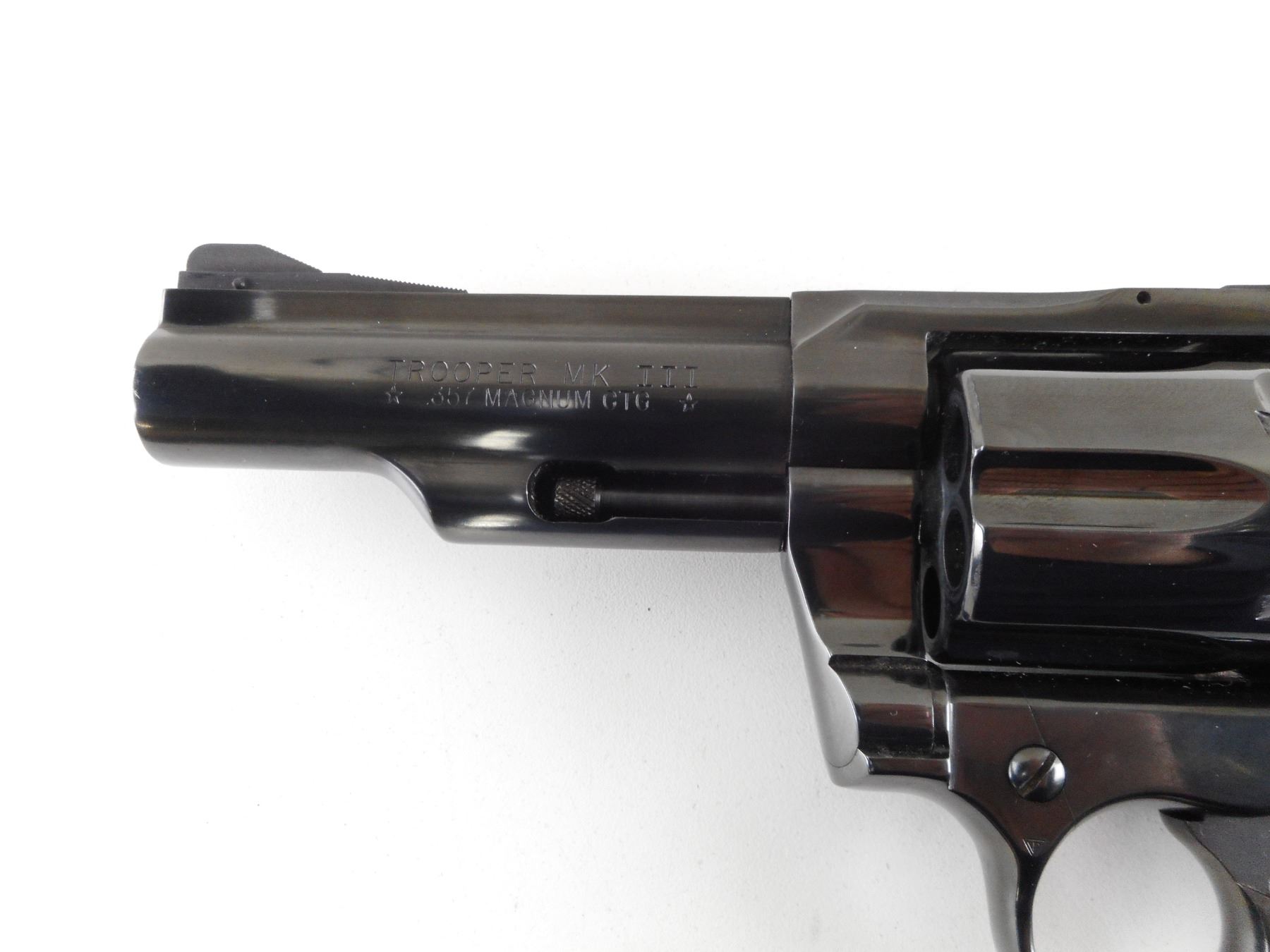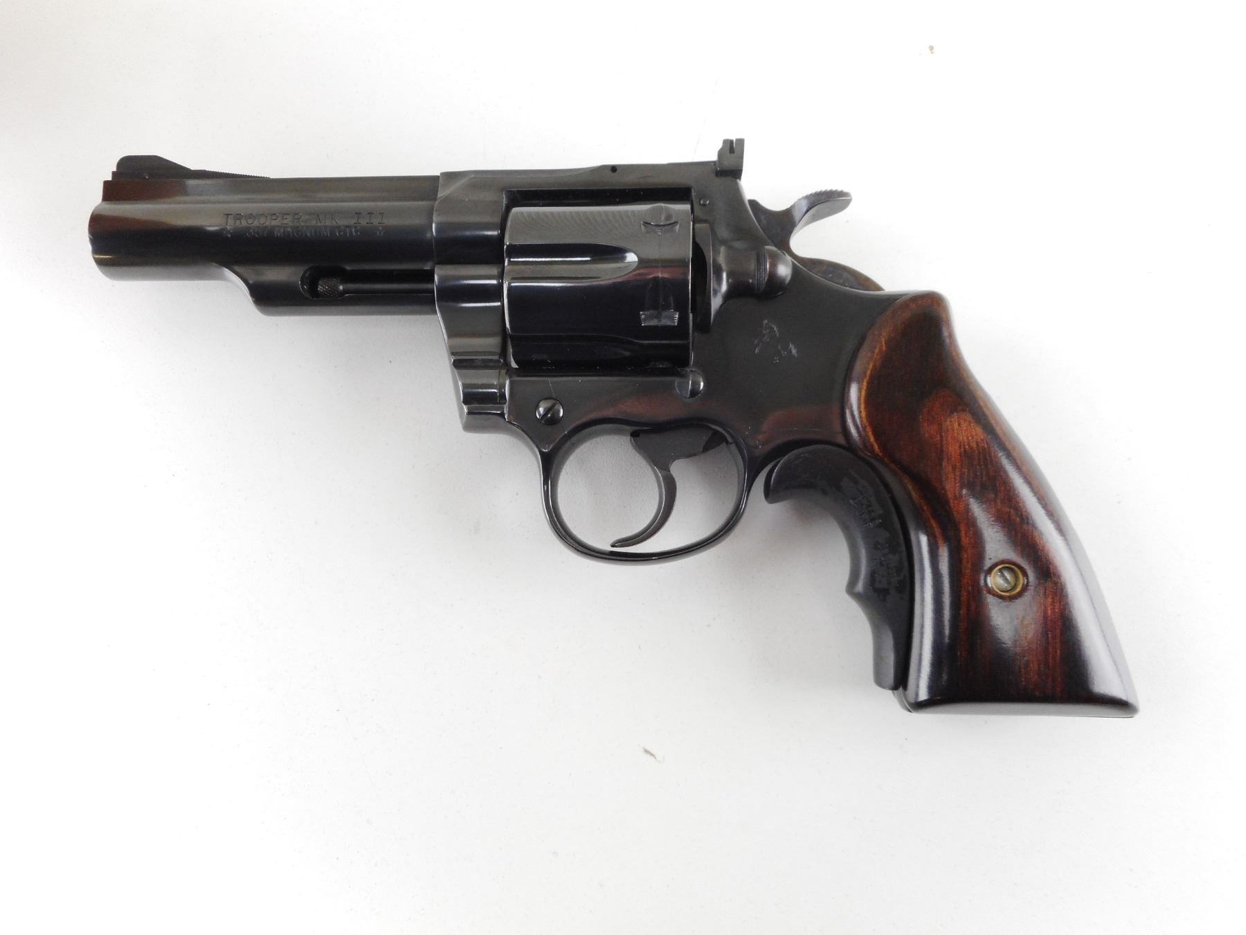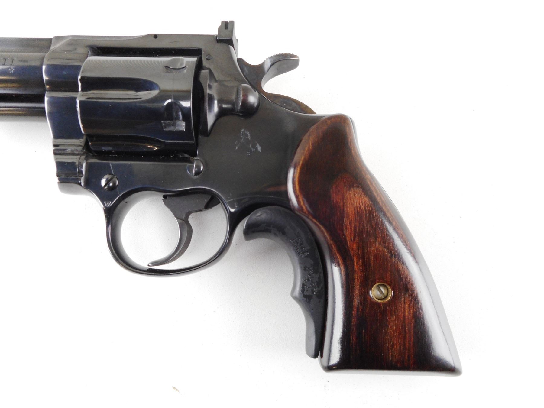 COLT , MODEL: TROOP MARK III , CALIBER: 357 MAG , 6 SHOT CAPACITY. BORE IS EXCELLENT. BLUED FINISH. BLADE FRONT SIGHT. ADJUSTABLE U NOTCH REAR SIGHT. SMOOTH BROWN LAMINATED GRIPS. HAS A ADDED ON FINGER REST. HOLDS COCK, INDEXES WELL, ACTION IS TIGHT. SHOWS SLIGHT HANDLING MARKS AND WEAR. ACTION: REVOLVER , BARREL LENGTH: 100MM , SERIAL # 22293J , CONDITION: 9/10 , CLASS: CANADIAN PROHIBITED CLASS , THIS ITEM WILL NOT BE SOLD IN LOT ORDER. THE PROHIBITED ITEMS WILL BE SOLD AFTER THE DEACTIVATED CLASS 5000 SERIES AND BEFORE THE 3000 SERIES NON RESTRICTED. PLEASE SEE LOT 0C LOT LEGEND FOR FULL DETAILS
