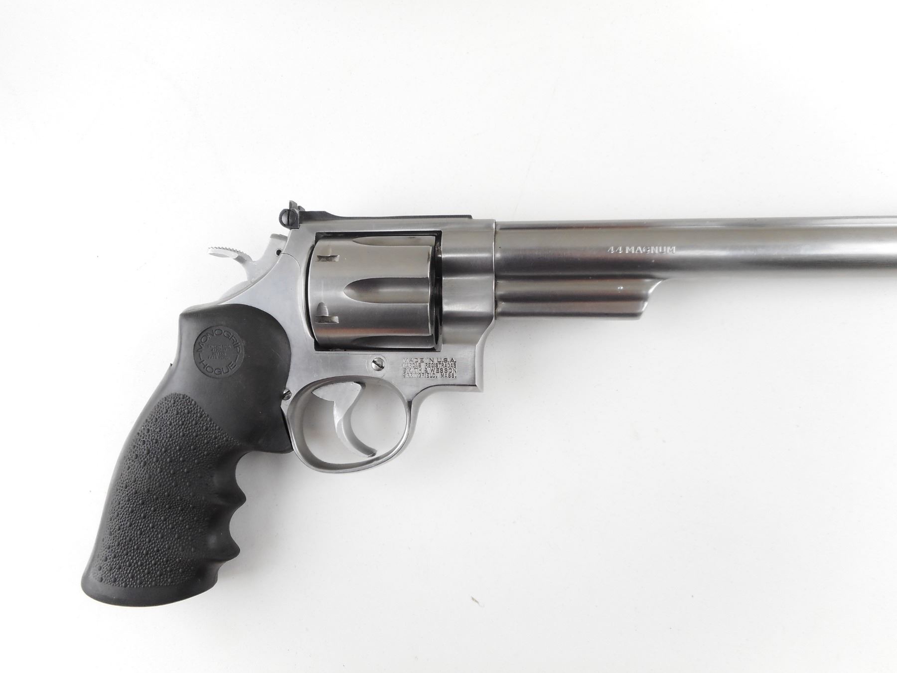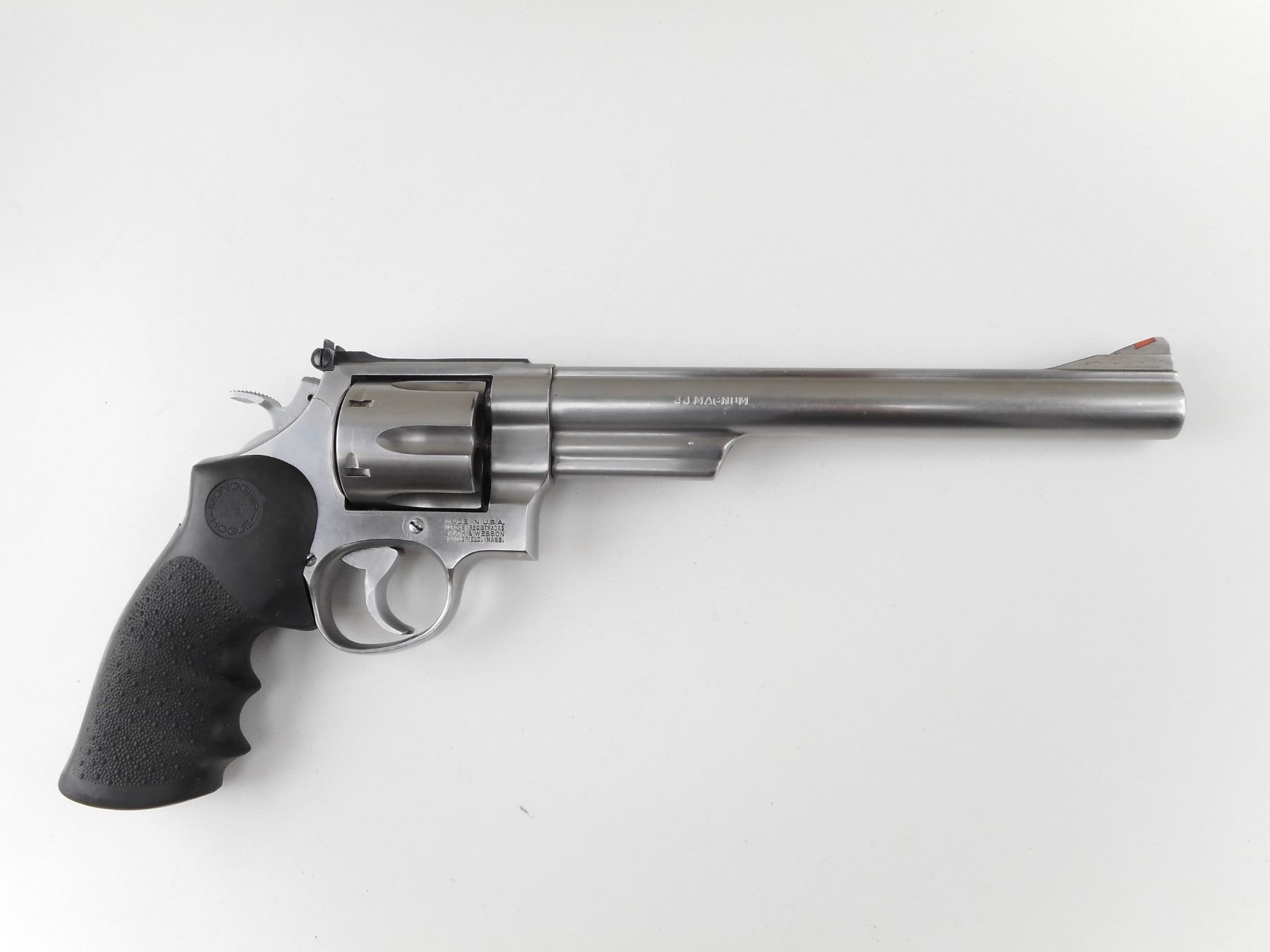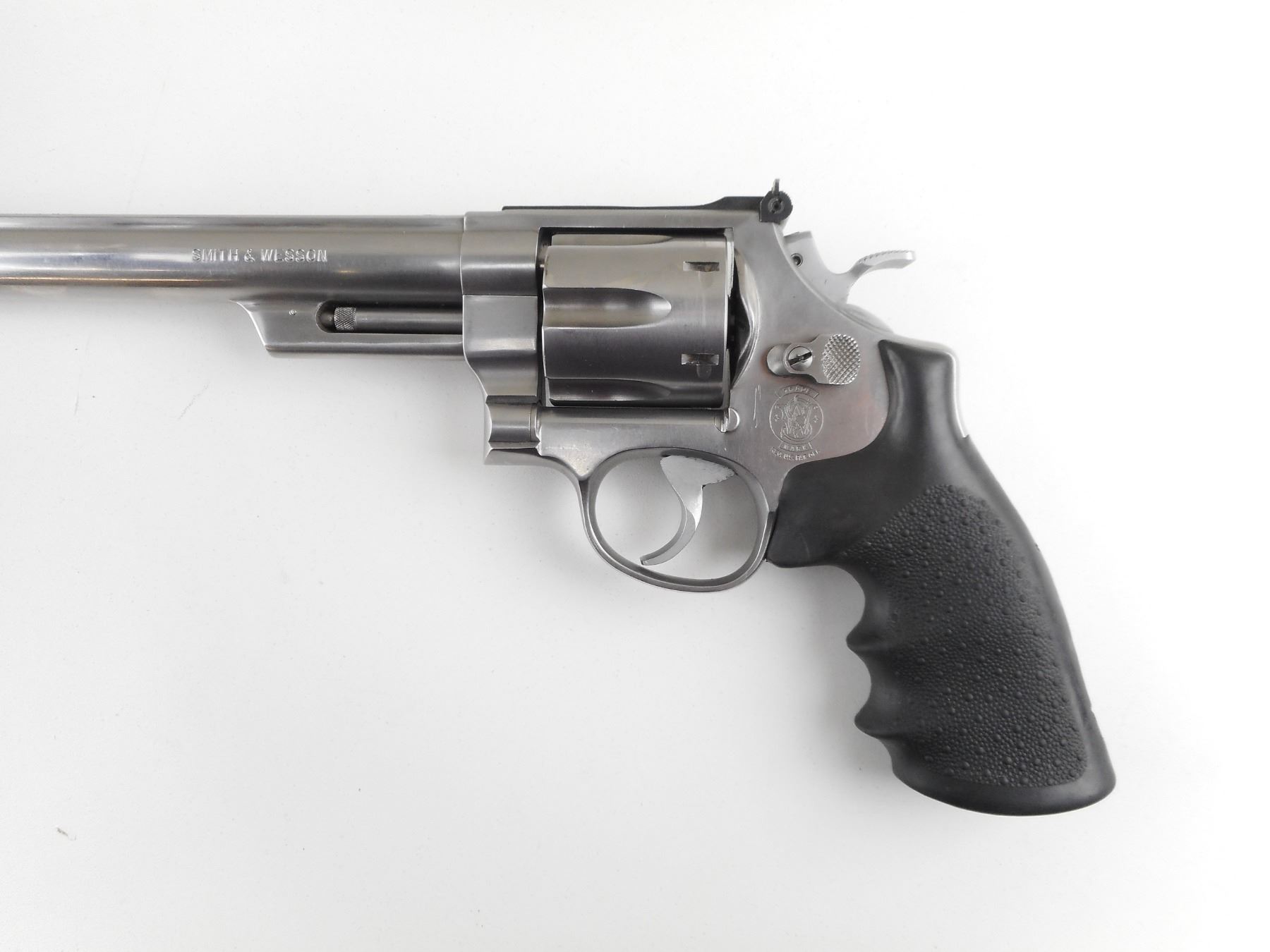 SMITH & WESSON , MODEL: 629-3 , CALIBER: 44 MAG , COMES WITH BOX. BORE IS EXCELLENT. HOLDS COCK, INDEXES WELL, ACTION IS TIGHT. BLADE FRONT SIGHT WITH ORANGE INSERT. ADJUSTABLE REAR SIGHT. HOGUE MONO GRIPS. SHOWS VERY LITTLE HANDLING MARKS. ACTION: REVOLVER , BARREL LENGTH: 213MM , SERIAL # BFT9248 , CONDITION: 8/10 , CLASS: CANADIAN RESTRICTED CLASS