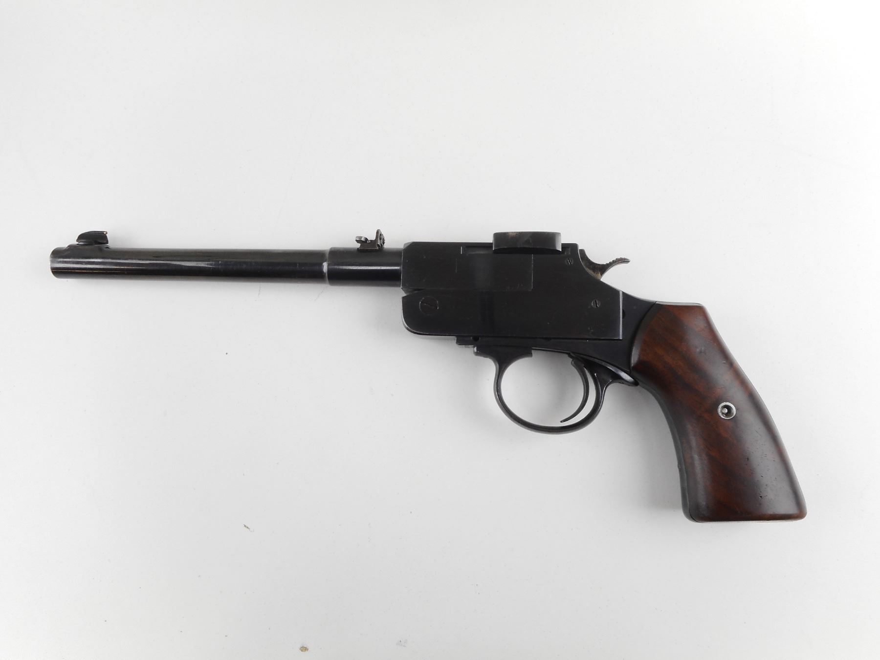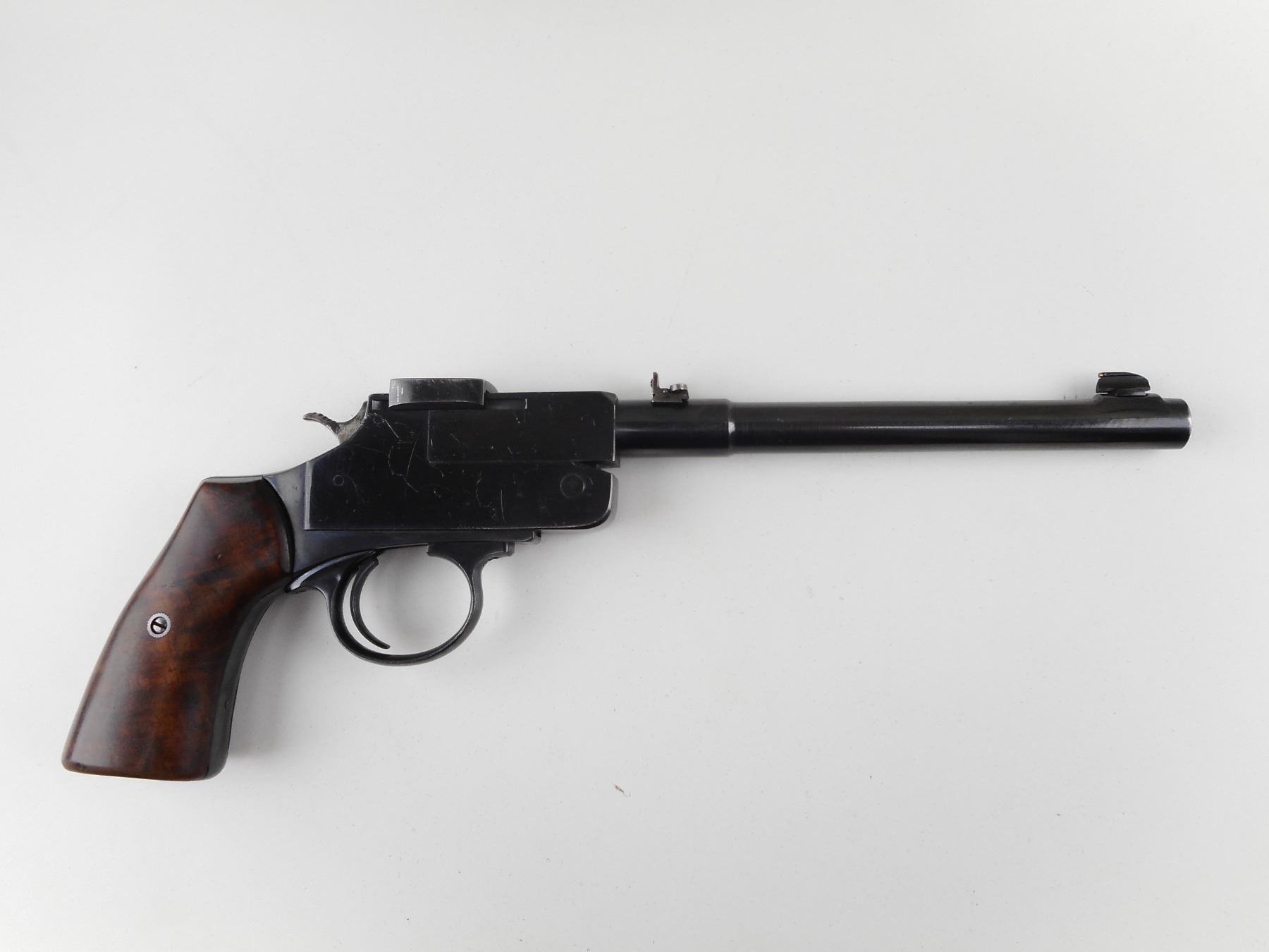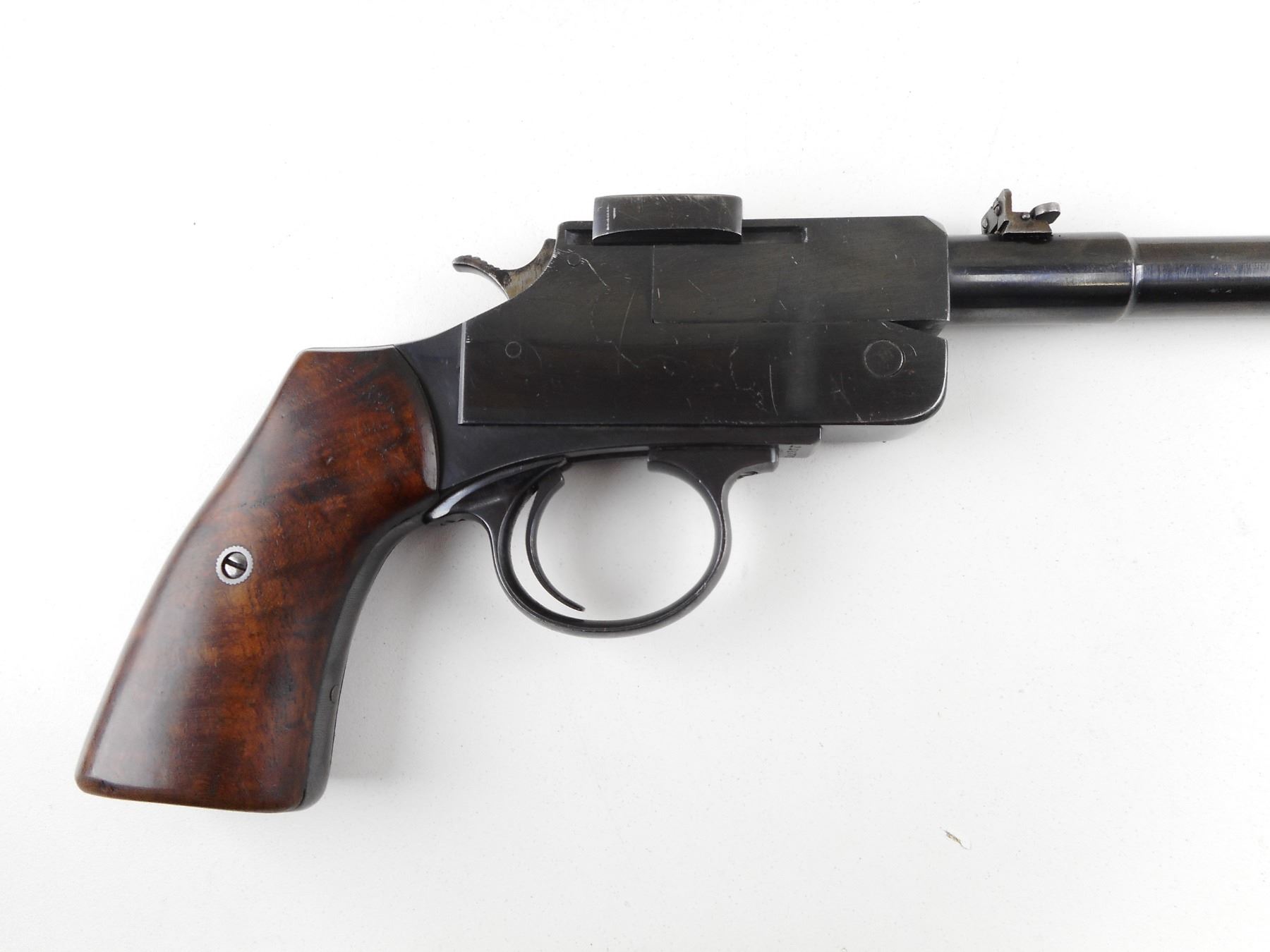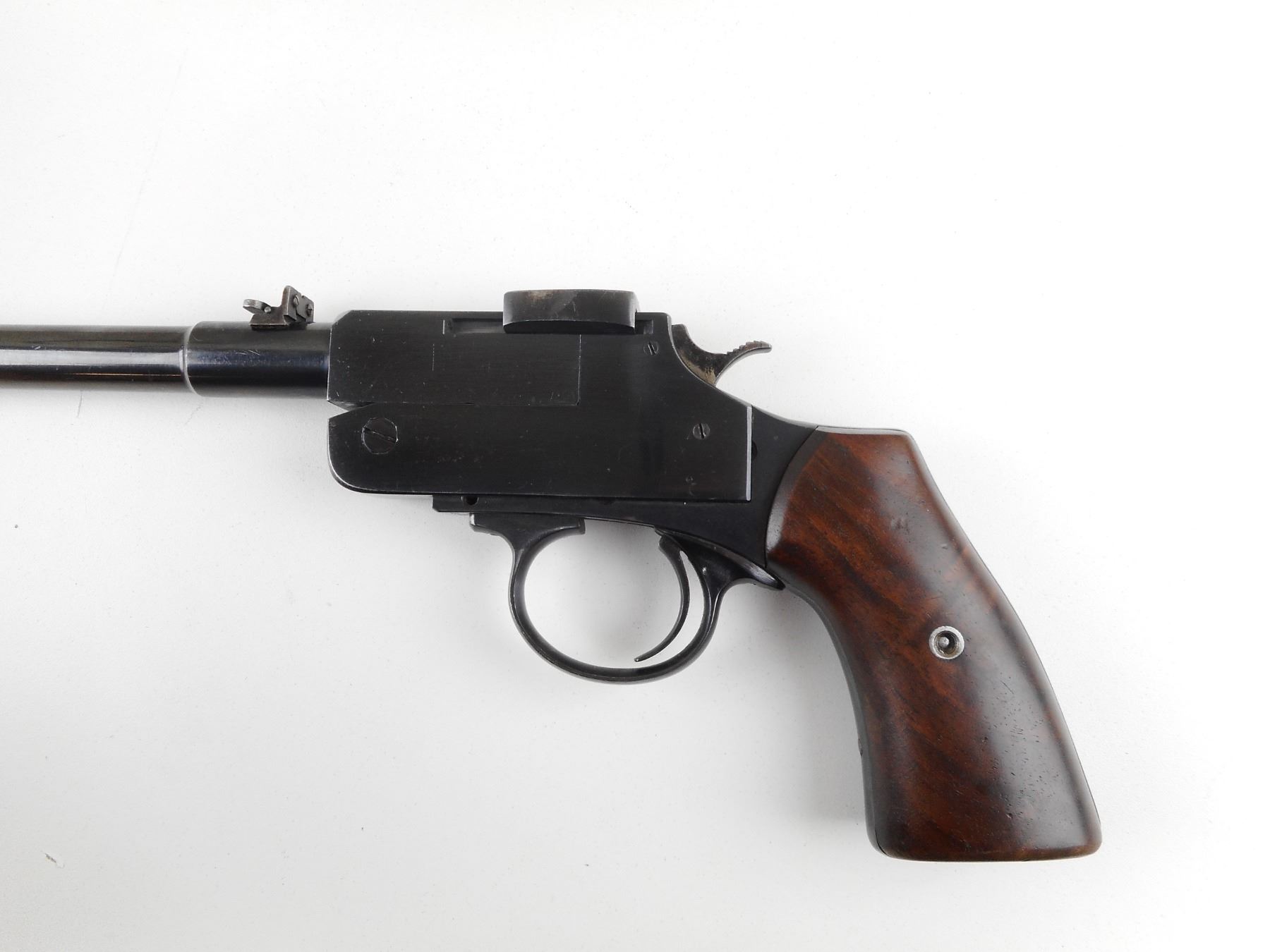 UNKNOWN , MODEL: TOP BREAK , CALIBER: 22 HORNET , MADE BY N. HAMM. BORE IS EXCELLENT. BLADE FRONT AND FLIP ADJUSTABLE REAR SIGHT. TWO PIECE HARDWOOD GRIPS. SHOWS SOME HANDLING MARKS. ACTION: SINGLE SHOT , BARREL LENGTH: 235MM , SERIAL # 238770 , CONDITION: 7/10 , CLASS: CANADIAN RESTRICTED CLASS