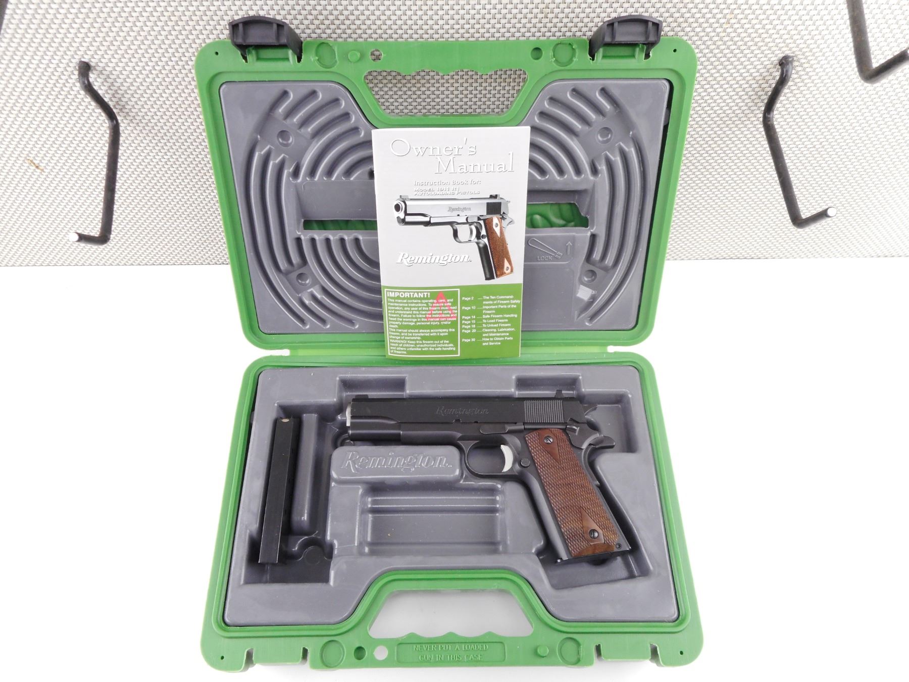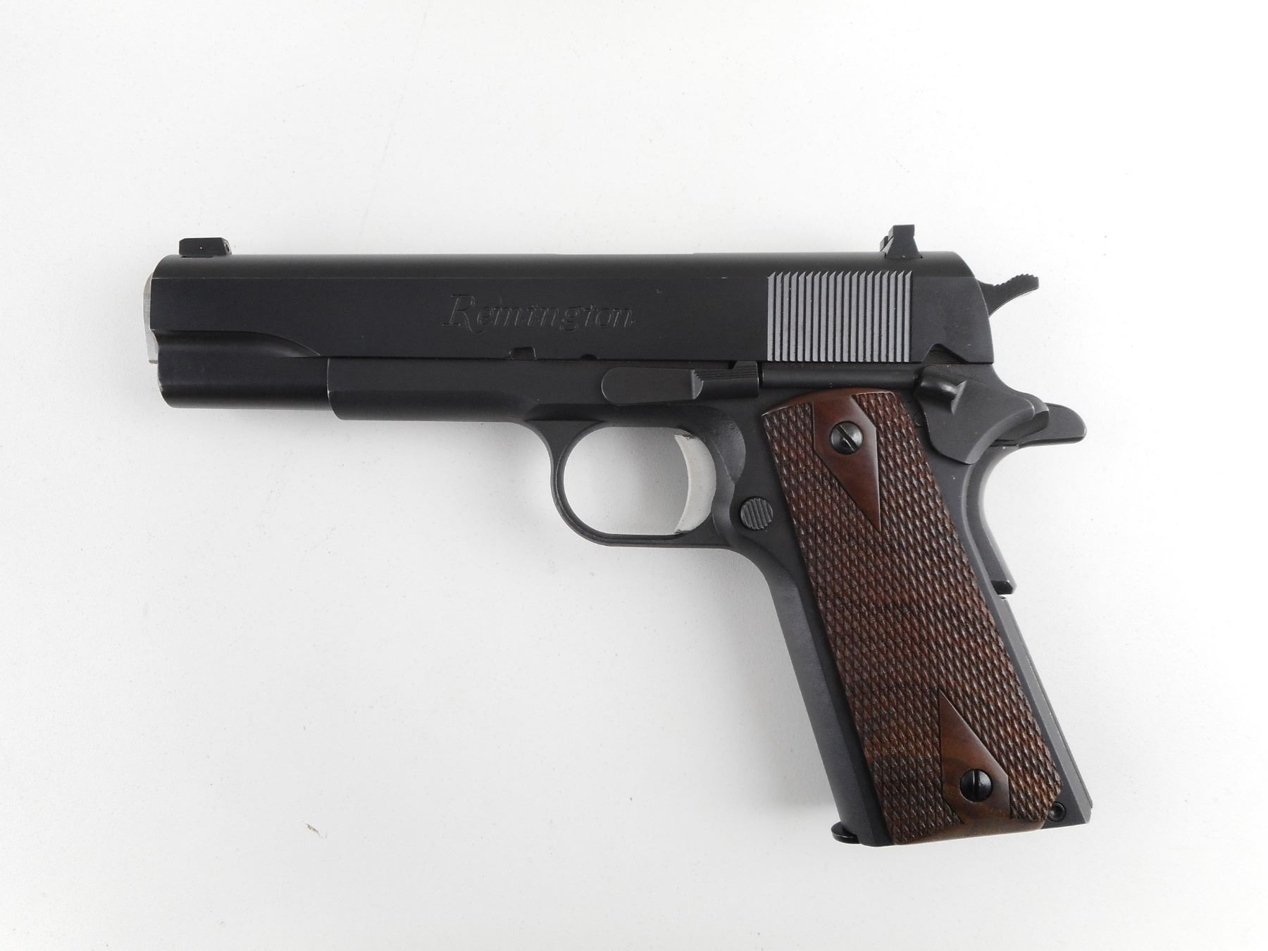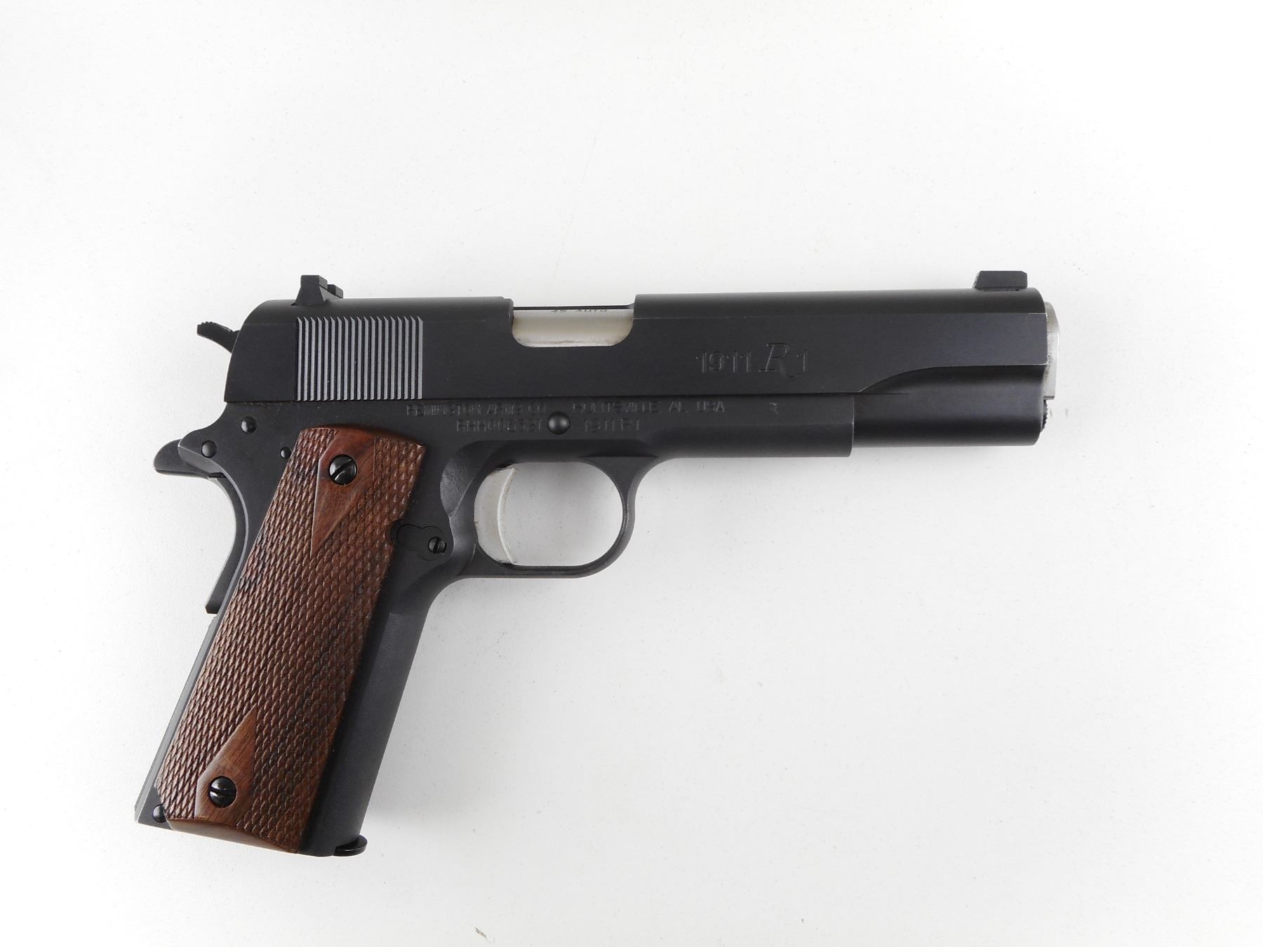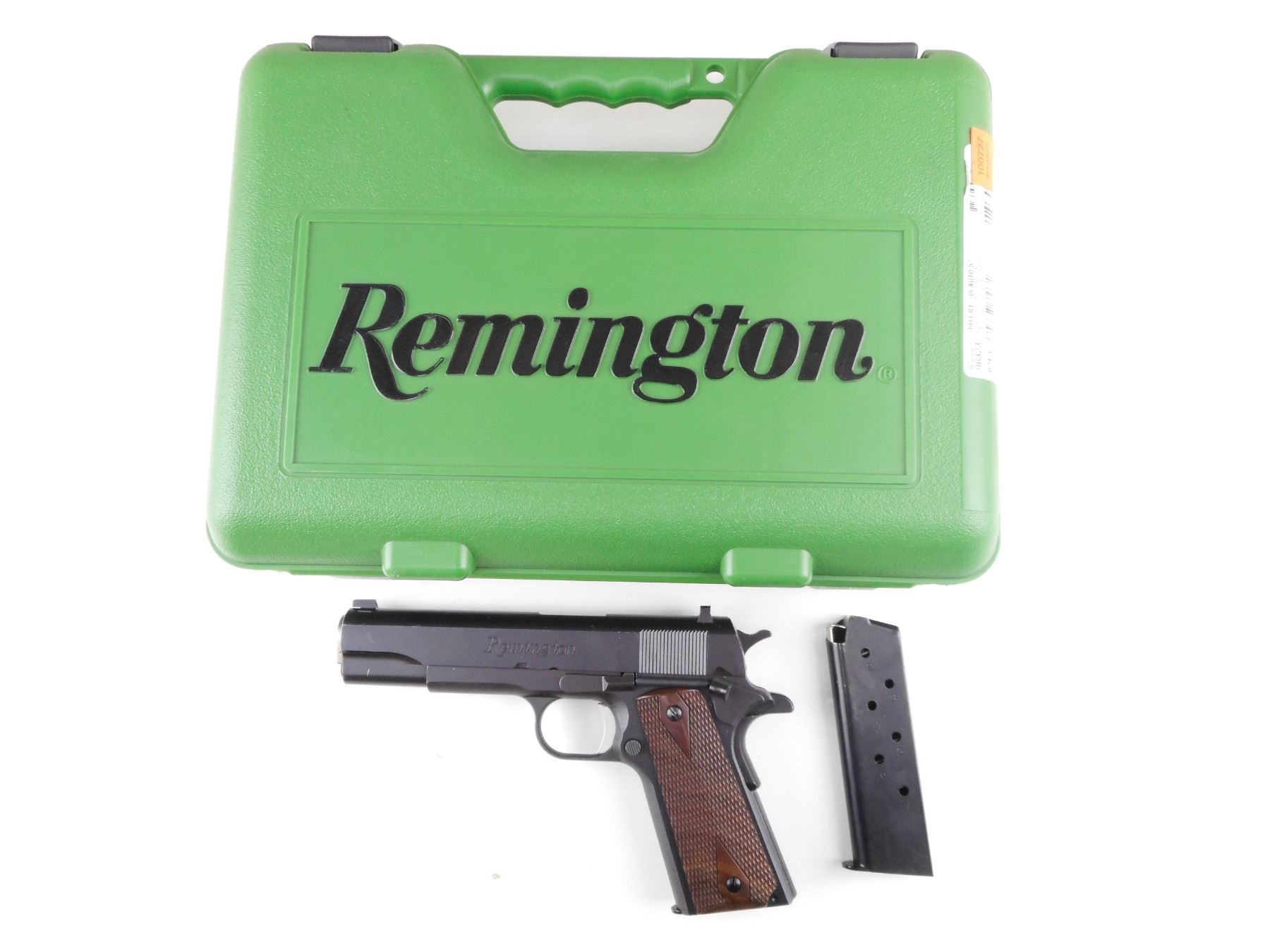 REMINGTON , MODEL: 1911 R1 , CALIBER: 45 ACP , COMES WITH CASE, MANUAL AND TWO MAGAZINES. BORE IS EXCELLENT. THREE DOT SIGHT SYSTEM. CHECKERED WOOD GRIP PANELS. SHOWS VERY LITTLE HANDLING MARKS. ACTION: SEMI-AUTOMATIC HANDGUN , BARREL LENGTH: 127MM , SERIAL # RHH006321 , CONDITION: 8/10 , CLASS: CANADIAN RESTRICTED CLASS