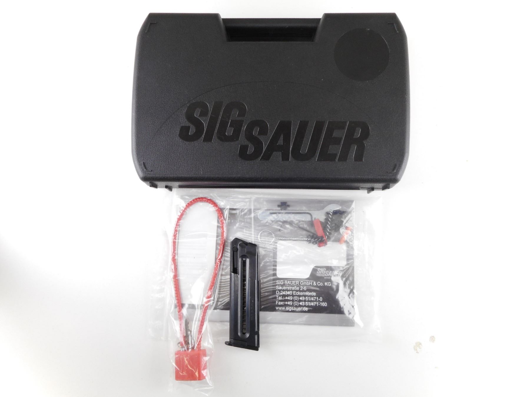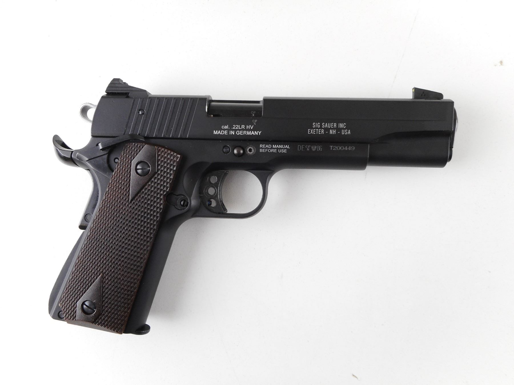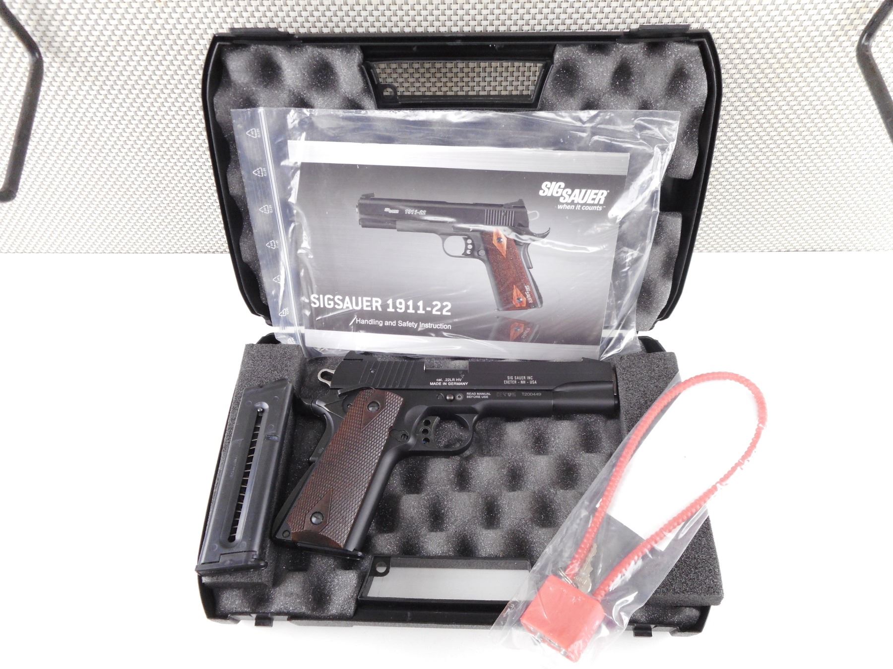 SIG SAUER , MODEL: 1911-22 , CALIBER: 22 LR , COMES WITH CASE, 2 MAGAZINES AND A CABLE LOCK. BORE IS EXCELLENT. GREEN THREE DOT SIGHT SYSTEM. CHECKERED BROWN PLASTIC GRIPS. SHOWS VERY LITTLE HANDLING MARKS. ACTION: SEMI-AUTOMATIC HANDGUN , BARREL LENGTH: 127MM , SERIAL # T200449 , CONDITION: 9/10 , CLASS: CANADIAN RESTRICTED CLASS